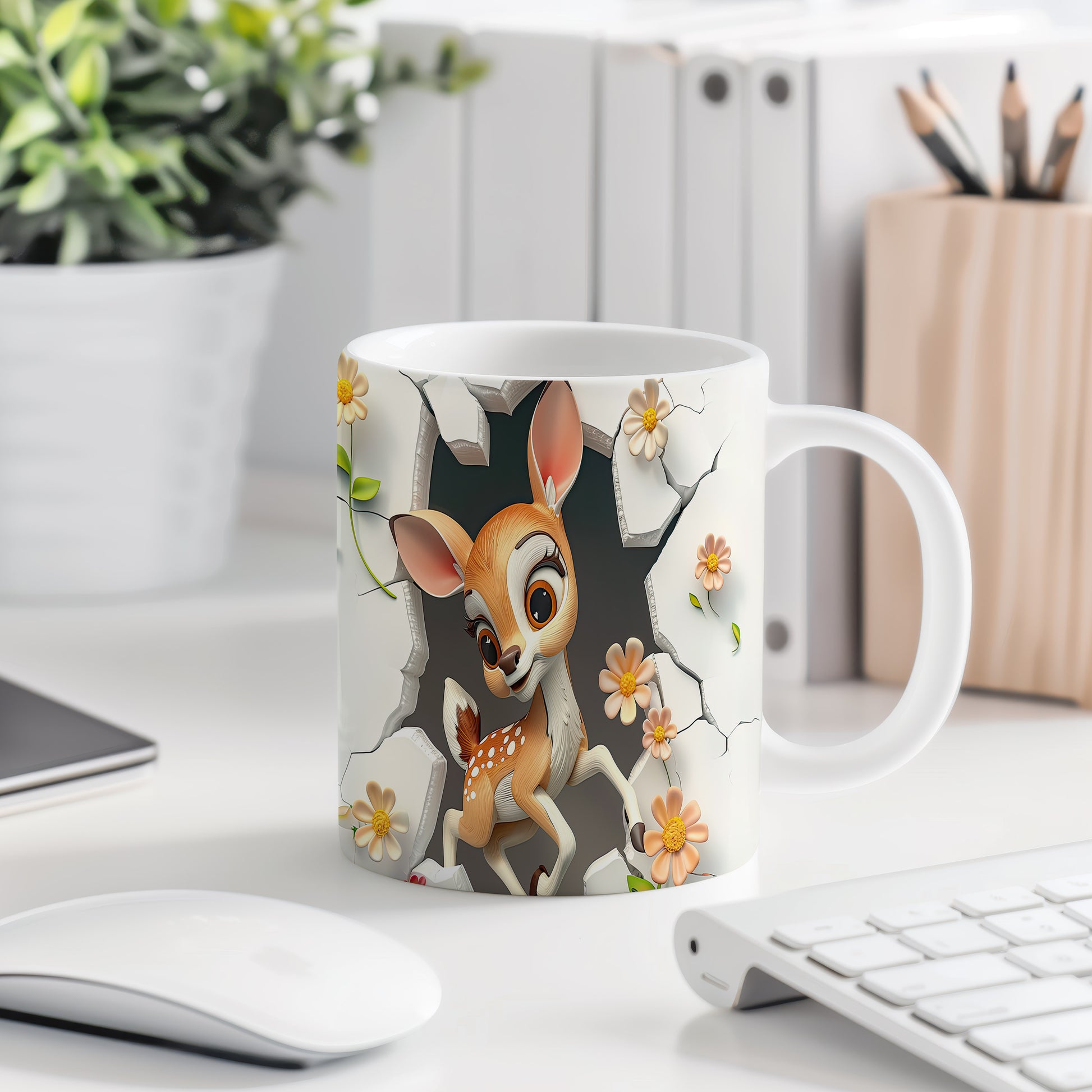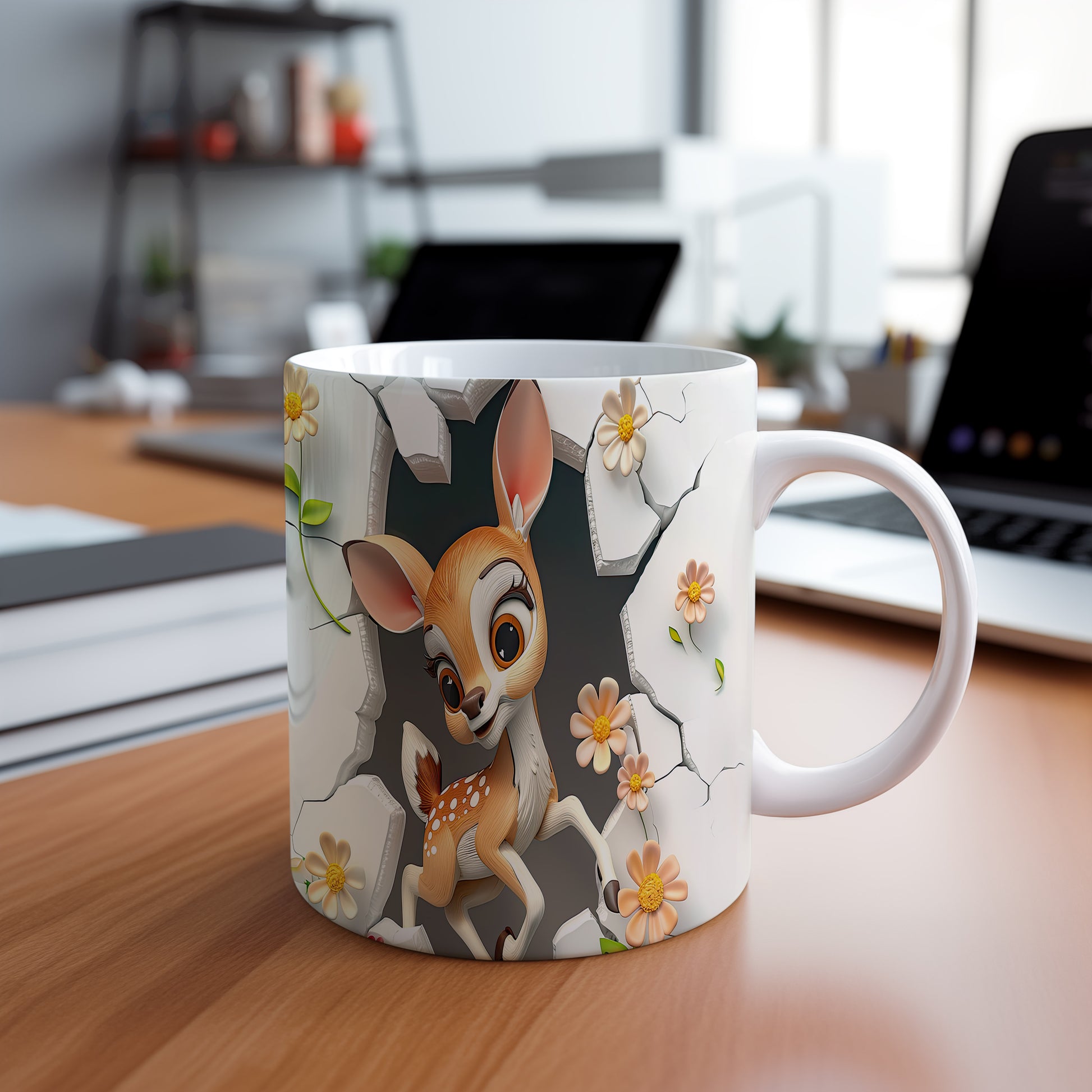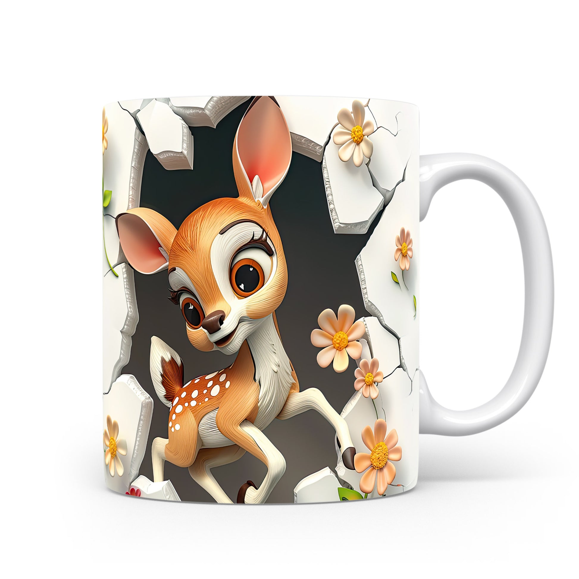 Tento hrnek zobrazuje roztomilé srnčí mládě mezi květinami, ideální pro milovníky přírody. Skvělý tip na dárek pro děti i dospělé, kteří ocení jemný design. Materiál: keramika. Objem: 330 ml. Vhodné do myčky i mikrovlnky. Díky svému vzhledu přináší radost a útulnost do každého dne.