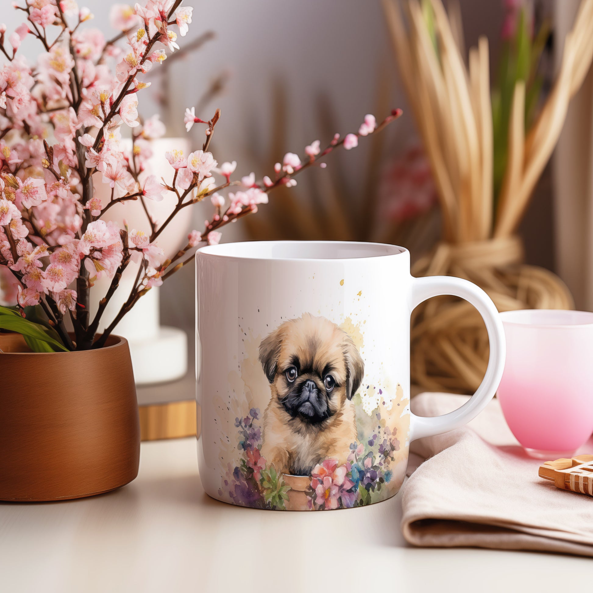 Hrnek s roztomilým štěňátkem v květinách
