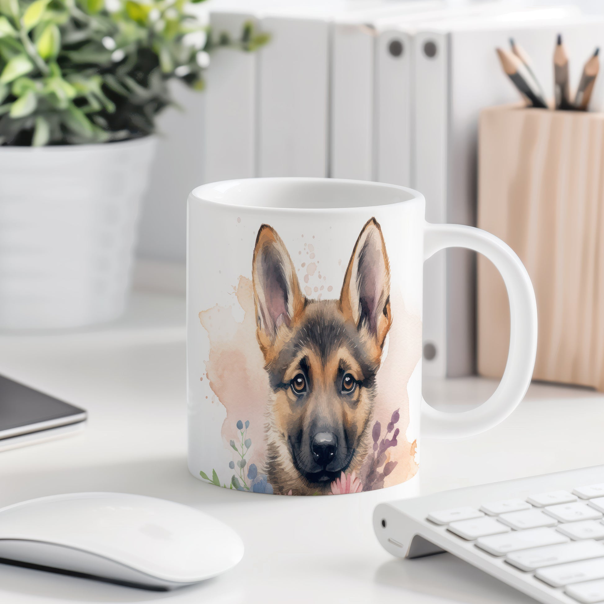 Keramický hrnek s motivem roztomilého štěněte německého ovčáka. Tento hrnek je ideální pro milovníky psů a skvělý tip na dárek pro každého, kdo si rád vychutnává kávu nebo čaj. Materiál: keramika. Objem: 330 ml. Vhodné do myčky i mikrovlnky. Používáním tohoto hrnku si můžete užít příjemné chvíle s oblíbeným nápojem.