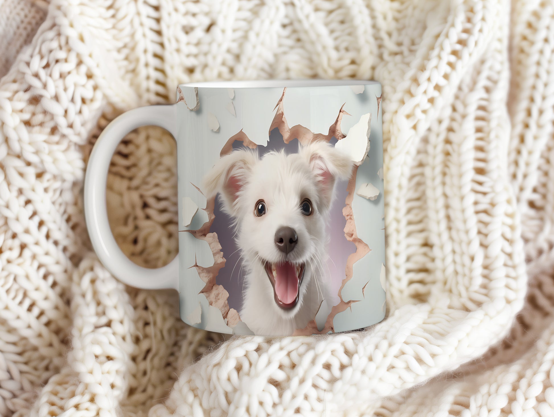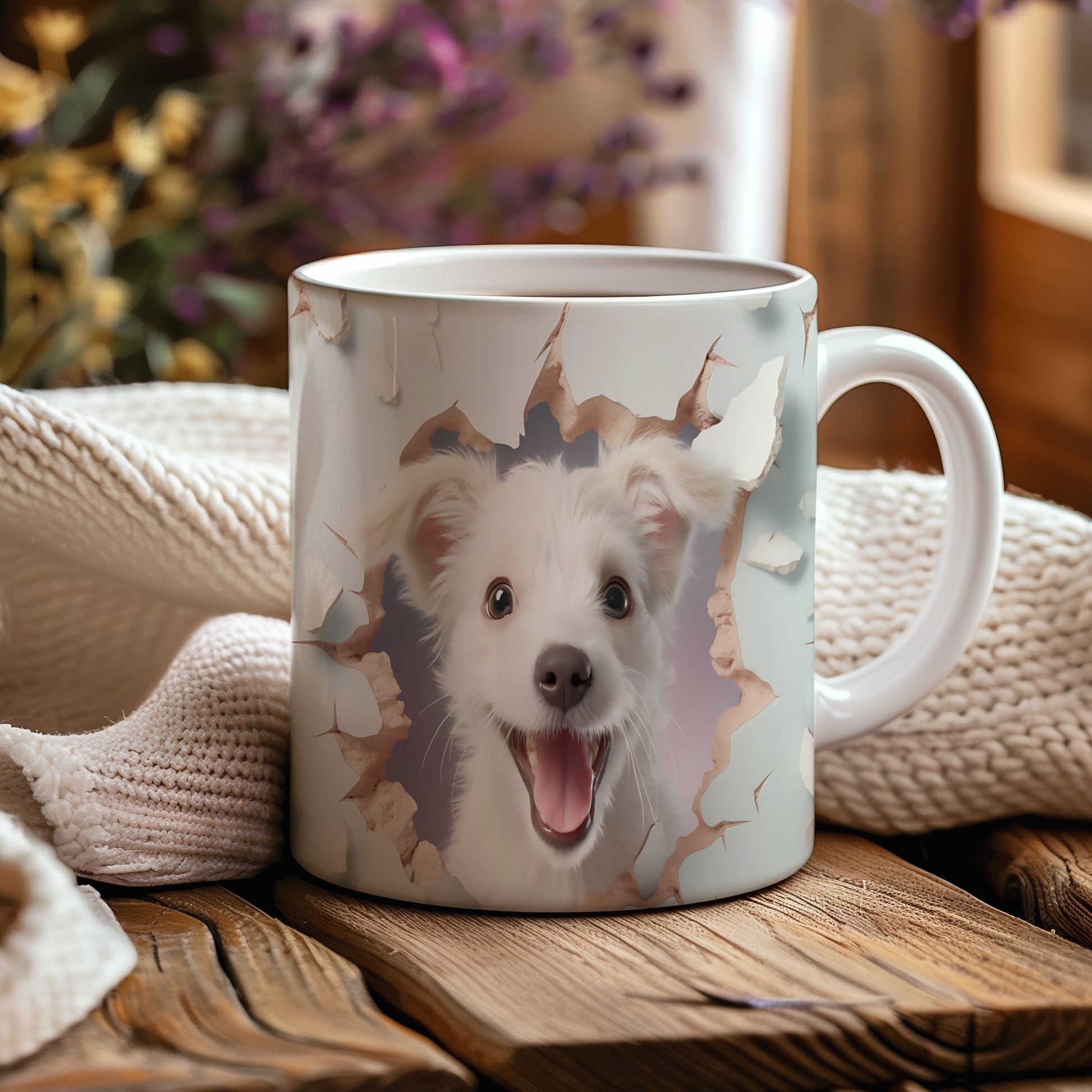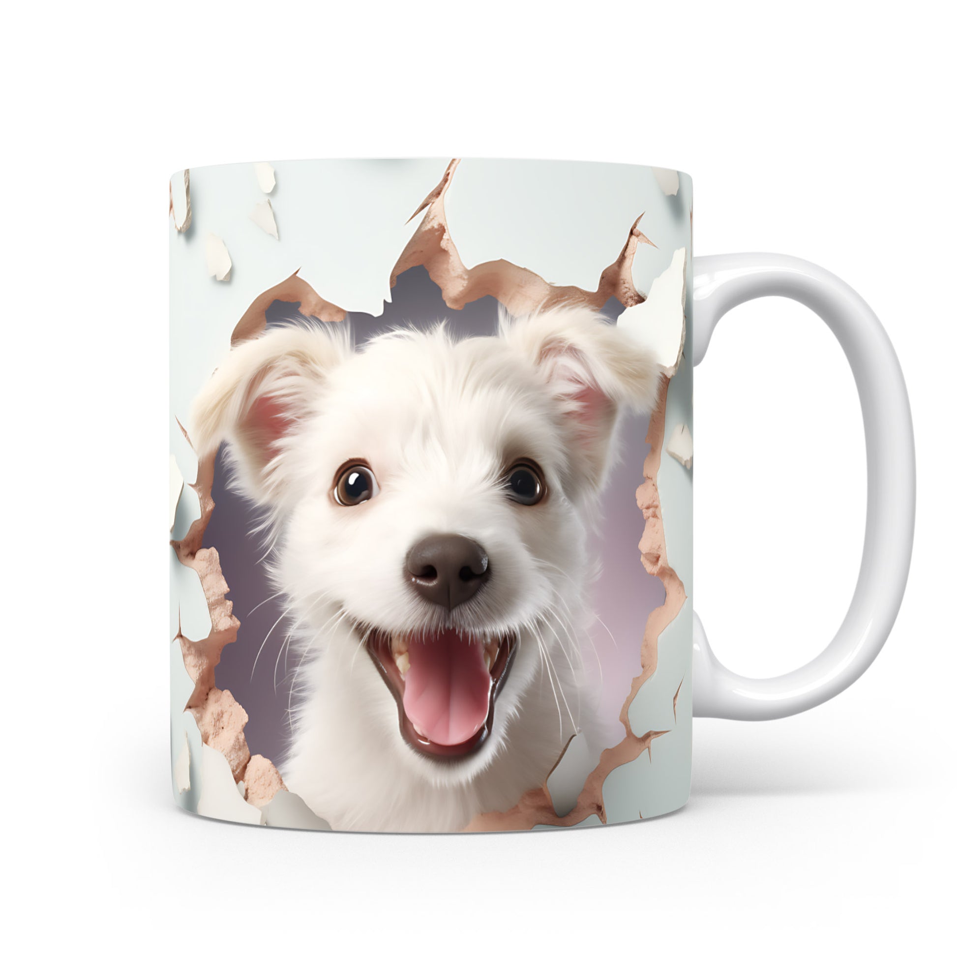 Tento hrnek zobrazuje roztomilého bílého pejska s usměvavým obličejem, který vypadá, jako by vyskakoval z hrnku. Je ideální pro milovníky psů a štěňat, skvěle se hodí jako dárek pro každého, kdo má rád zvířata. Materiál: keramika. Objem: 330 ml. Vhodné do myčky i mikrovlnky. Používání tohoto hrnku vám přinese radost a úsměv na tváři každý den.