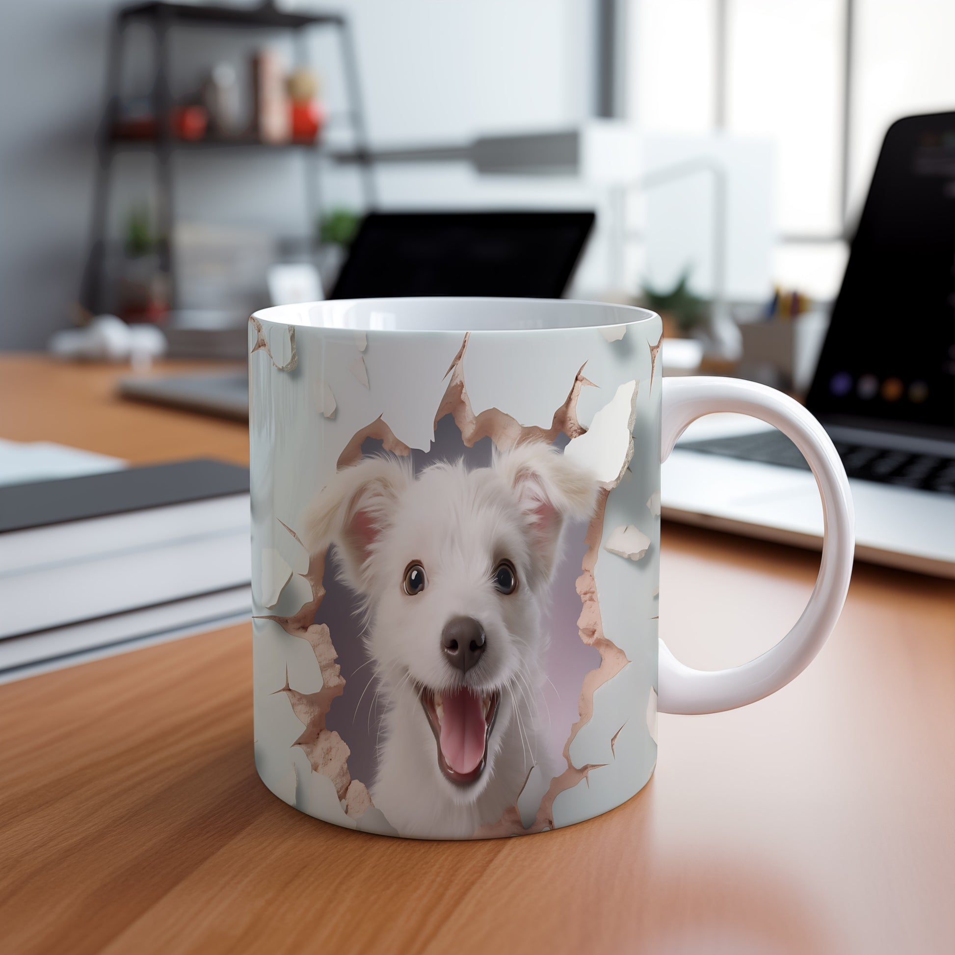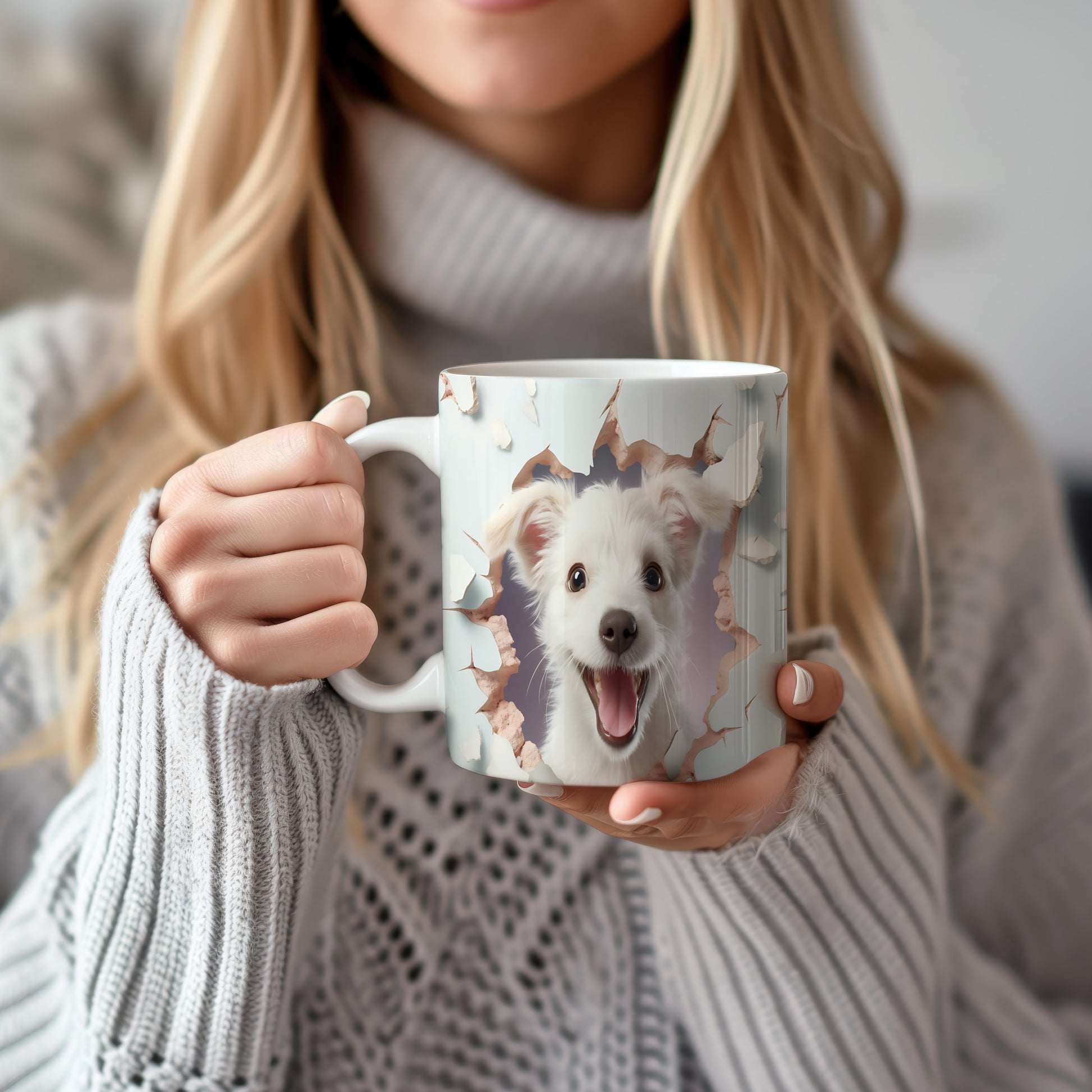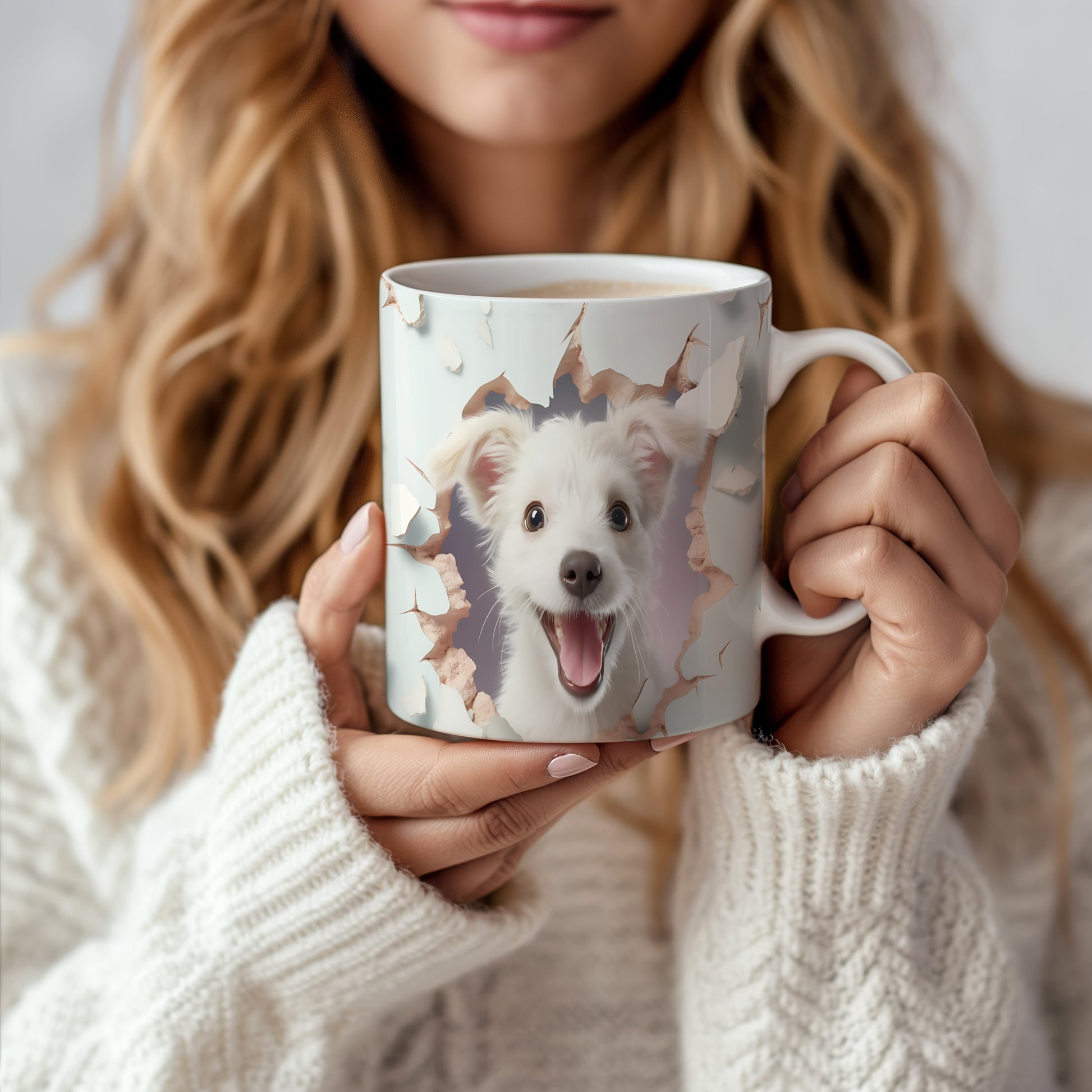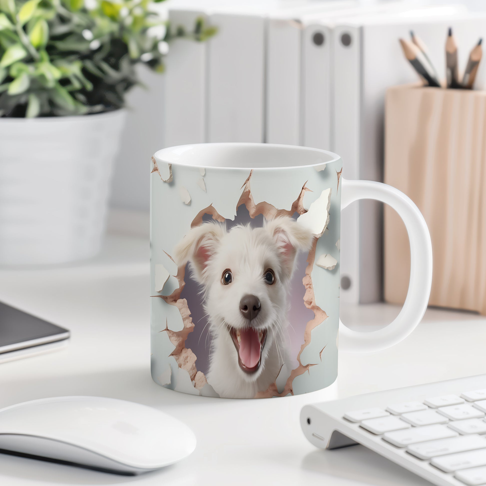 Tento hrnek zobrazuje roztomilého bílého pejska s usměvavým obličejem, který vypadá, jako by vyskakoval z hrnku. Je ideální pro milovníky psů a štěňat, skvěle se hodí jako dárek pro každého, kdo má rád zvířata. Materiál: keramika. Objem: 330 ml. Vhodné do myčky i mikrovlnky. Používání tohoto hrnku vám přinese radost a úsměv na tváři každý den.