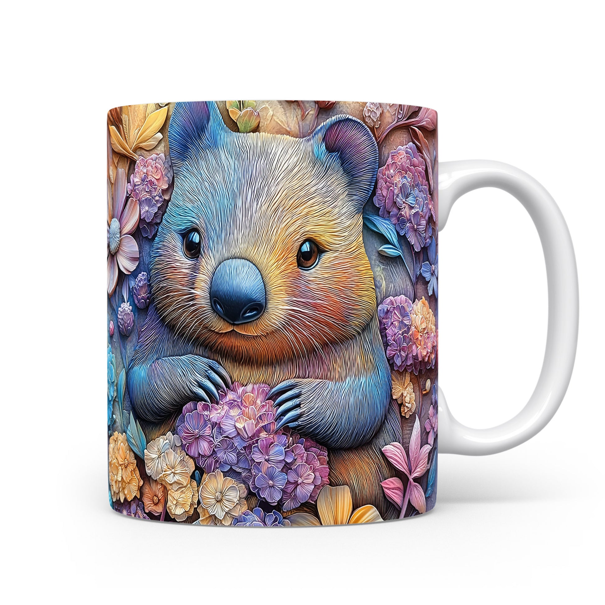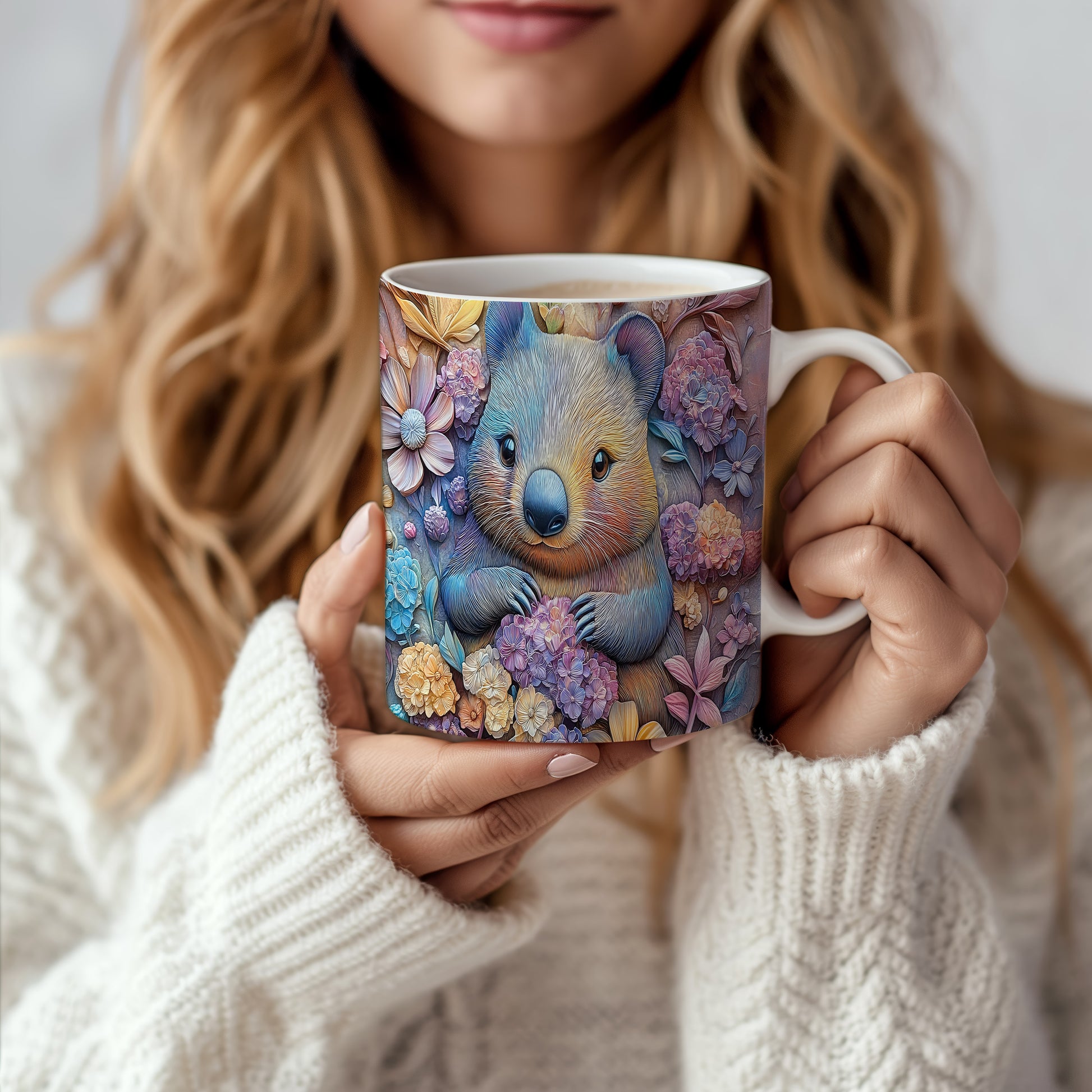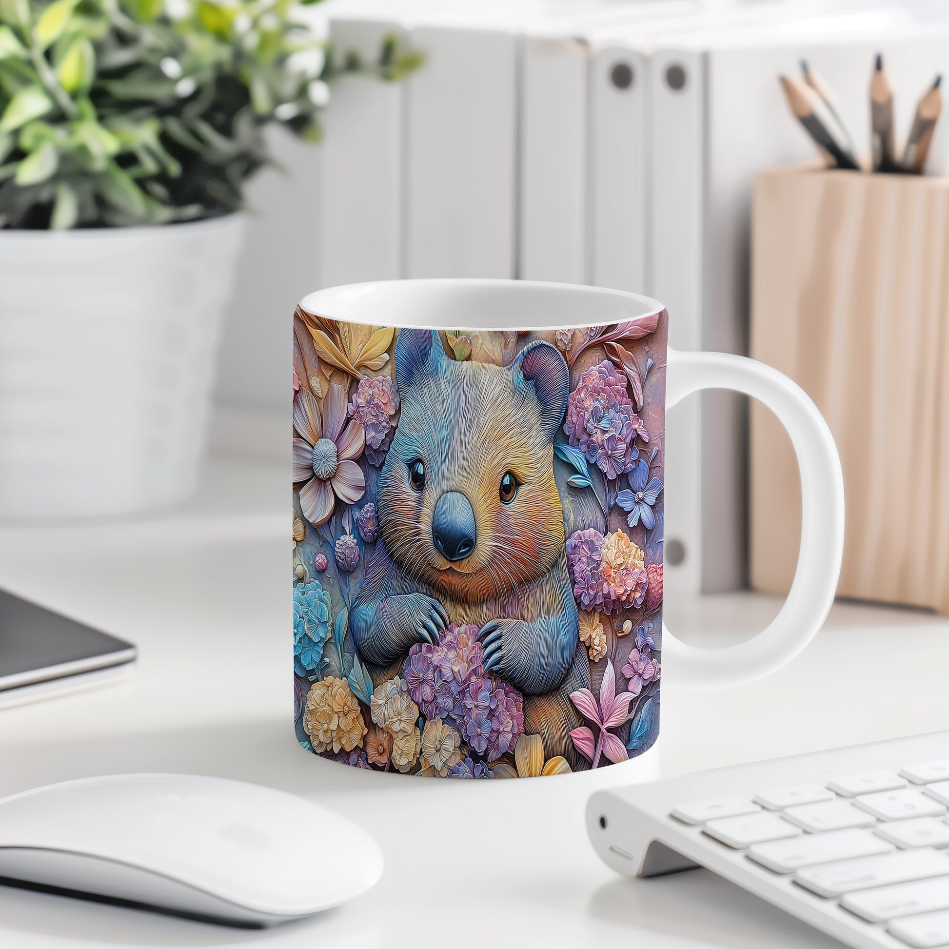 Hrnek s roztomilým wombatem v květinovém stylu je ideální pro milovníky přírody a zvířat. Skvělý tip na dárek pro přátele nebo rodinu, kteří ocení originální design. Materiál: keramika. Objem: 330 ml. Vhodné do myčky i mikrovlnky. Tento hrnek přináší radost do každého dne a potěší při každém doušku vašeho oblíbeného nápoje.