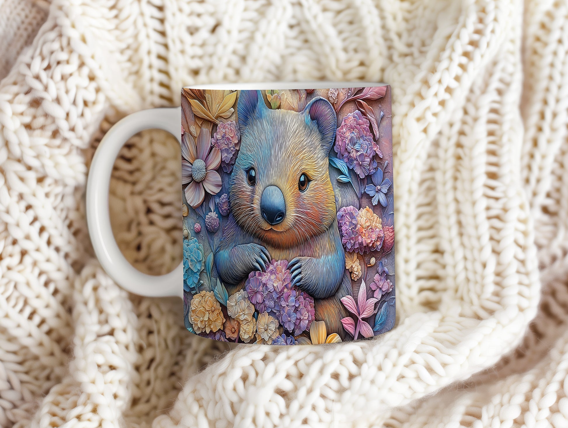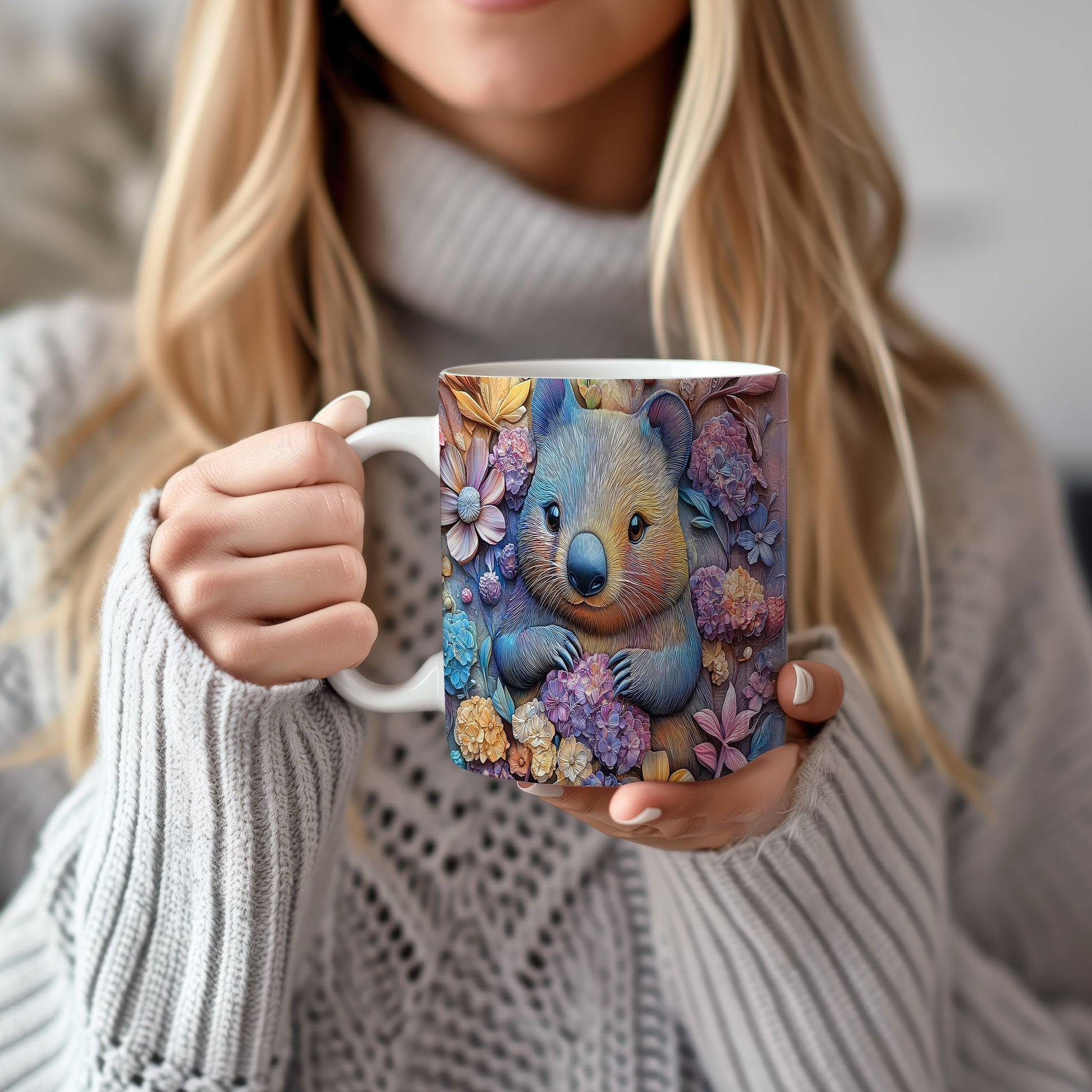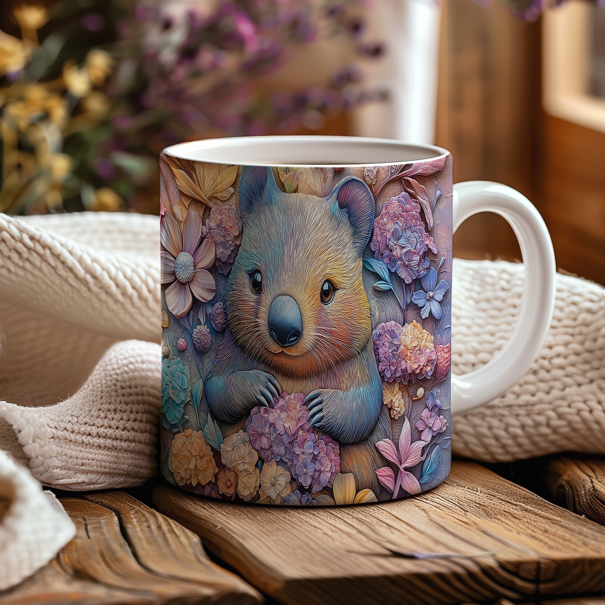 Hrnek s roztomilým wombatem v květinovém stylu je ideální pro milovníky přírody a zvířat. Skvělý tip na dárek pro přátele nebo rodinu, kteří ocení originální design. Materiál: keramika. Objem: 330 ml. Vhodné do myčky i mikrovlnky. Tento hrnek přináší radost do každého dne a potěší při každém doušku vašeho oblíbeného nápoje.