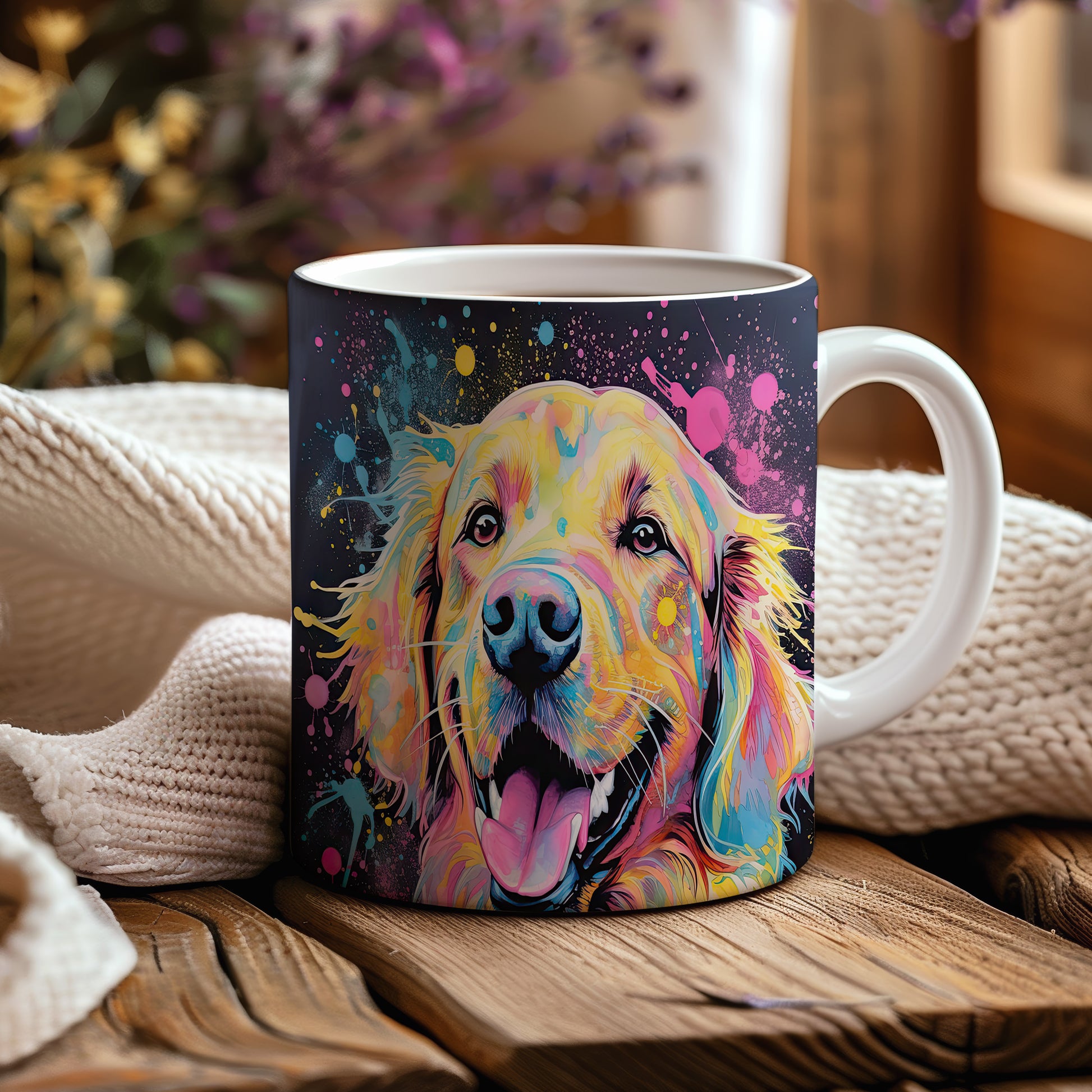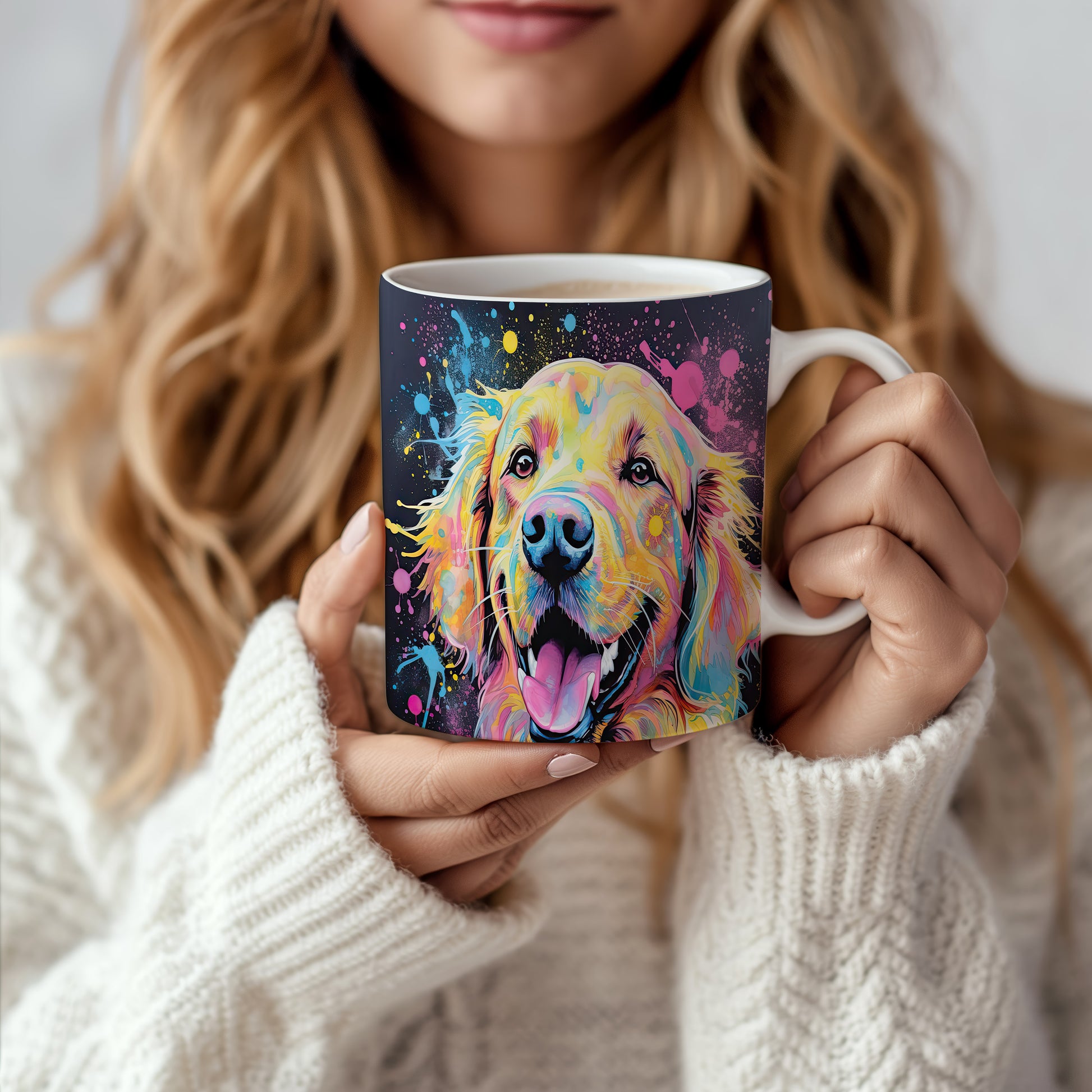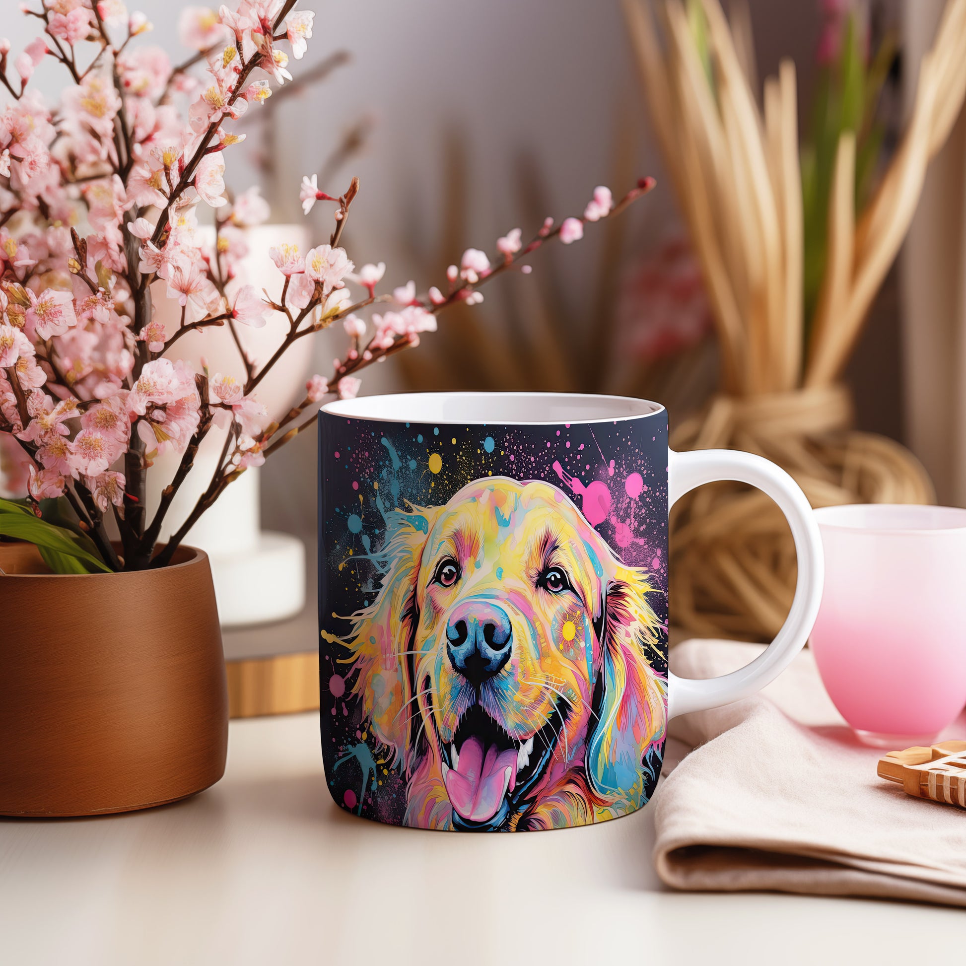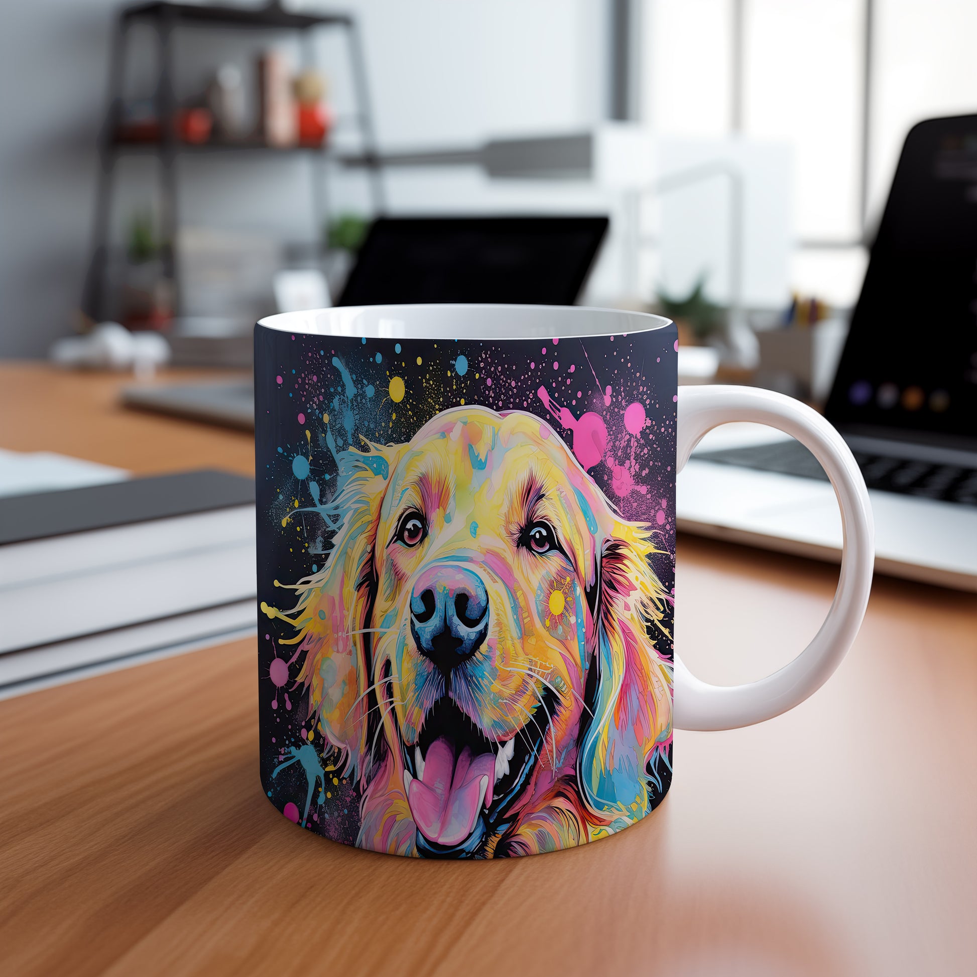 Tento hrnek zobrazuje roztomilého zlatého retrívra v barevném stylu. Je ideální pro milovníky psů a skvělým dárkem pro každého, kdo má rád radostné chvíle. Materiál: keramika. Objem: 330 ml. Vhodné do myčky i mikrovlnky. Užívejte si každé sousto s tímto veselým hrnkem.