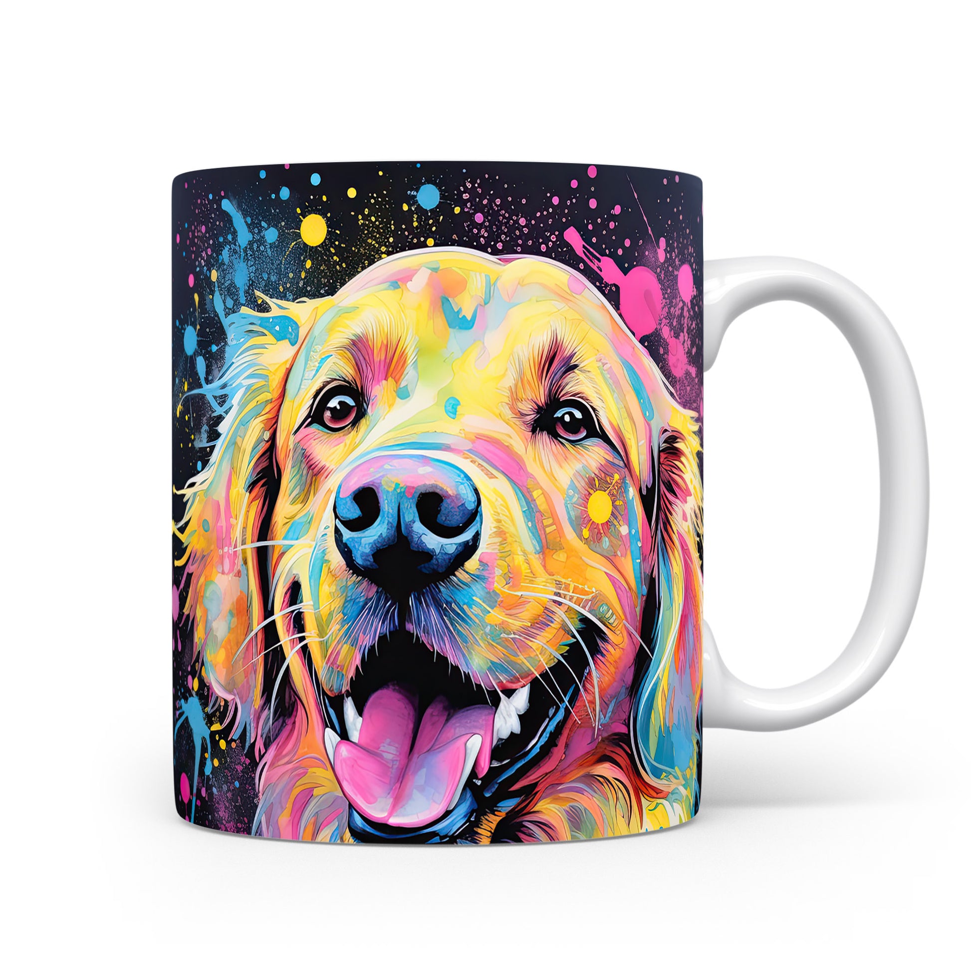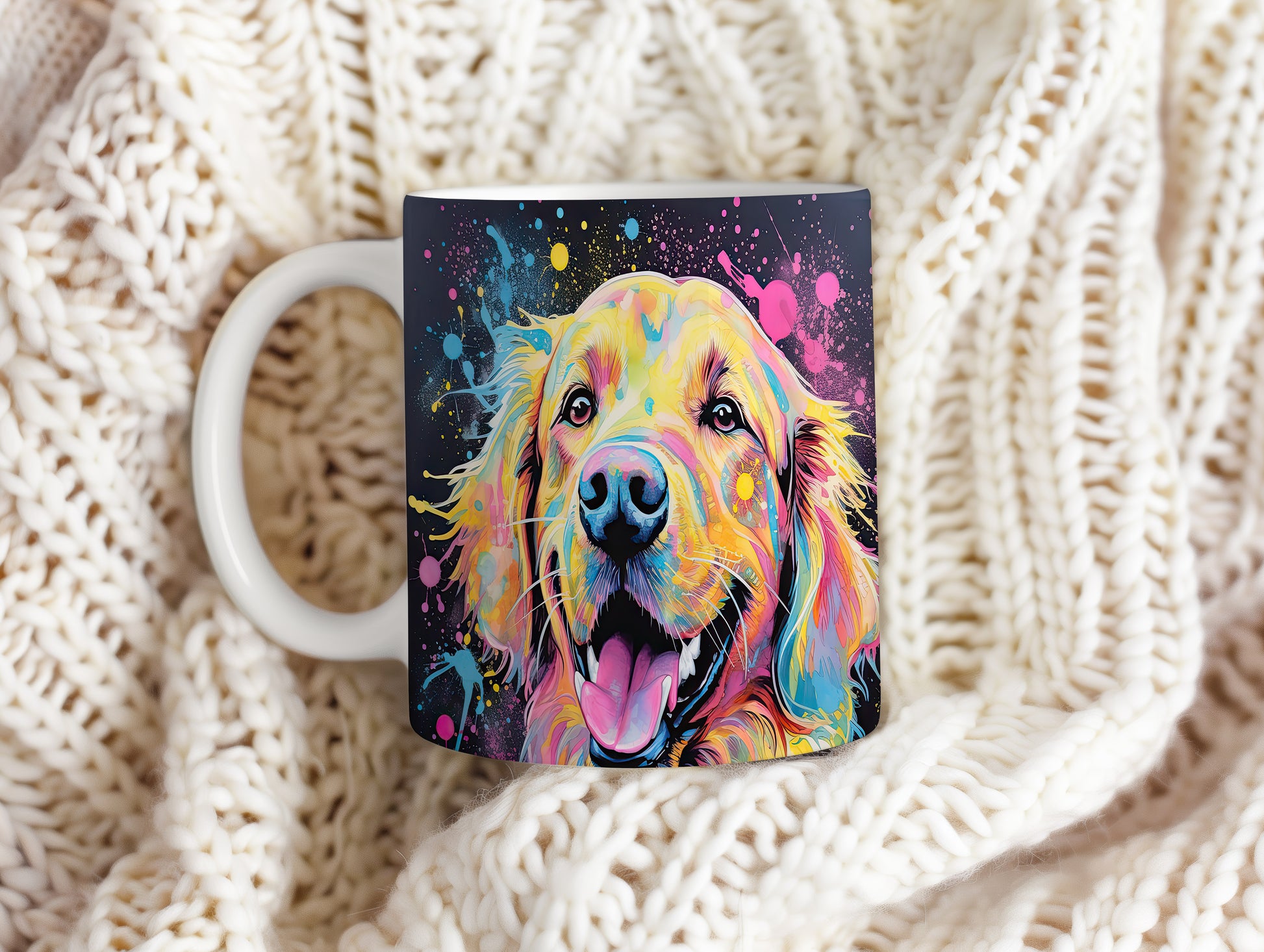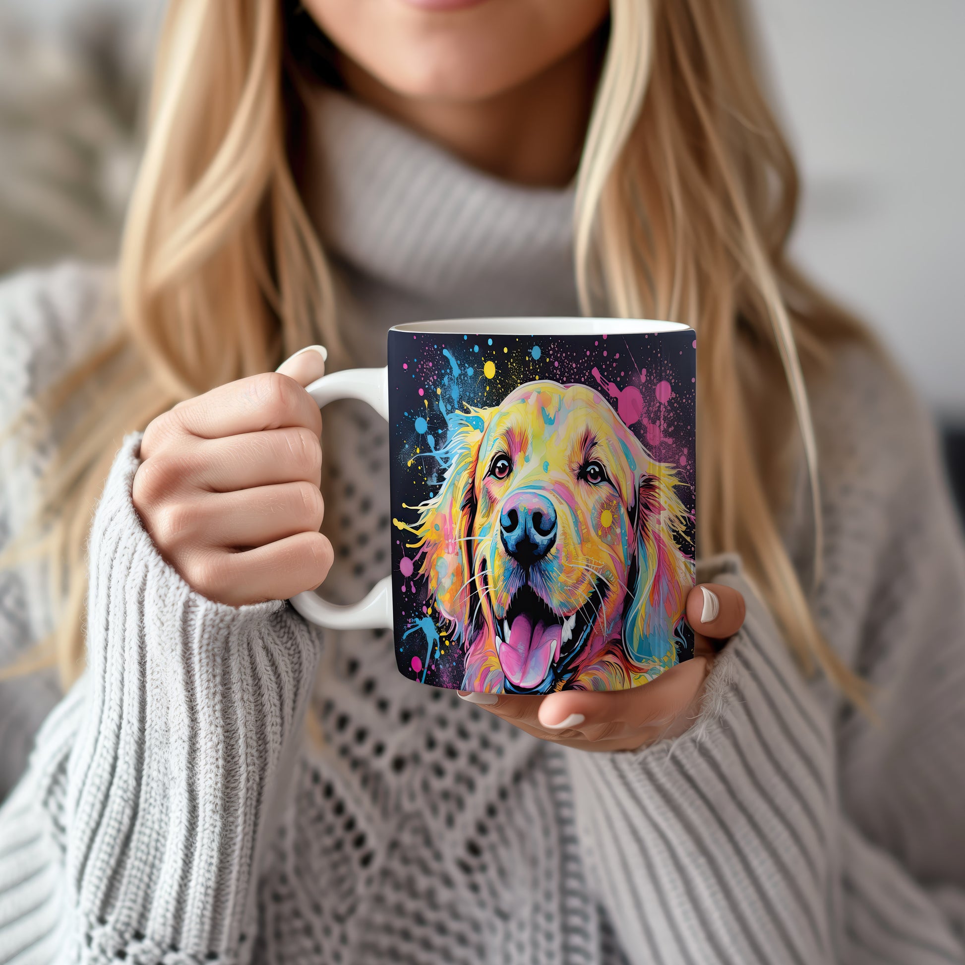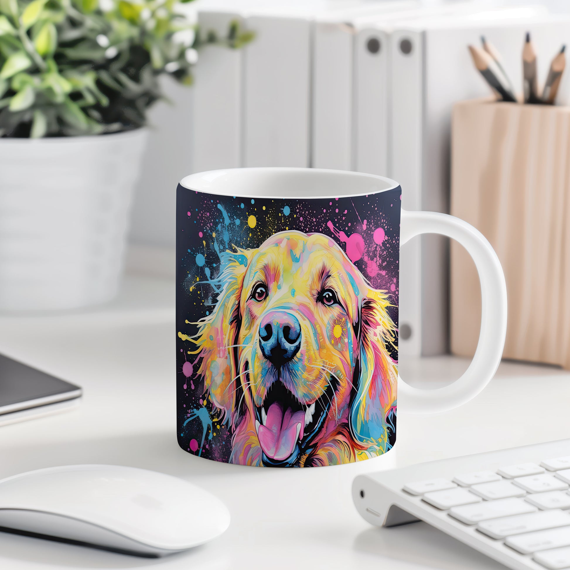 Tento hrnek zobrazuje roztomilého zlatého retrívra v barevném stylu. Je ideální pro milovníky psů a skvělým dárkem pro každého, kdo má rád radostné chvíle. Materiál: keramika. Objem: 330 ml. Vhodné do myčky i mikrovlnky. Užívejte si každé sousto s tímto veselým hrnkem.