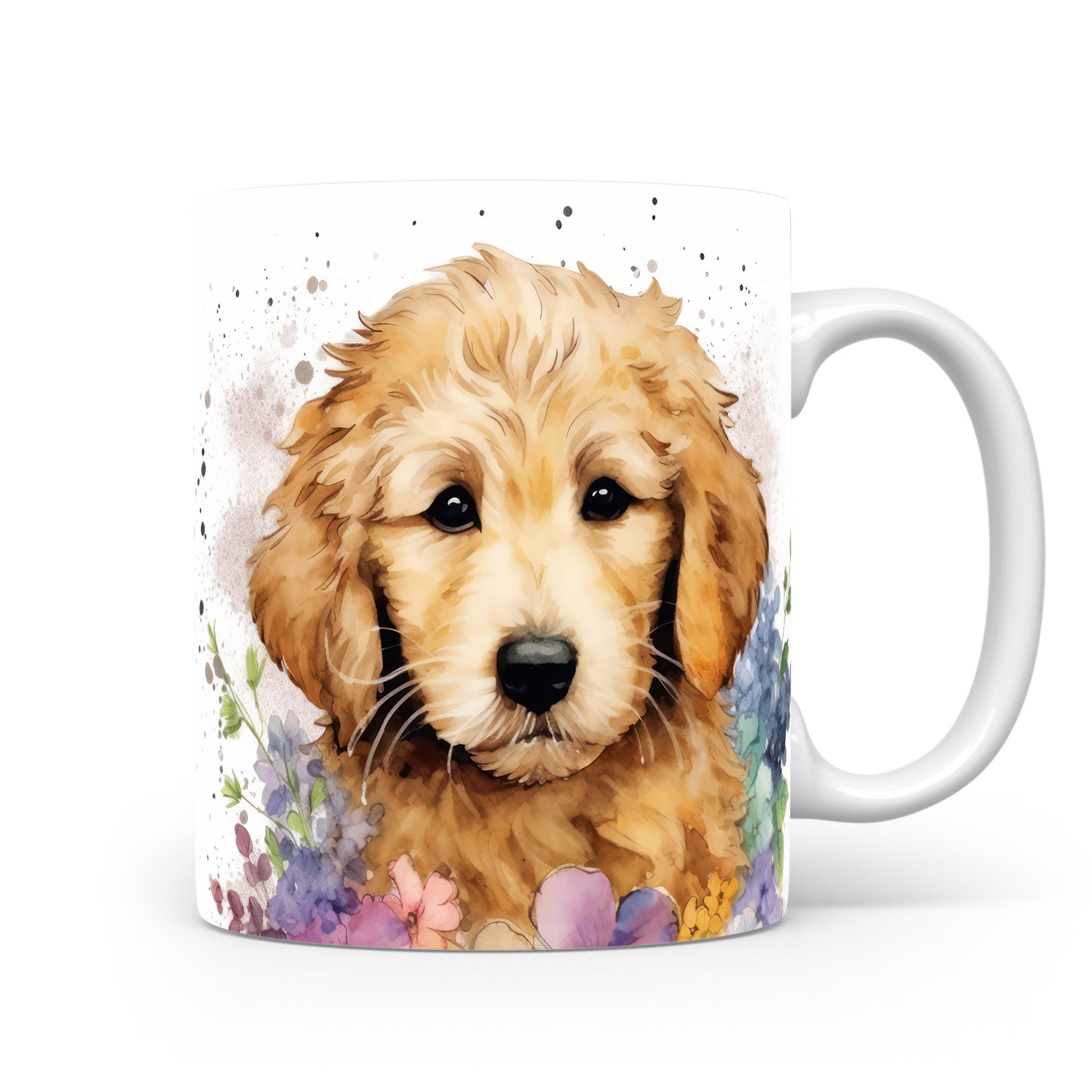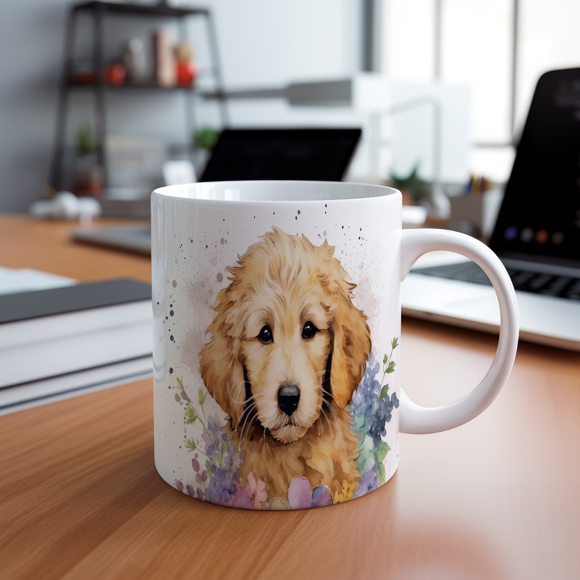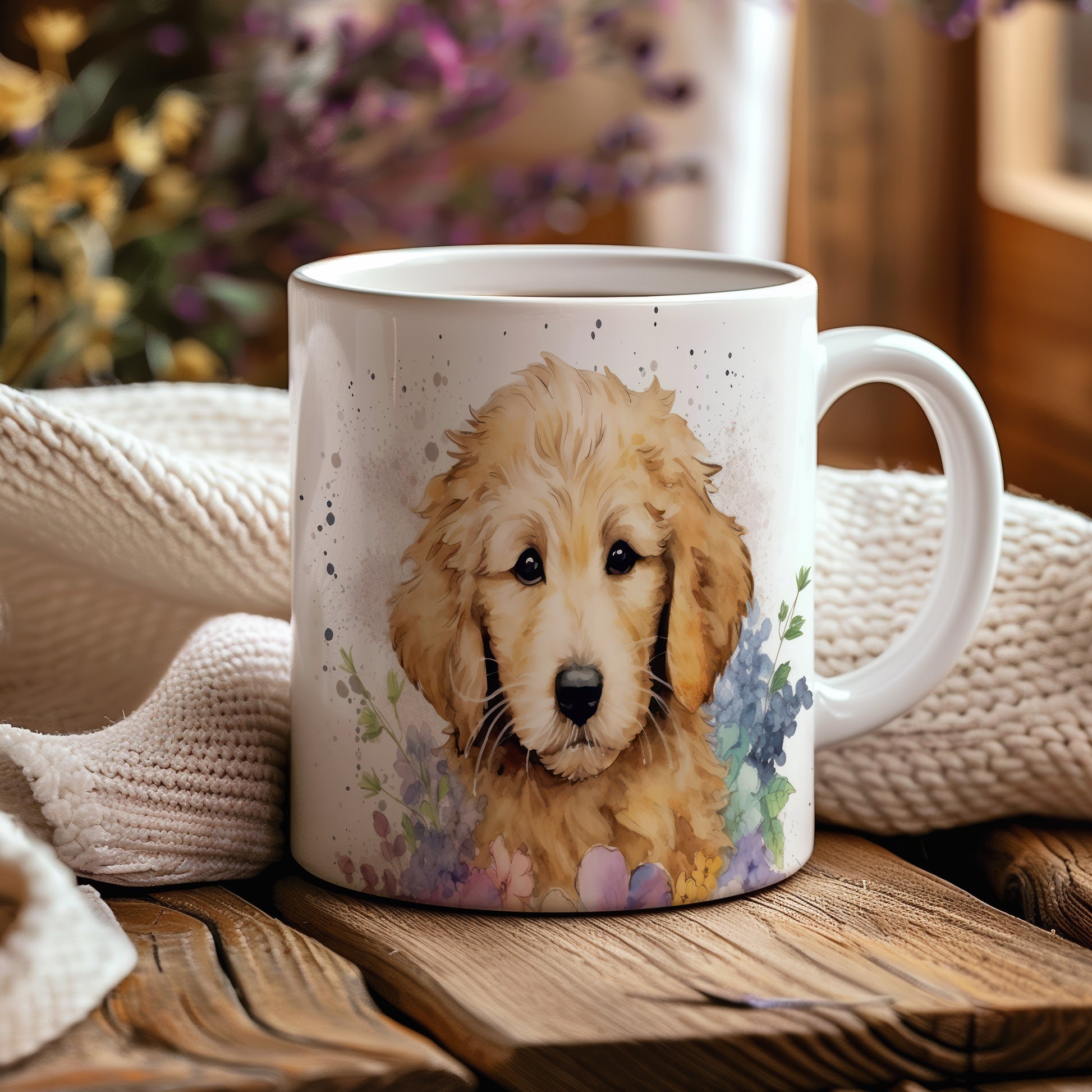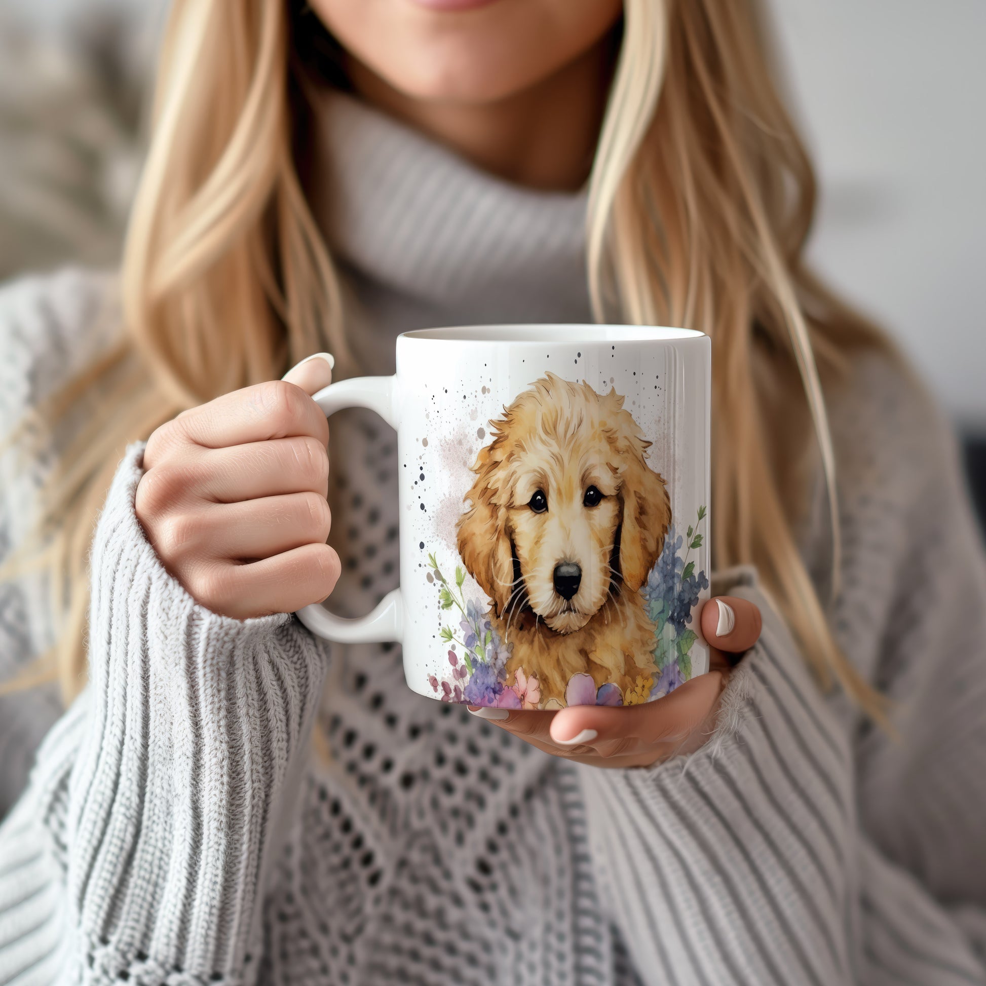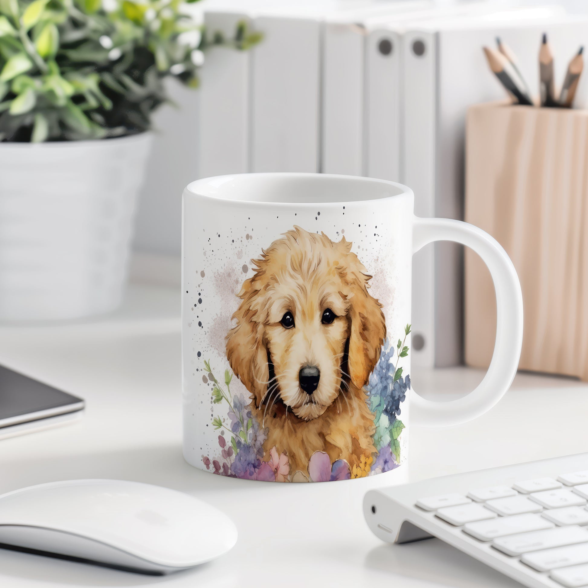 Hrnek s roztomilým zlatým retrívrem a květinami v hnědých tónech…