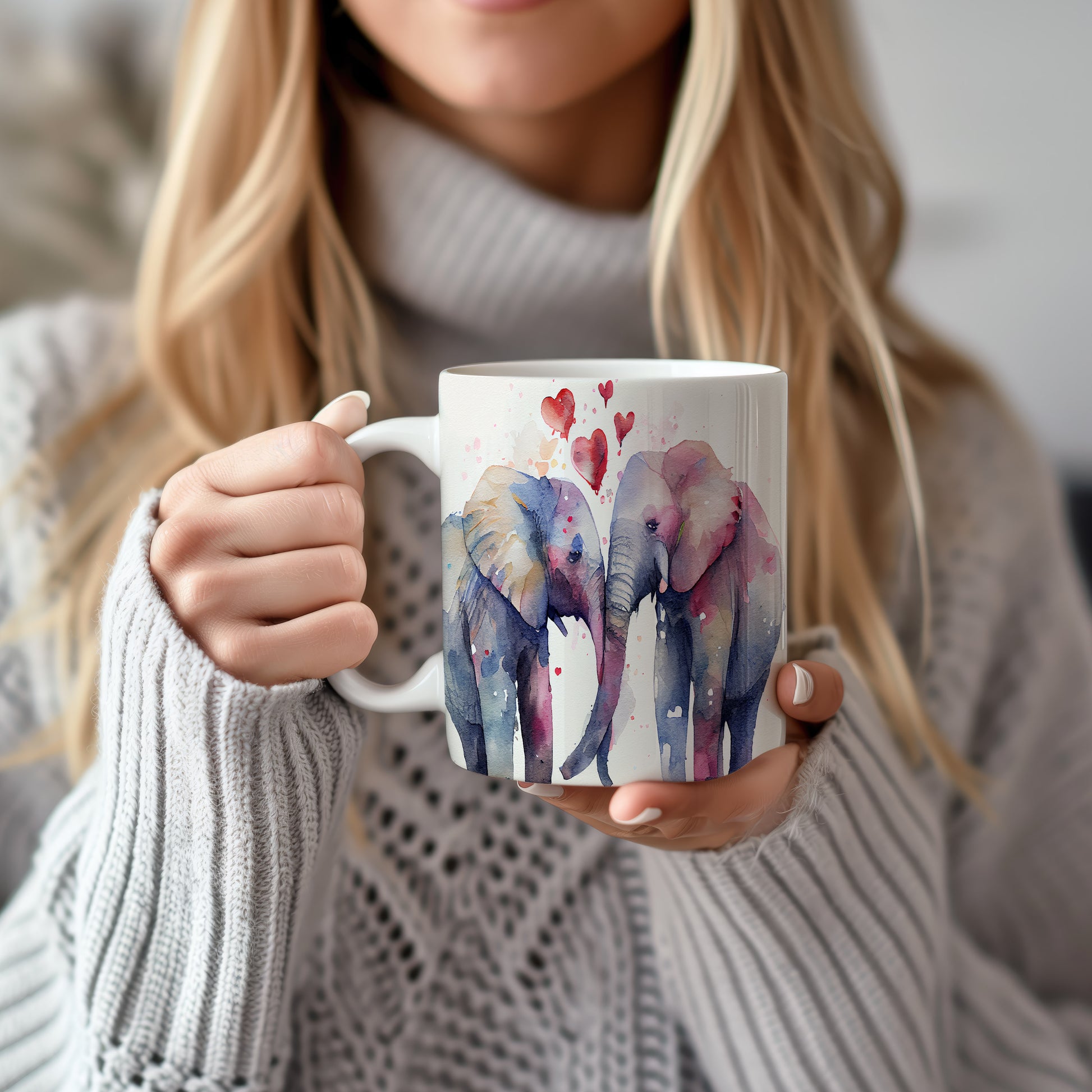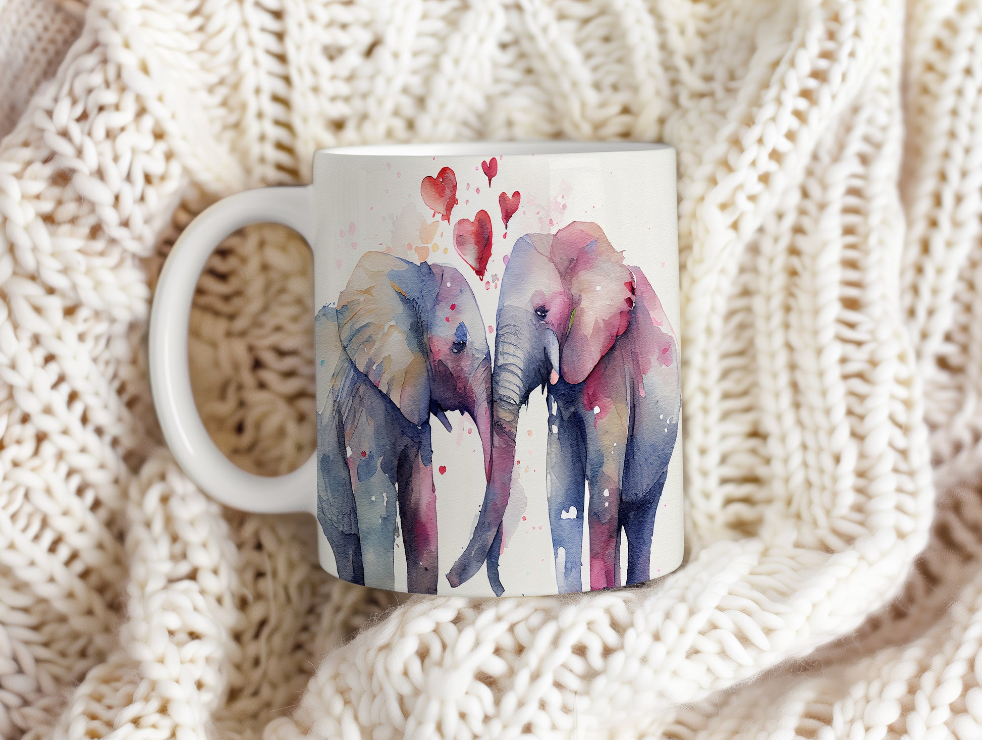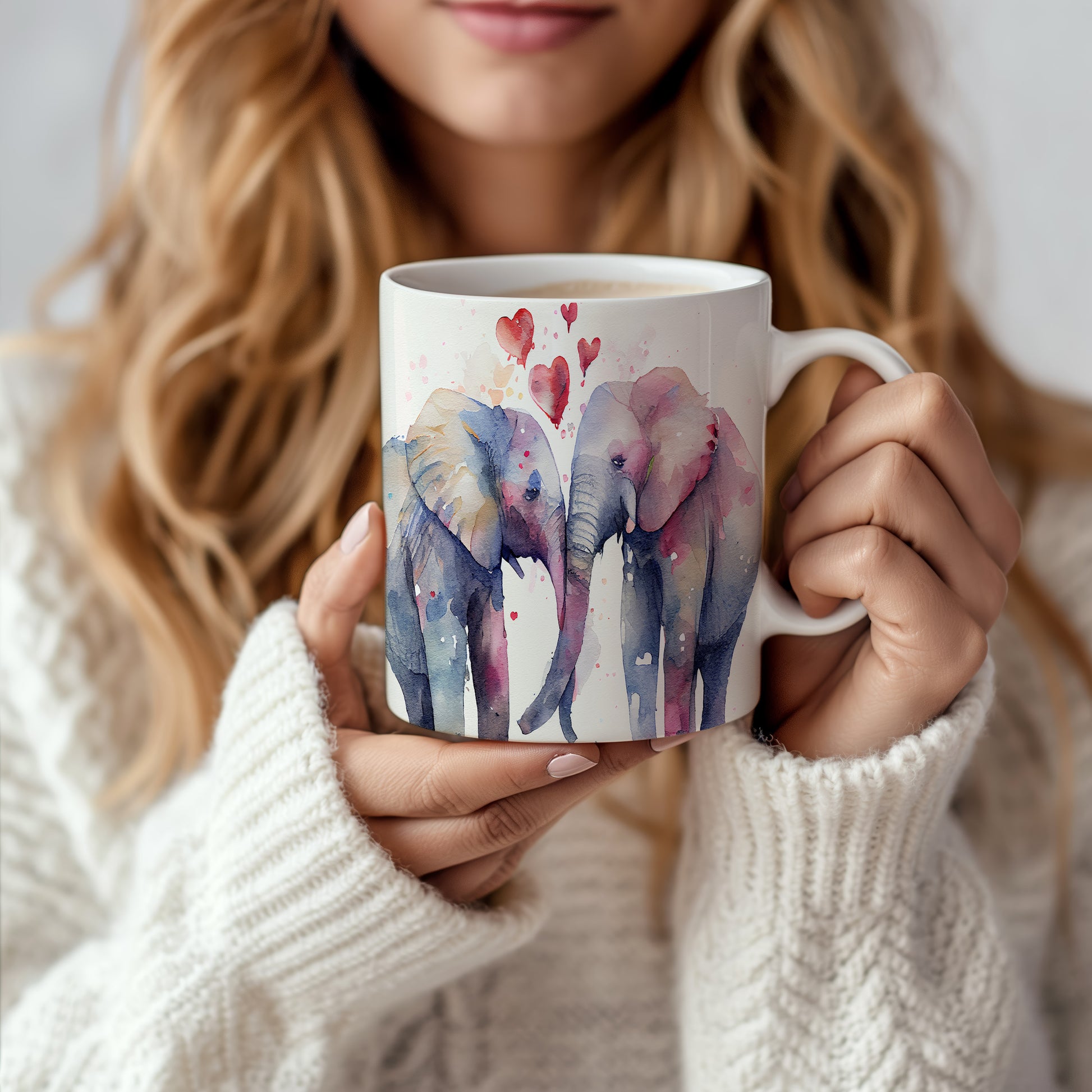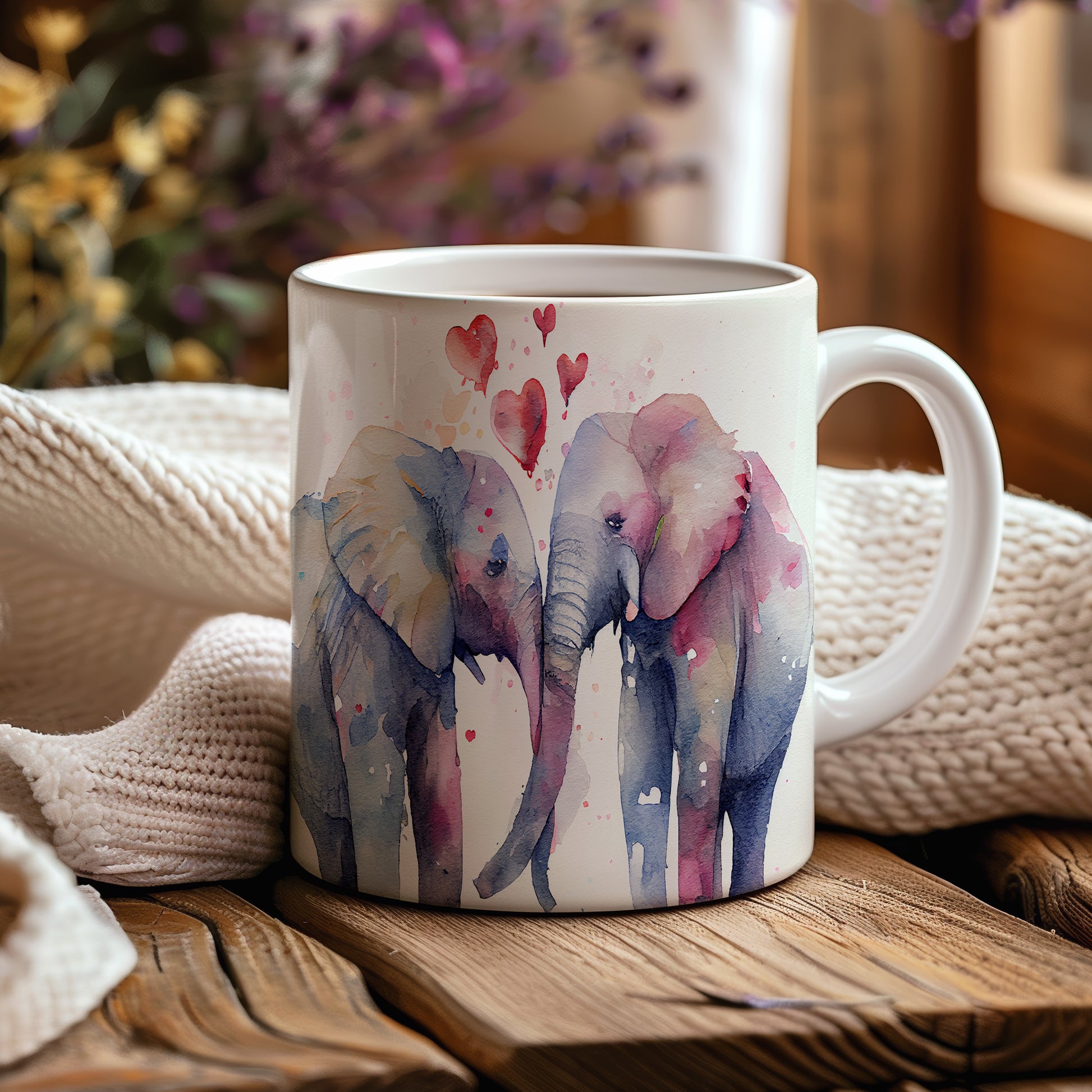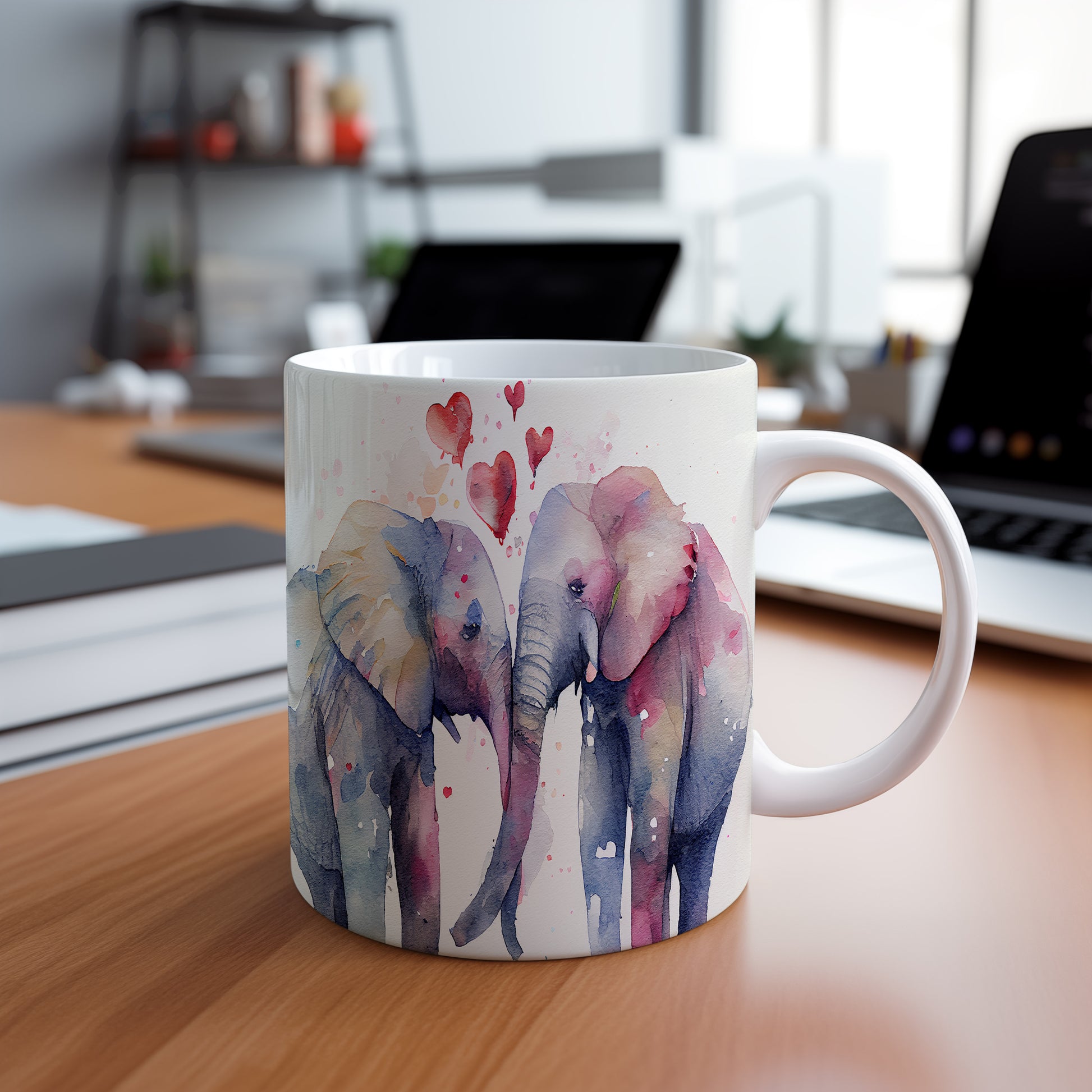 Tento keramický hrnek s akvarelovým motivem dvou slonů, kteří se k sobě naklání, je ideální pro milovníky přírody a zvířat. Skvělý tip na dárek pro přátele nebo rodinu. Materiál: keramika. Objem: 330 ml. Vhodné do myčky i mikrovlnky. Užívejte si kávu nebo čaj s tímto jedinečným designem, který potěší každého.
