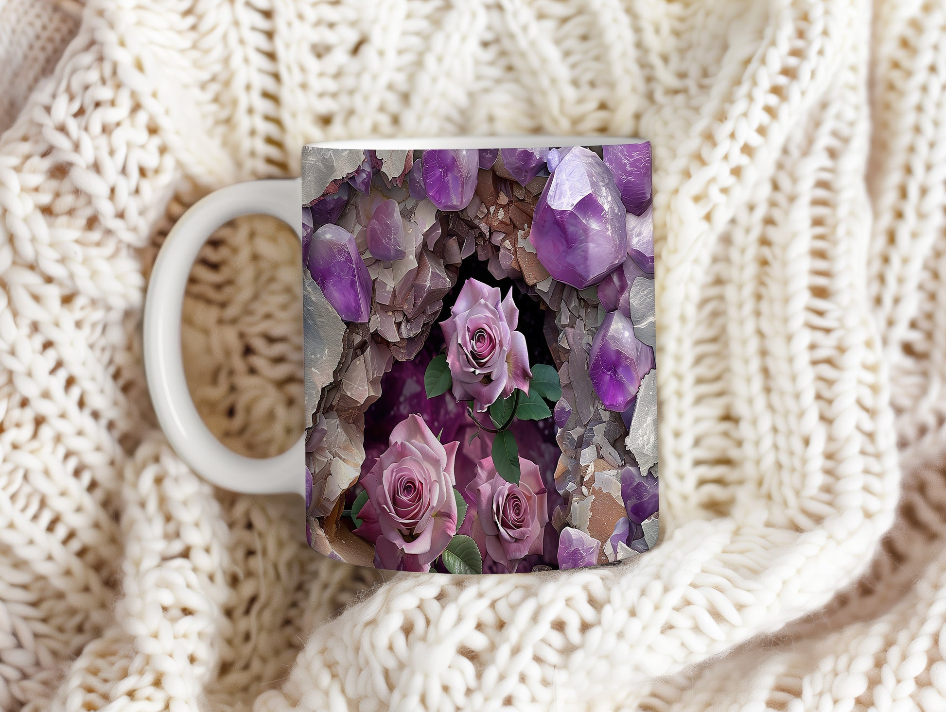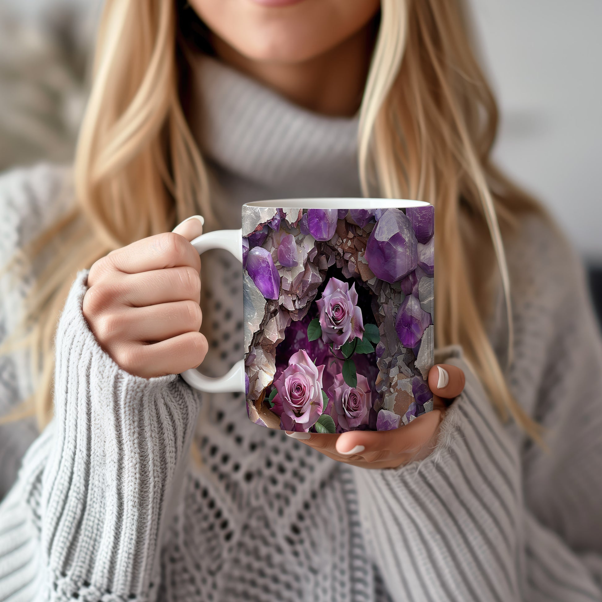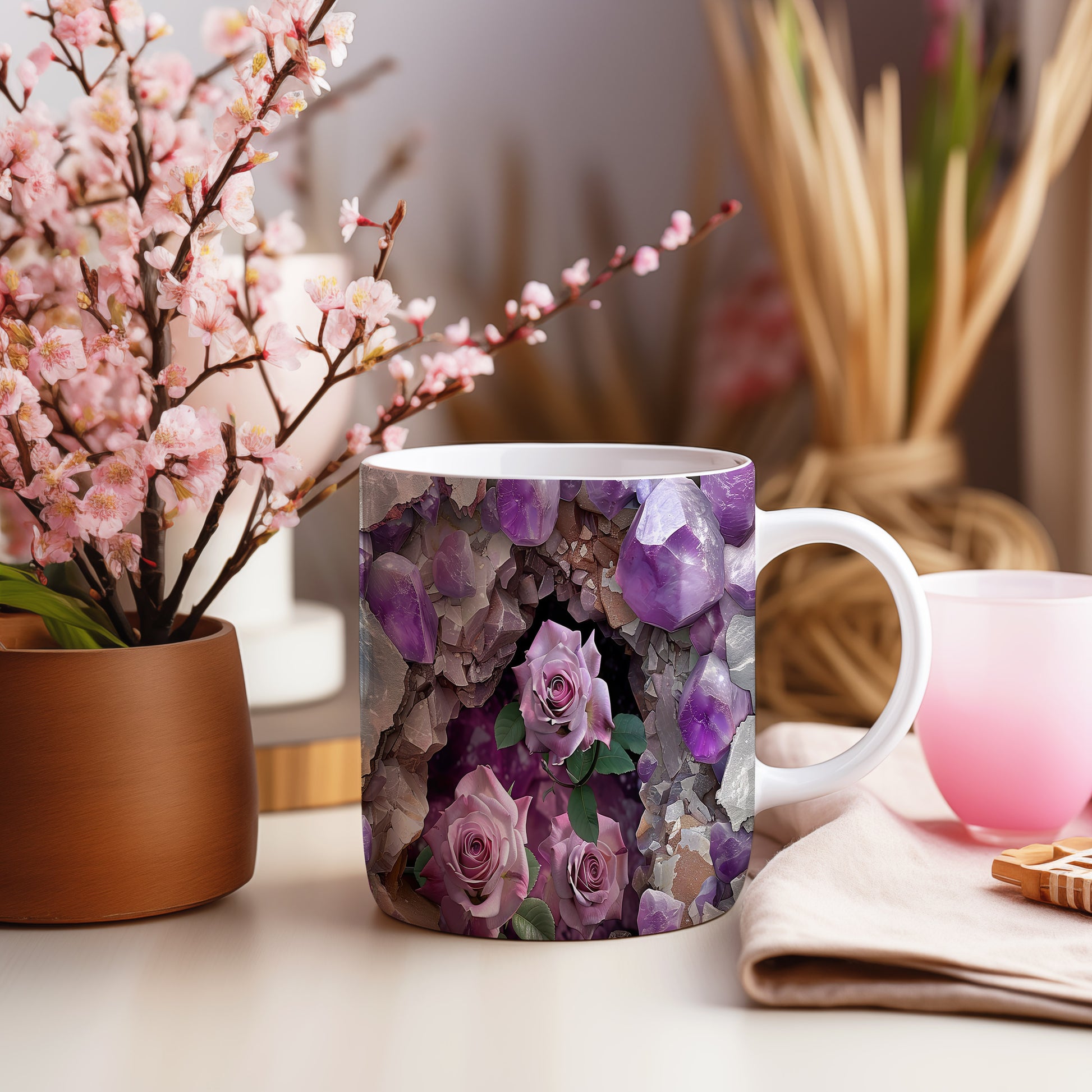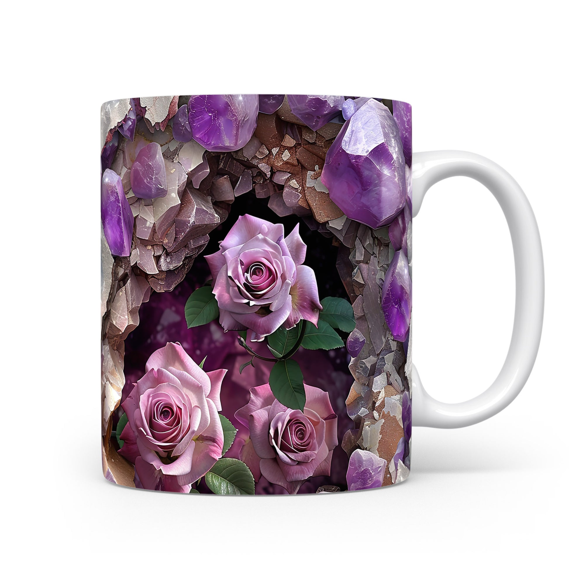 Elegantní hrnek s motivem růží a ametystových krystalů. Tento stylový kousek je ideální pro milovníky přírody a květin, skvěle se hodí jako dárek pro blízké. Materiál: keramika. Objem: 330 ml. Vhodné do myčky i mikrovlnky. Používání tohoto hrnku přináší radost z každého doušku.