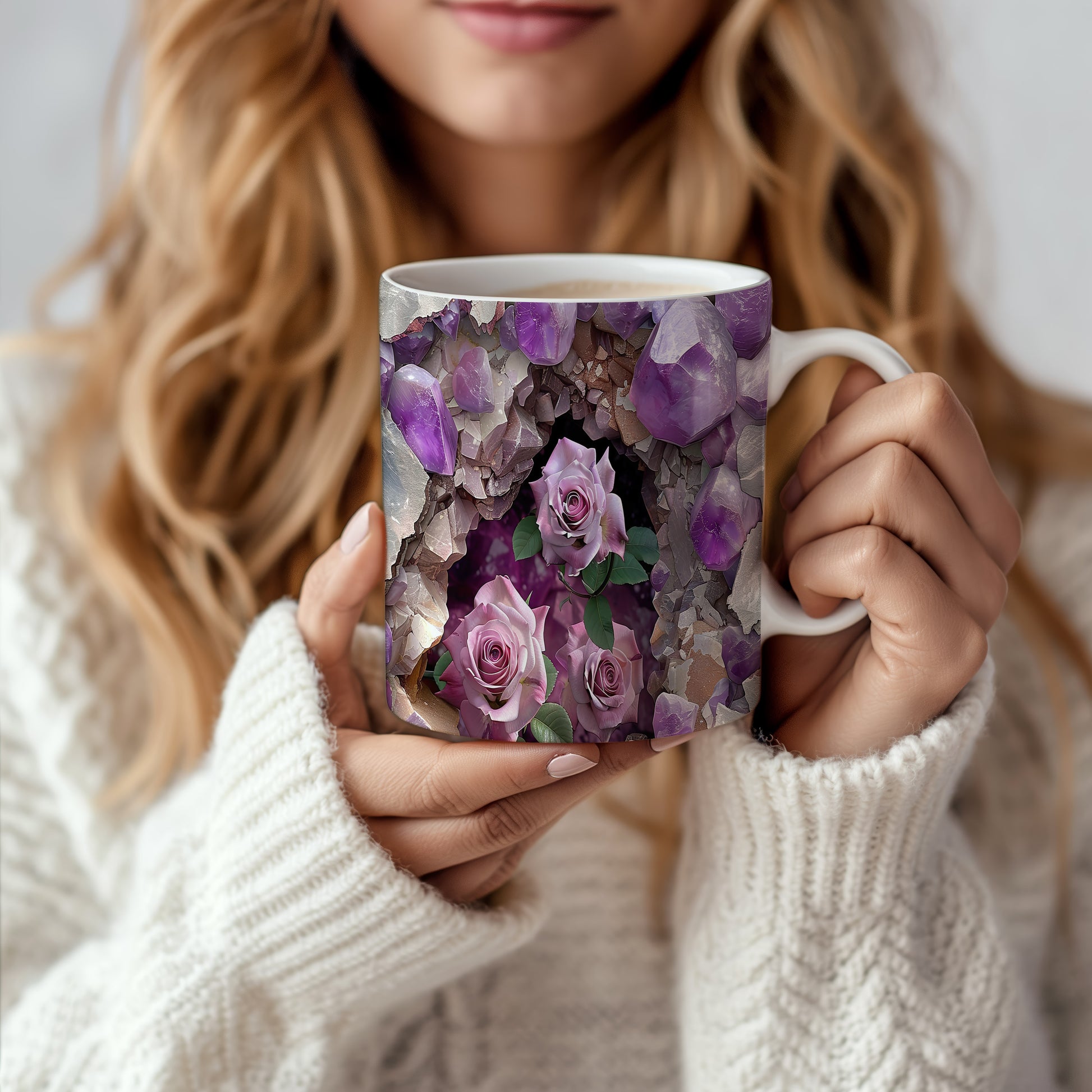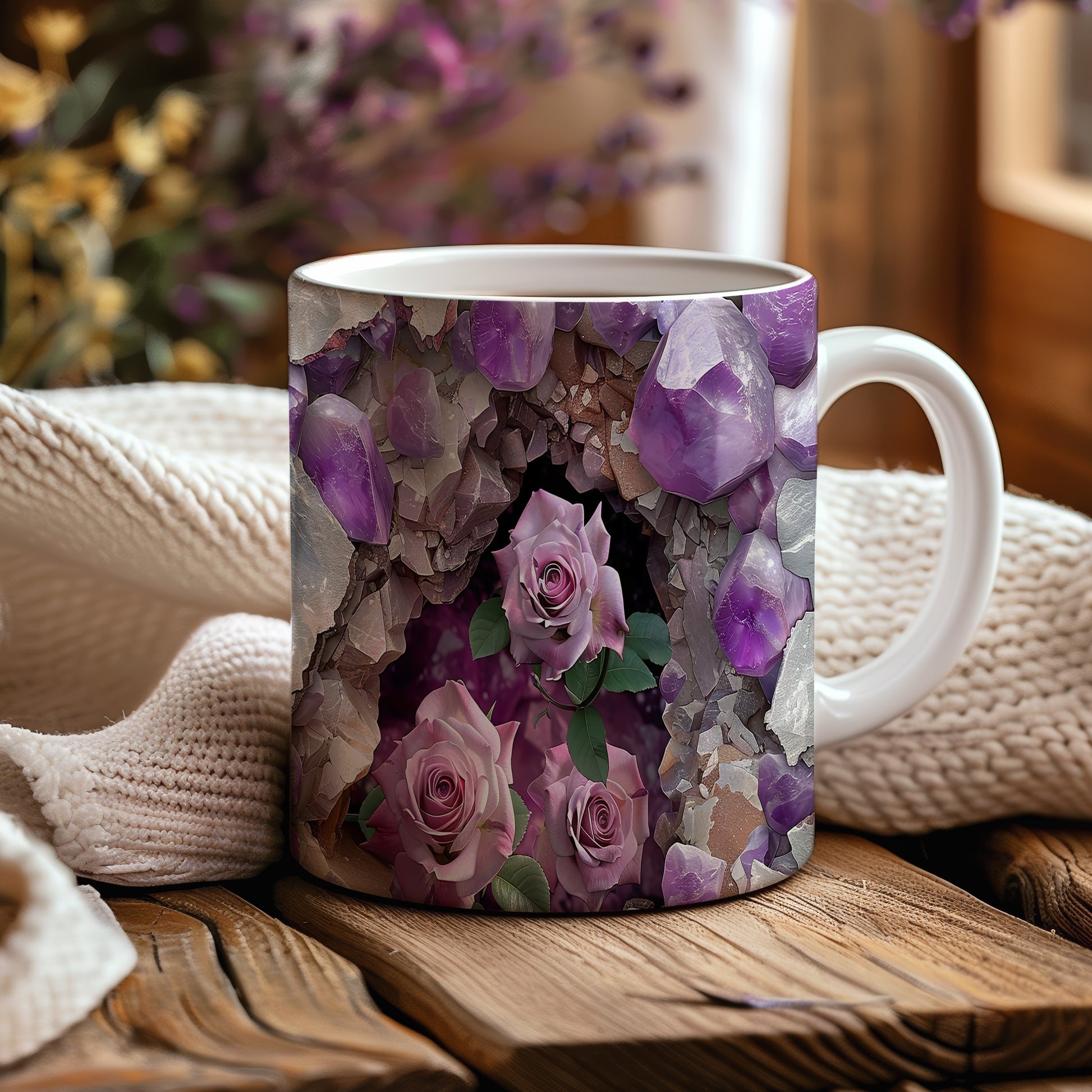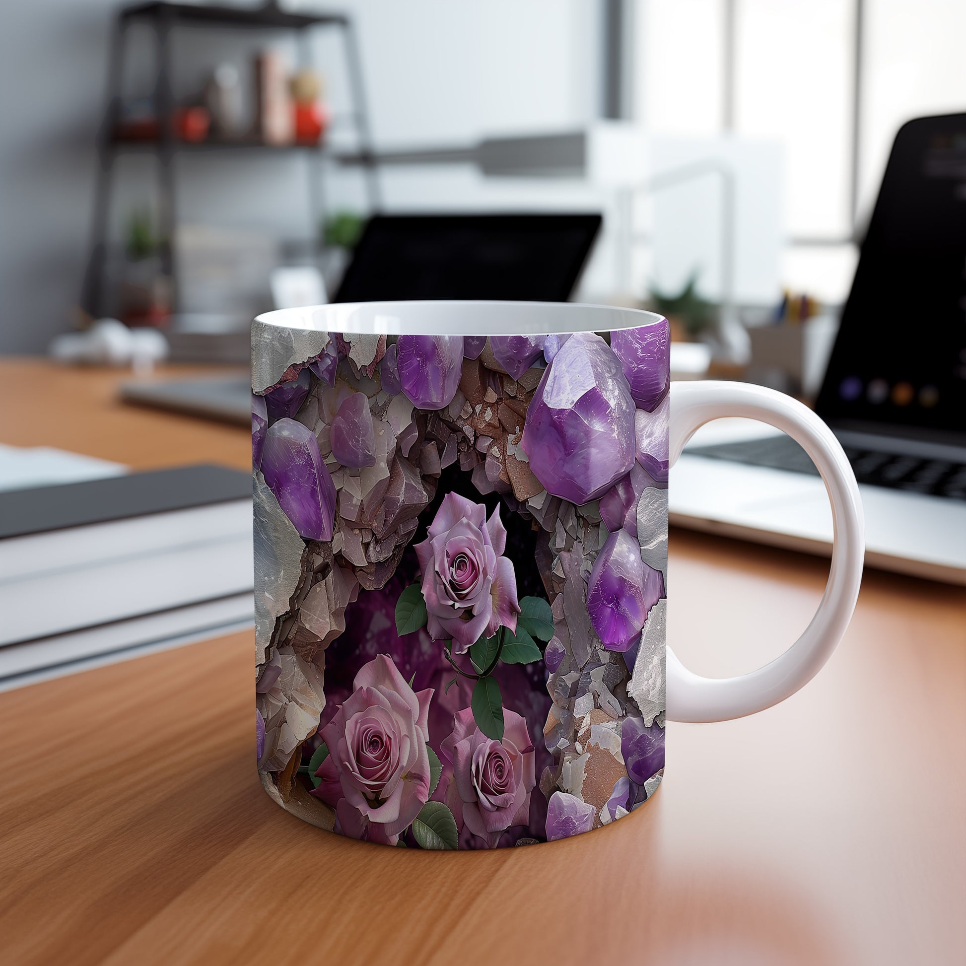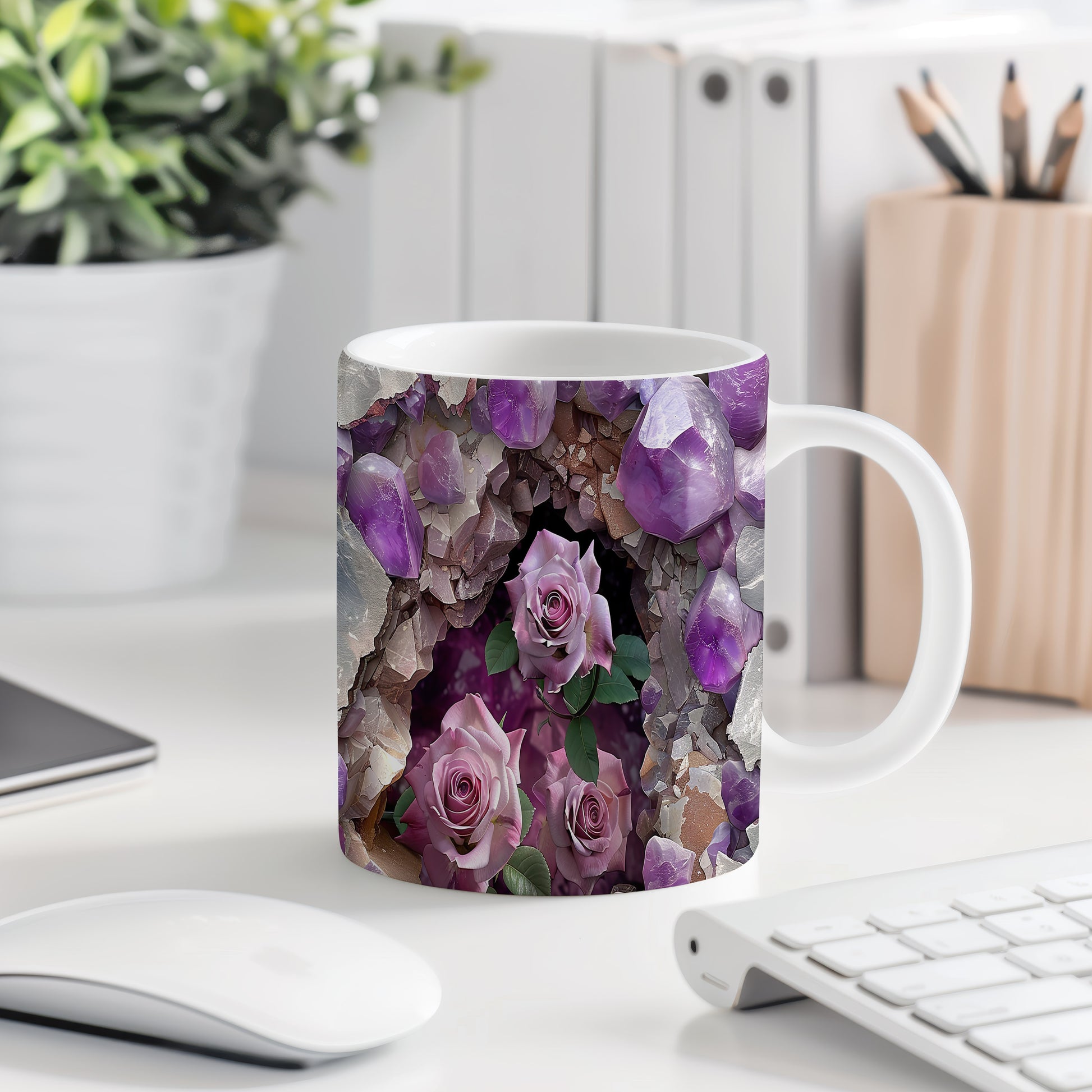Elegantní hrnek s motivem růží a ametystových krystalů. Tento stylový kousek je ideální pro milovníky přírody a květin, skvěle se hodí jako dárek pro blízké. Materiál: keramika. Objem: 330 ml. Vhodné do myčky i mikrovlnky. Používání tohoto hrnku přináší radost z každého doušku.