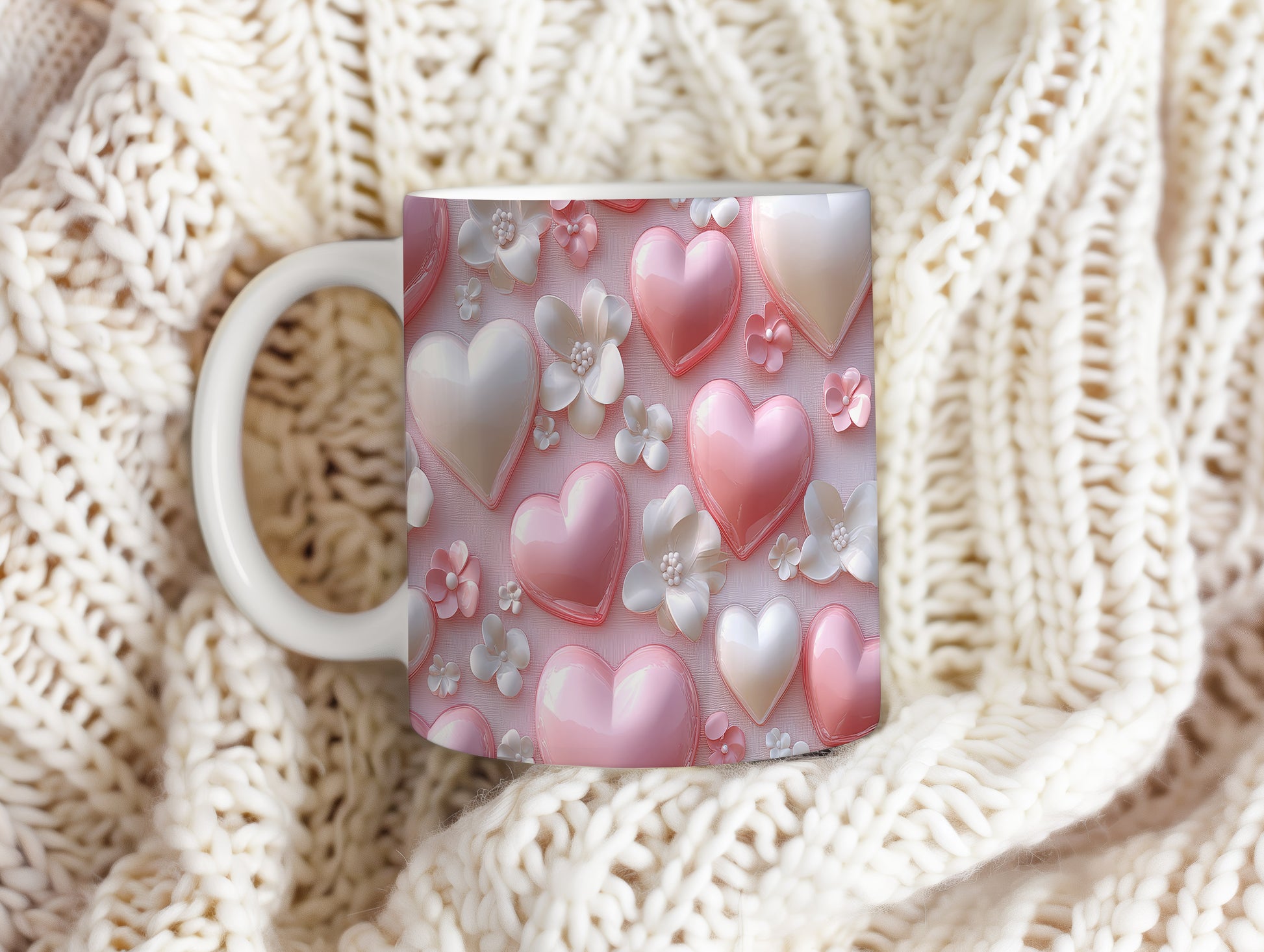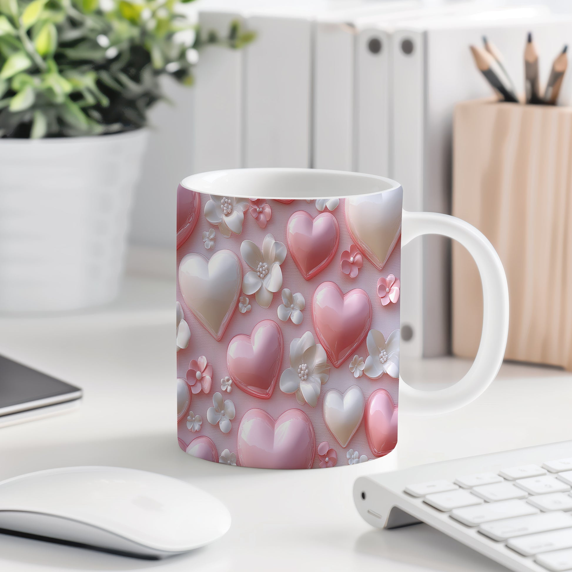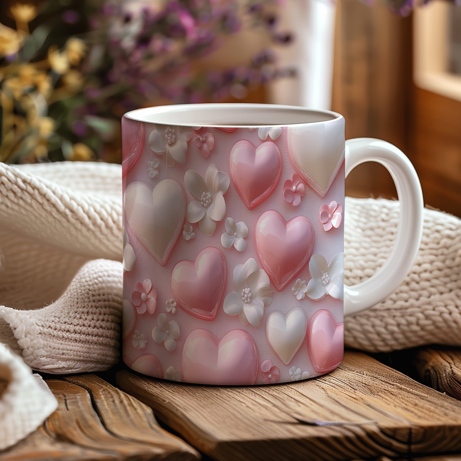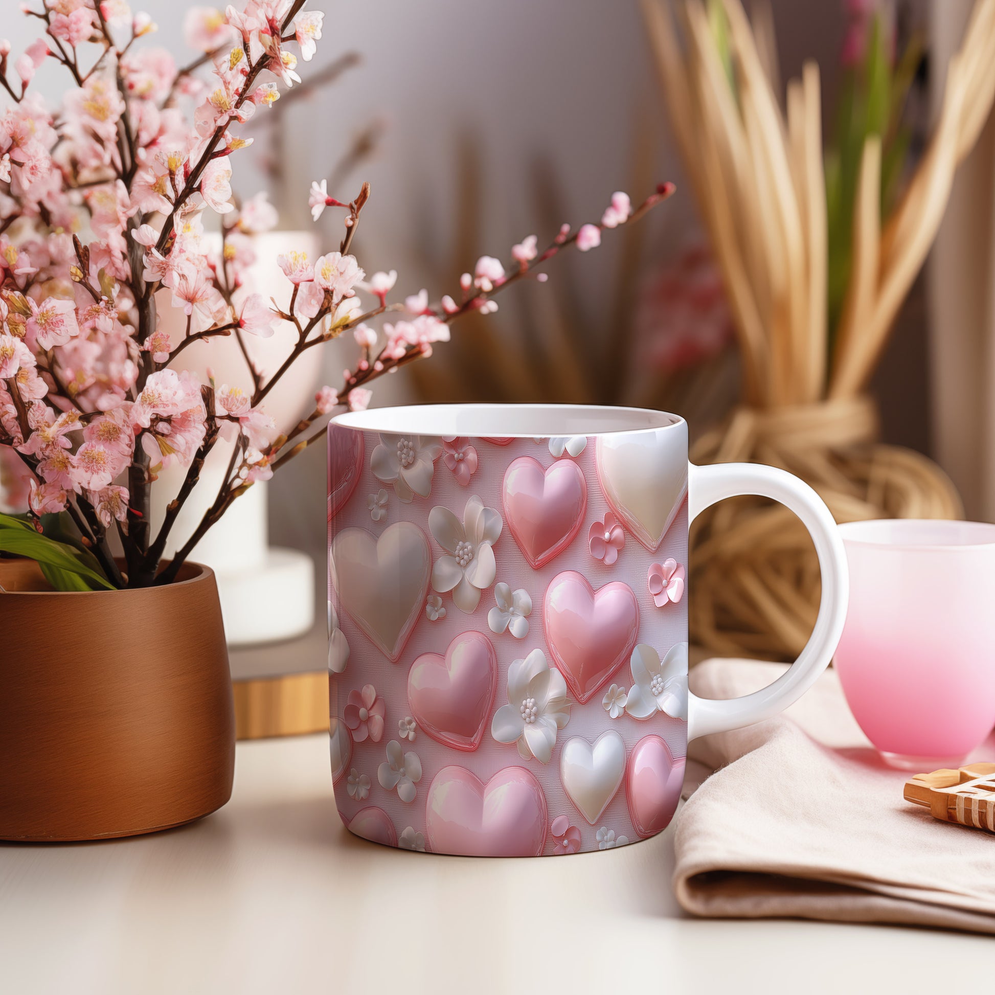 Hrnek s růžovými srdíčky a květinami