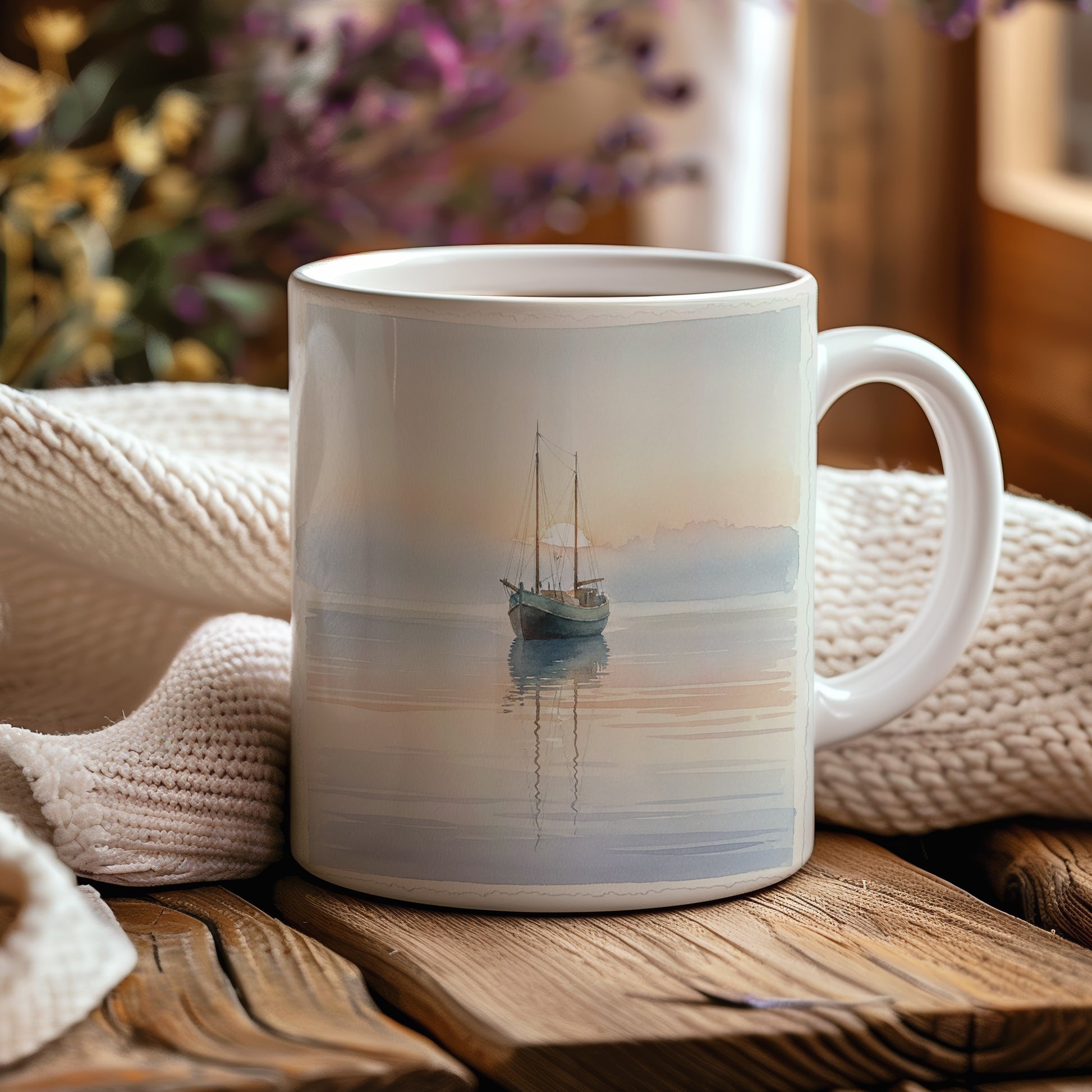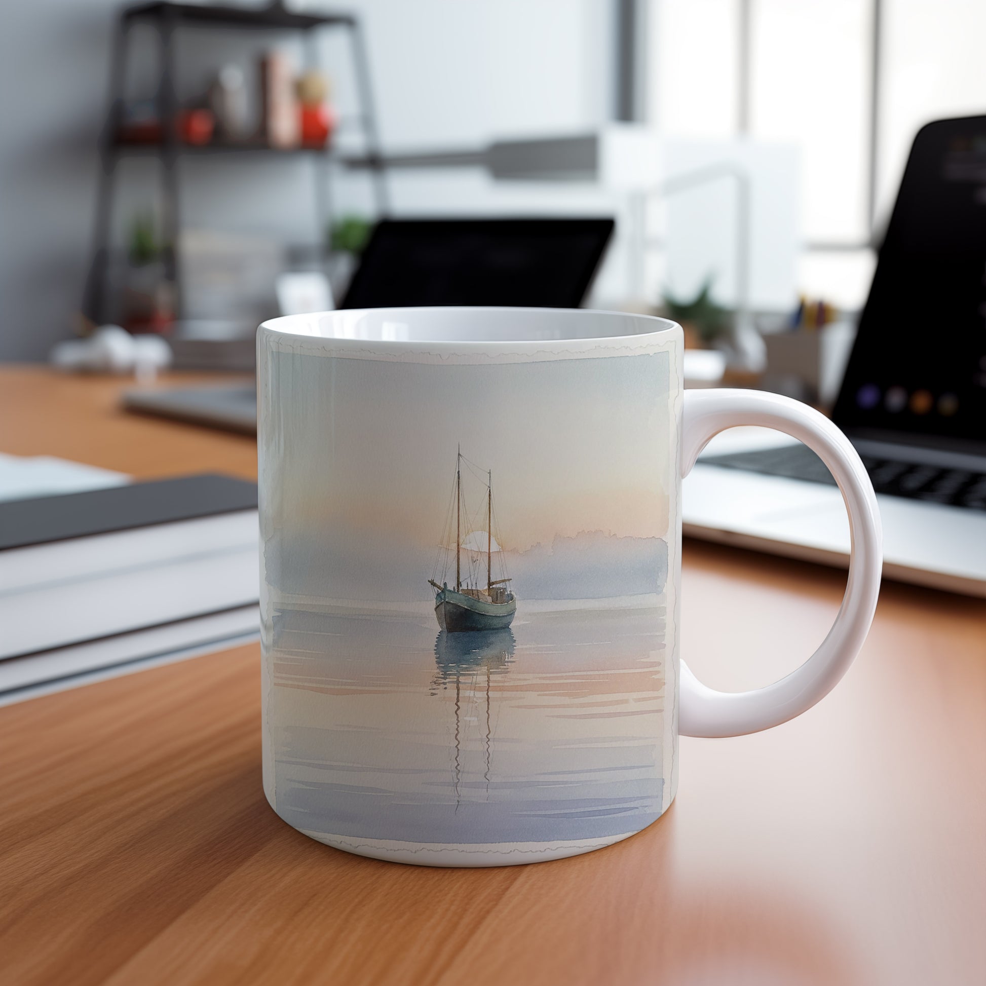 Objevte kouzlo klidného rána s rybářskou lodí na hladině. Jemný akvarel zachycuje tichou atmosféru. Hrnek 330 ml – vhodný do myčky i mikrovlnky.