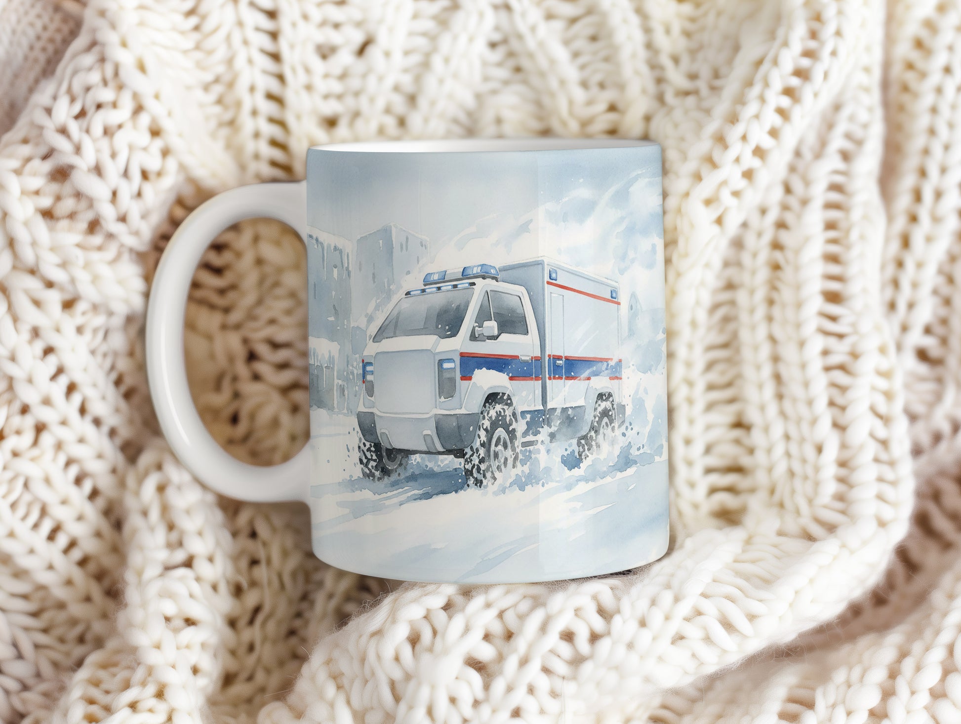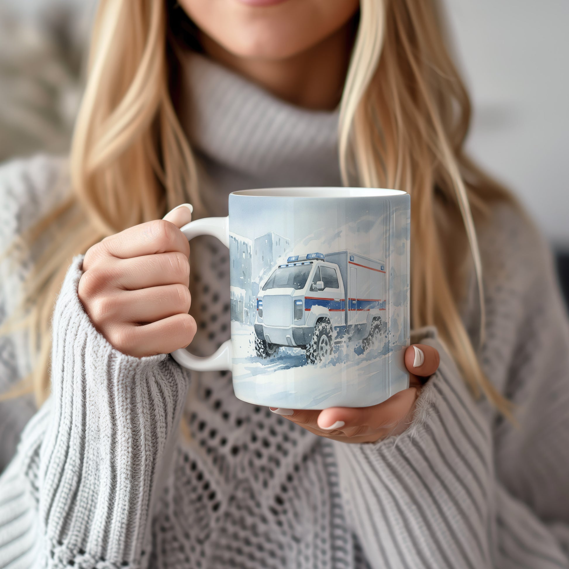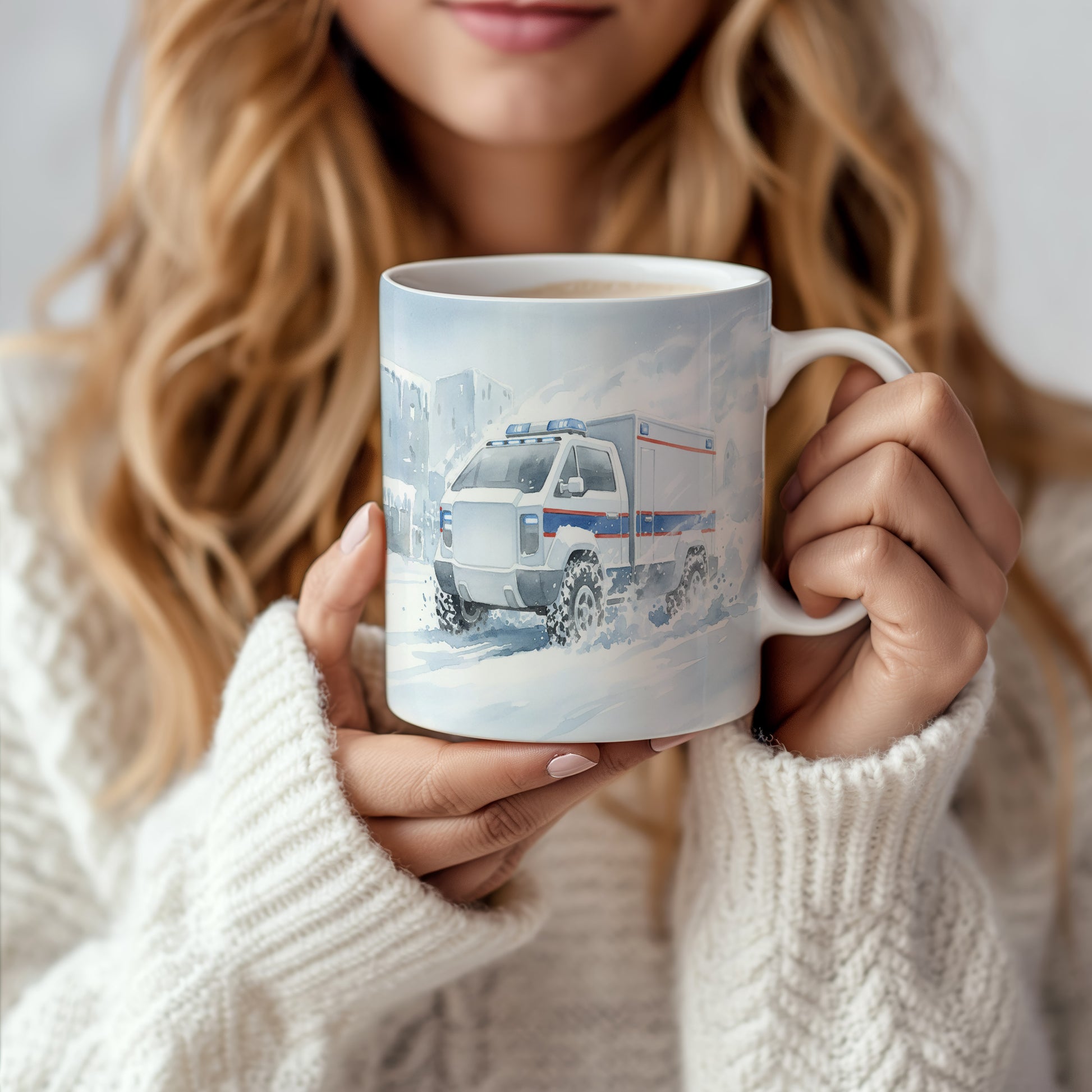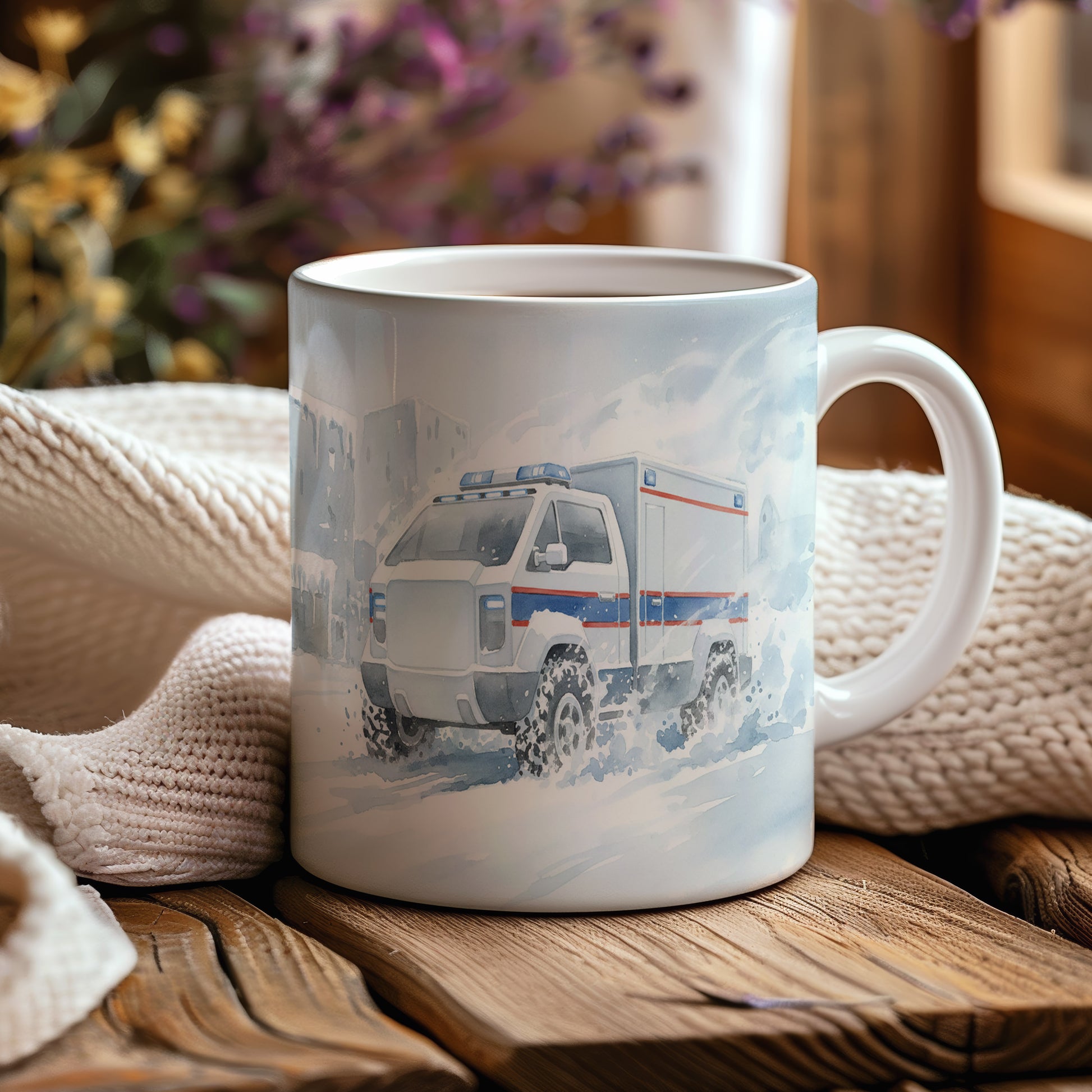 Objevte kouzlo zimní jízdy s hrnkem s akvarelovým motivem terénní sanitky proplétající se sněhem. Hrnek 330 ml – vhodný do myčky i mikrovlnky.
