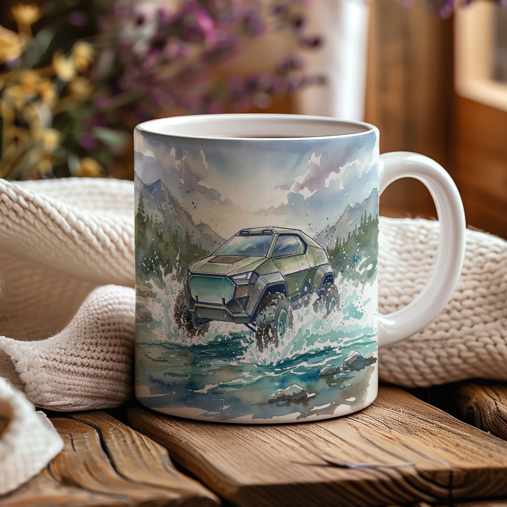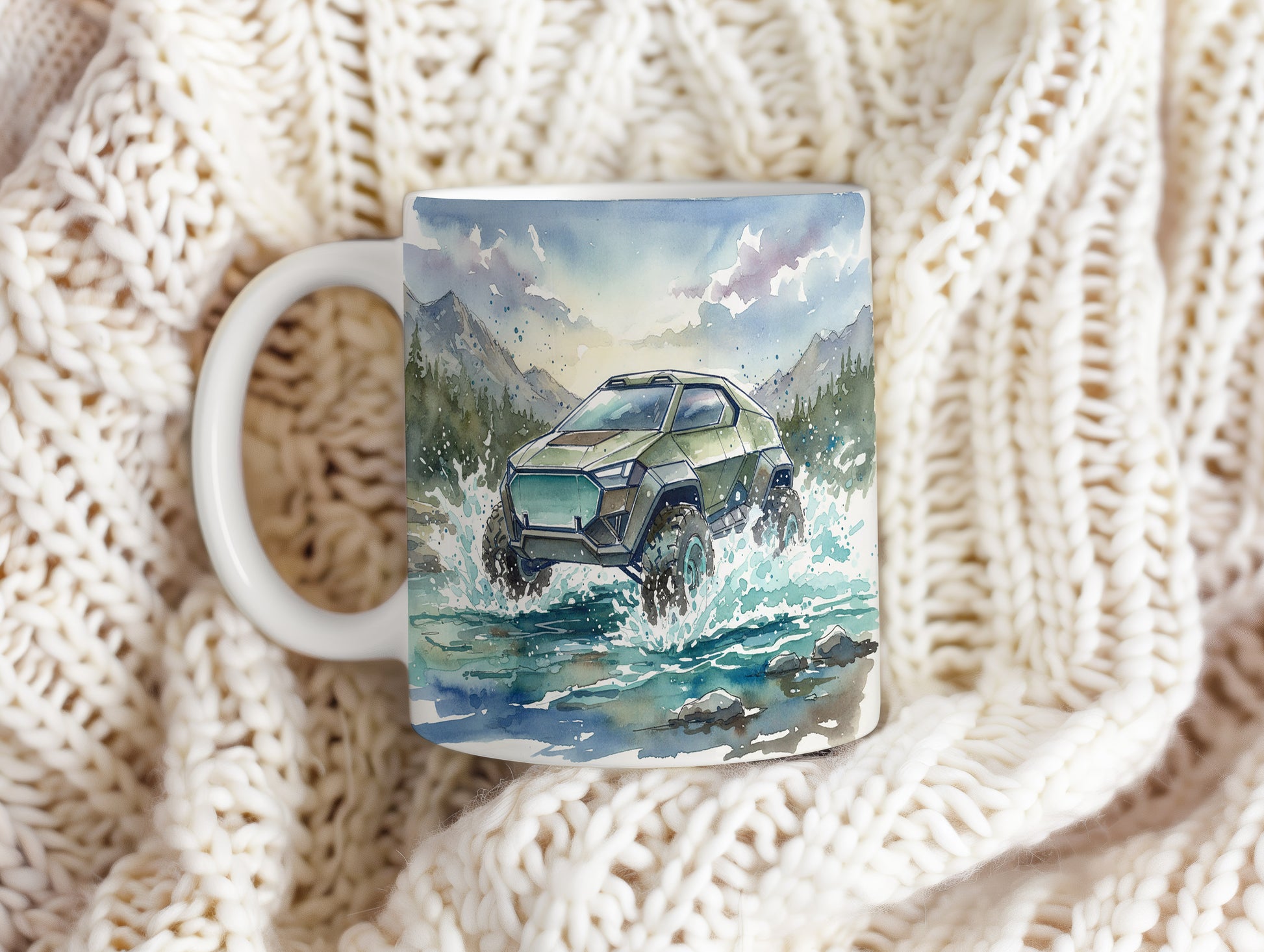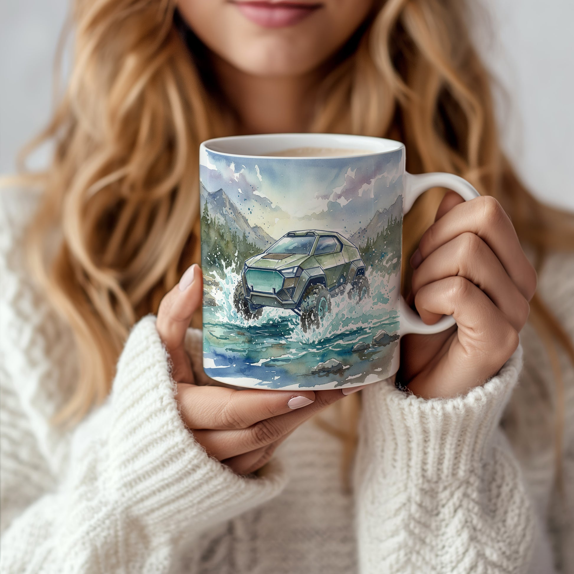 Objevte dobrodružství s hrnkem, na kterém je akvarelový motiv terénního vozu překonávajícího divokou řeku. Ideální pro milovníky off-road zážitků. Hrnek 330 ml – vhodný do myčky i mikrovlnky.