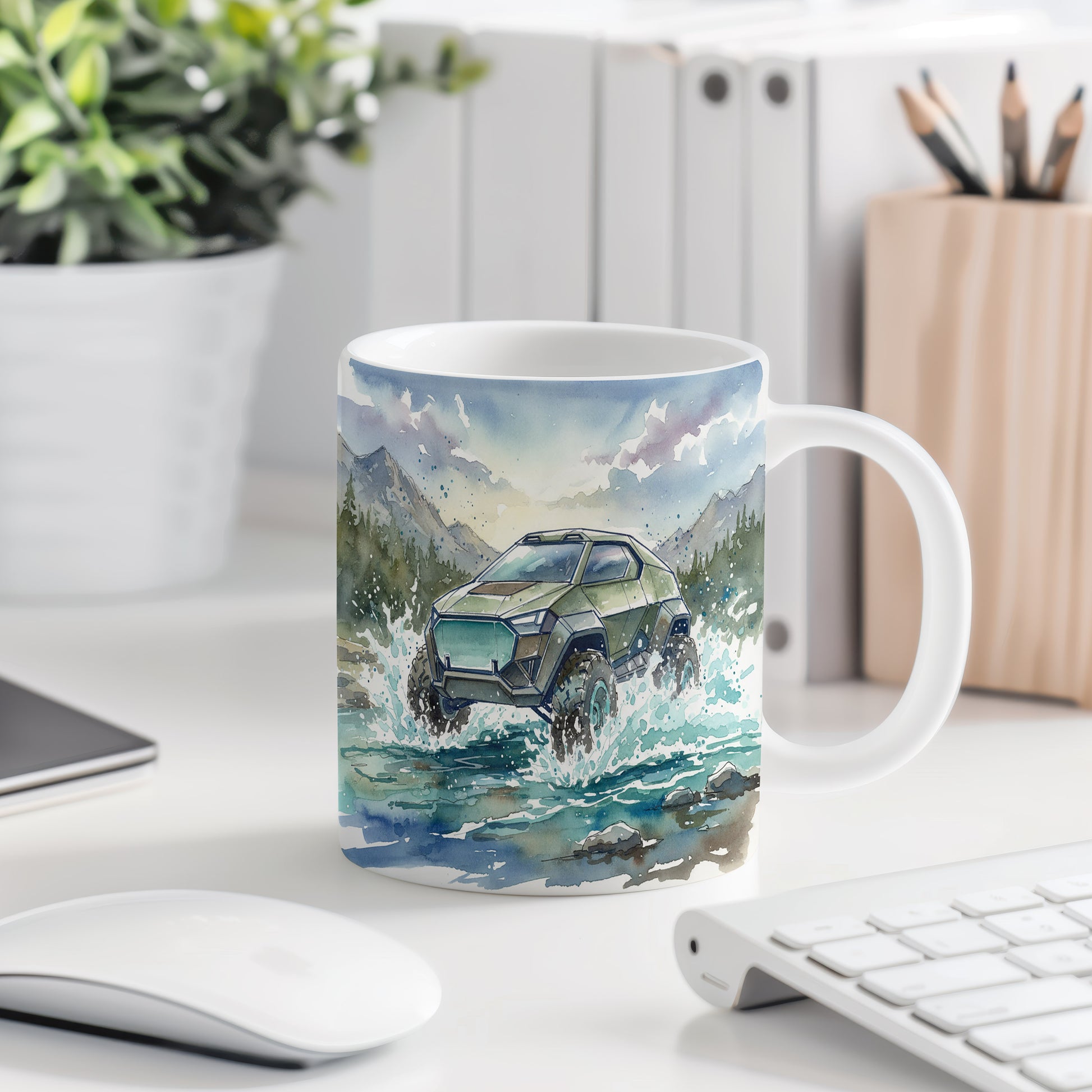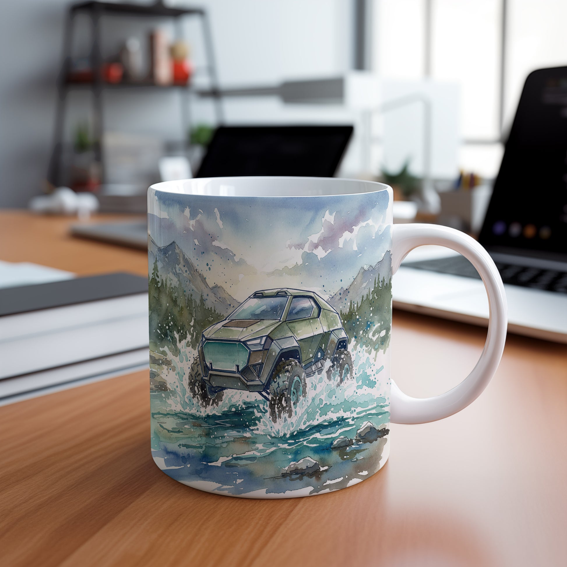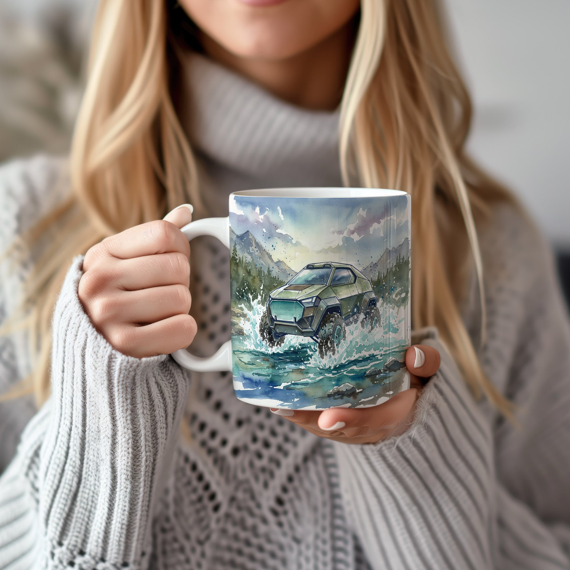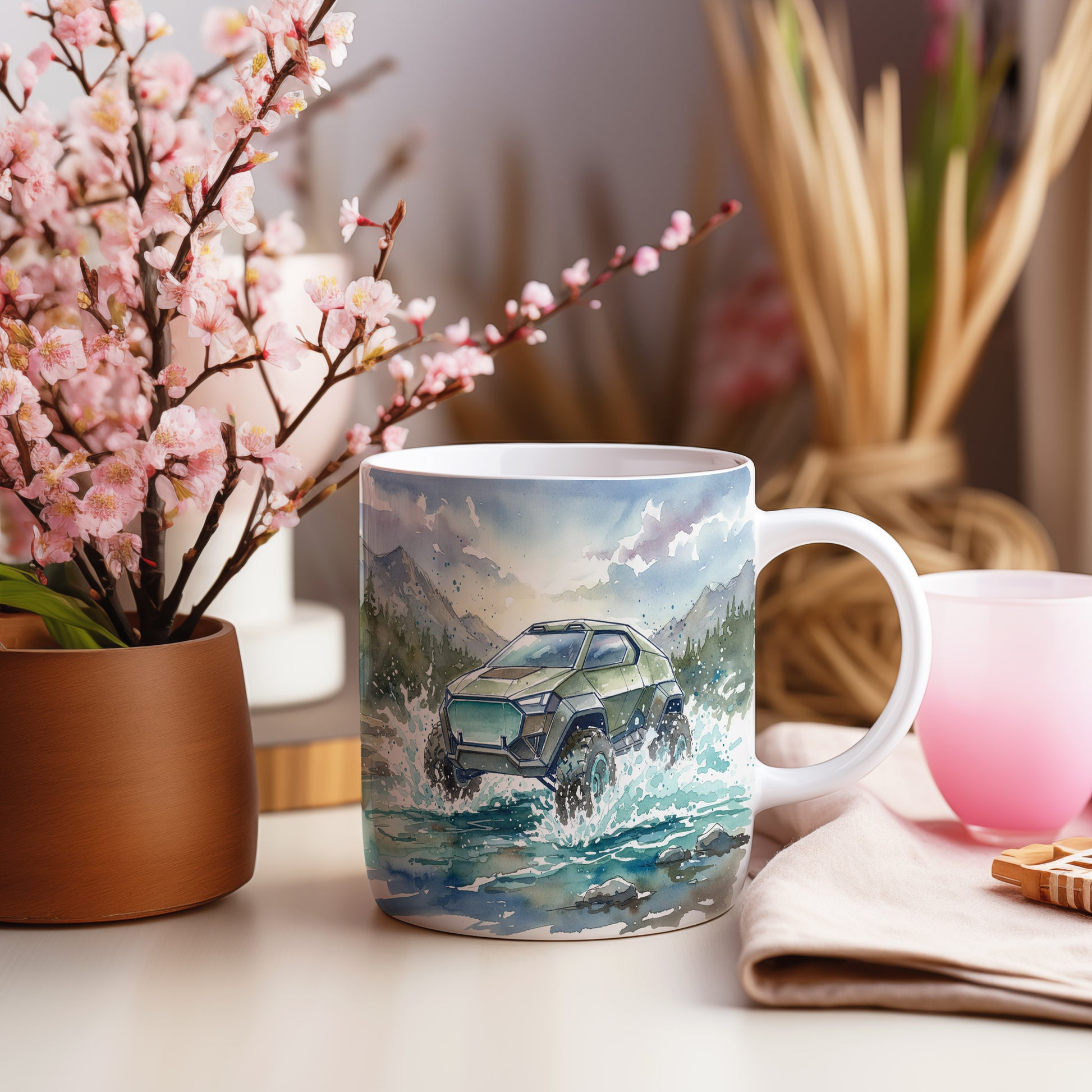 Objevte dobrodružství s hrnkem, na kterém je akvarelový motiv terénního vozu překonávajícího divokou řeku. Ideální pro milovníky off-road zážitků. Hrnek 330 ml – vhodný do myčky i mikrovlnky.