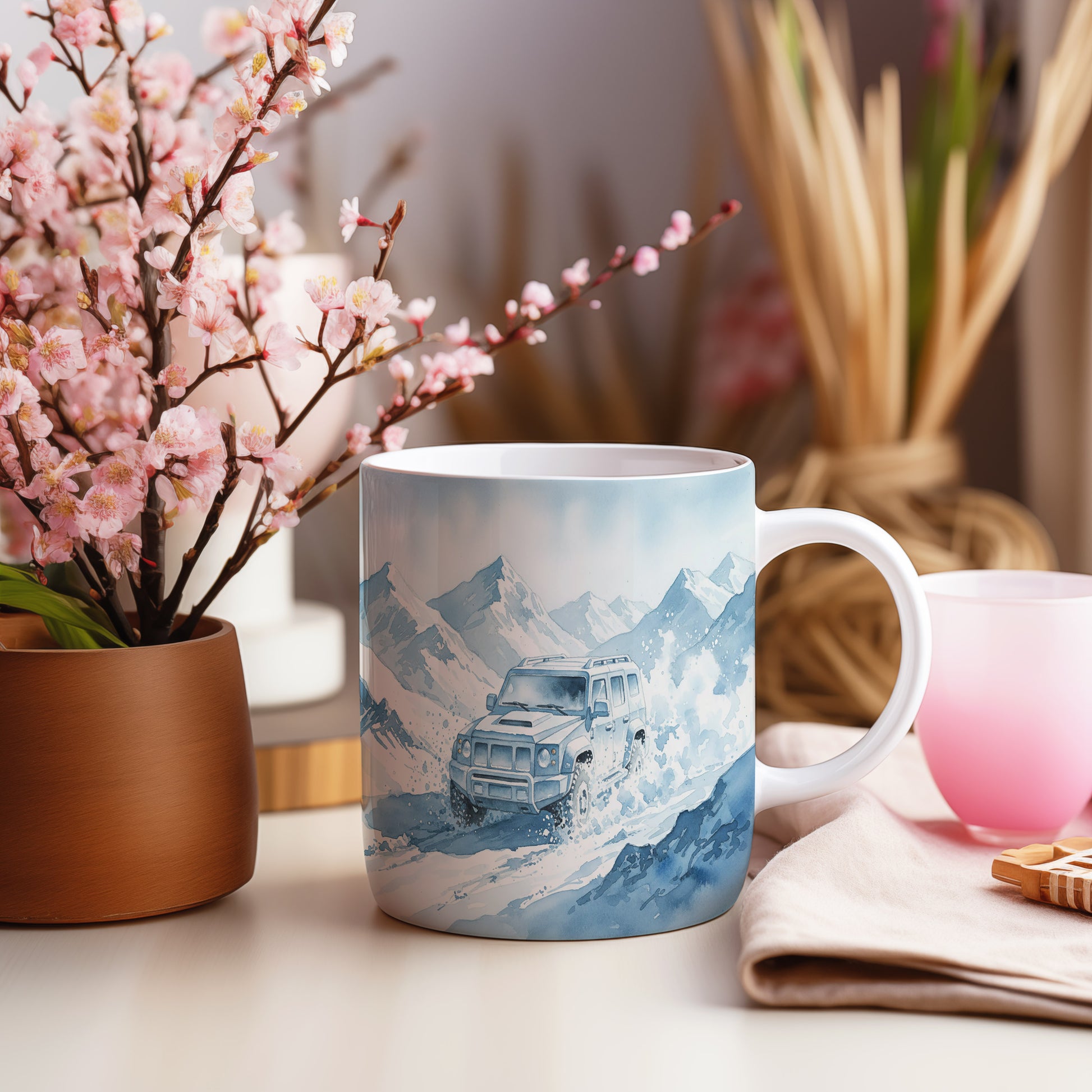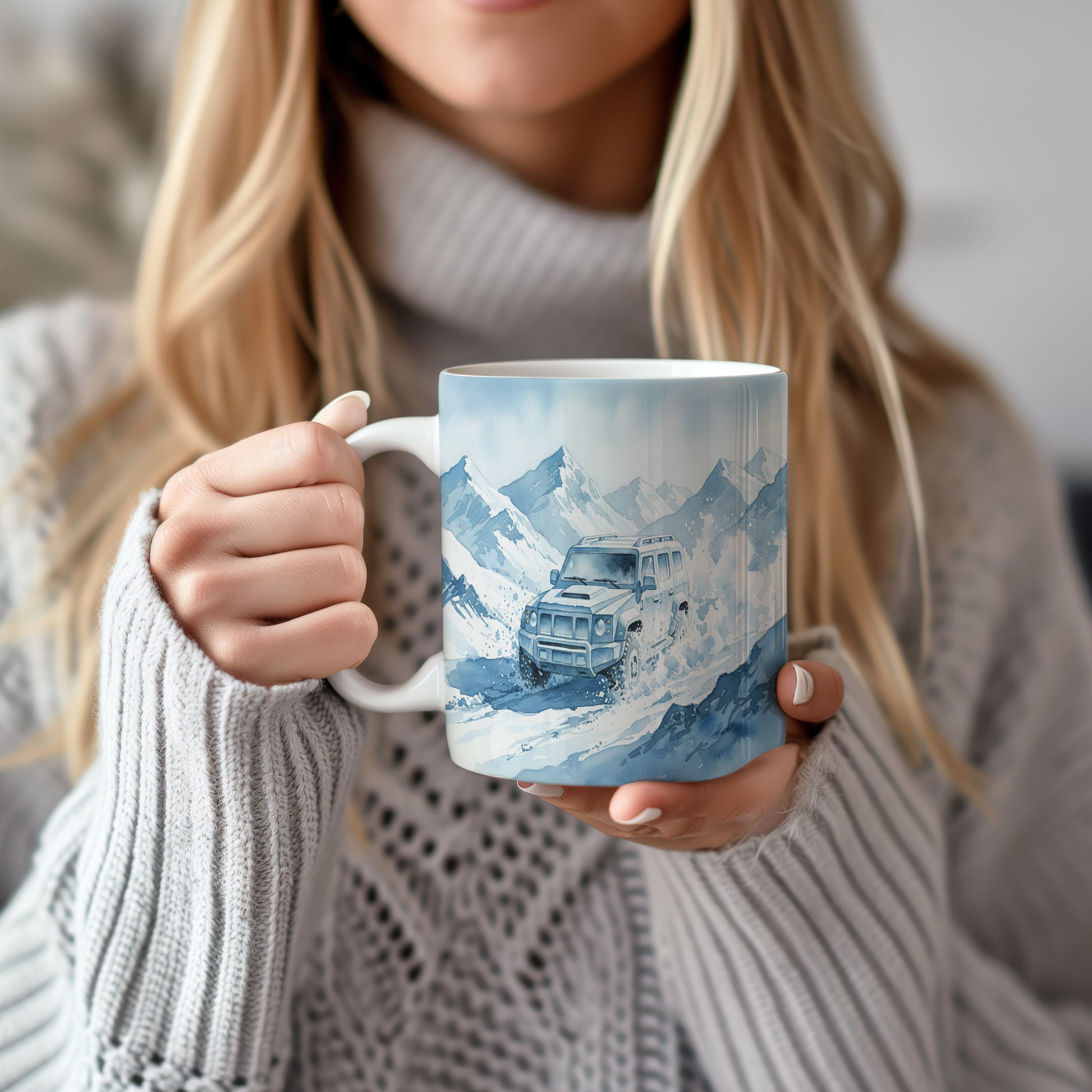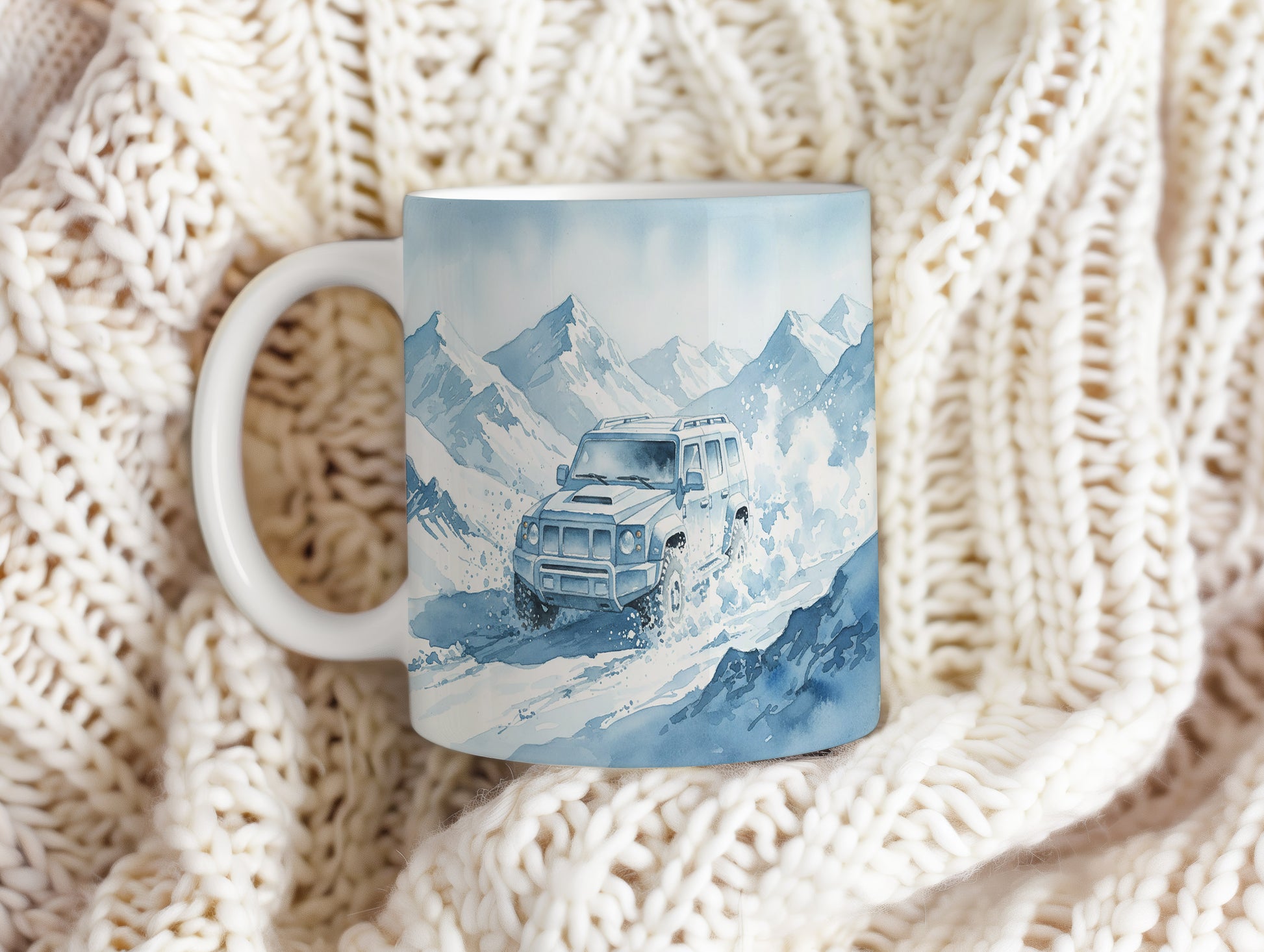 Objevte adrenalinovou jízdu terénním vozem v zasněžených horách. Akvarelový motiv zachycuje sílu a dynamiku této scény. Hrnek 330 ml – vhodný do myčky i mikrovlnky.