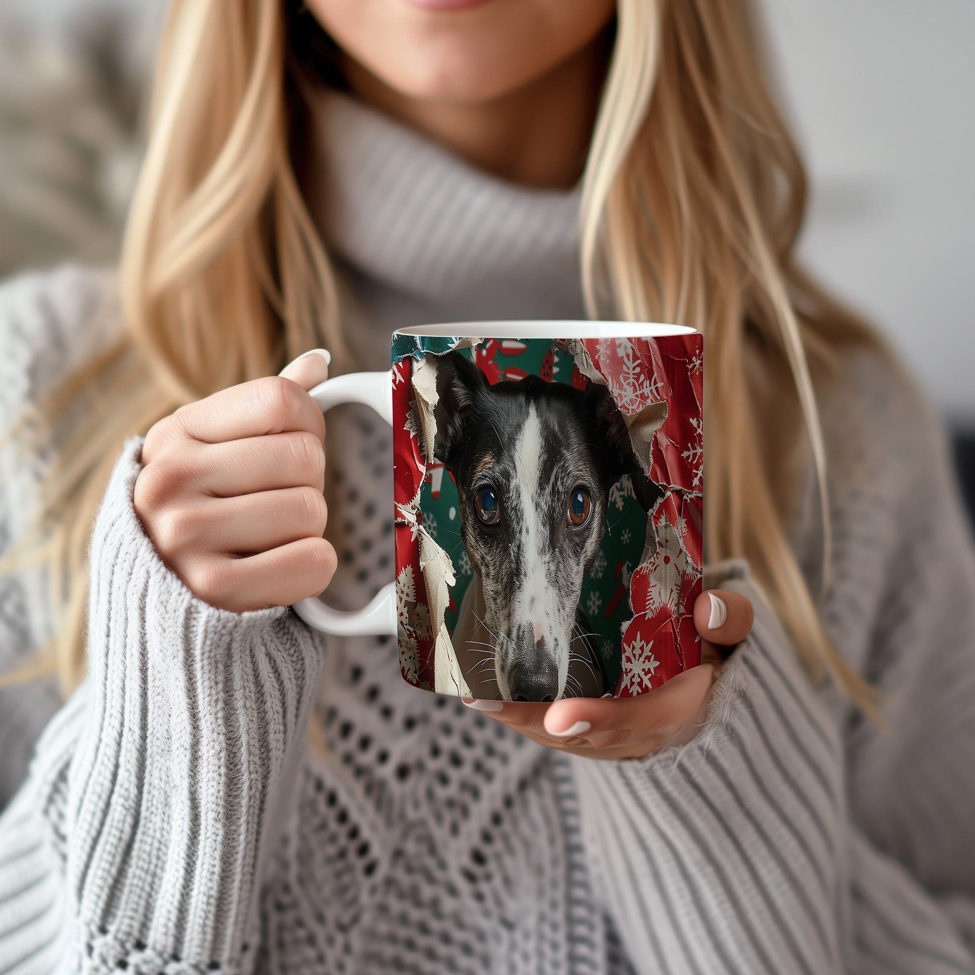 Hrnek s motivem roztomilého psa, který vyhlíží skrze dárek, je ideální pro milovníky zvířat a vánoční atmosféru. Skvělý tip na dárek pro přátele nebo rodinu. Materiál: keramika. Objem: 330 ml. Vhodné do myčky i mikrovlnky. Tento hrnek přináší radost a útulnost do každého dne.