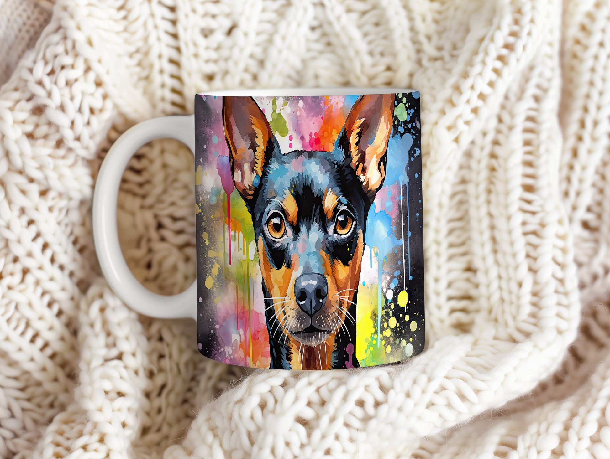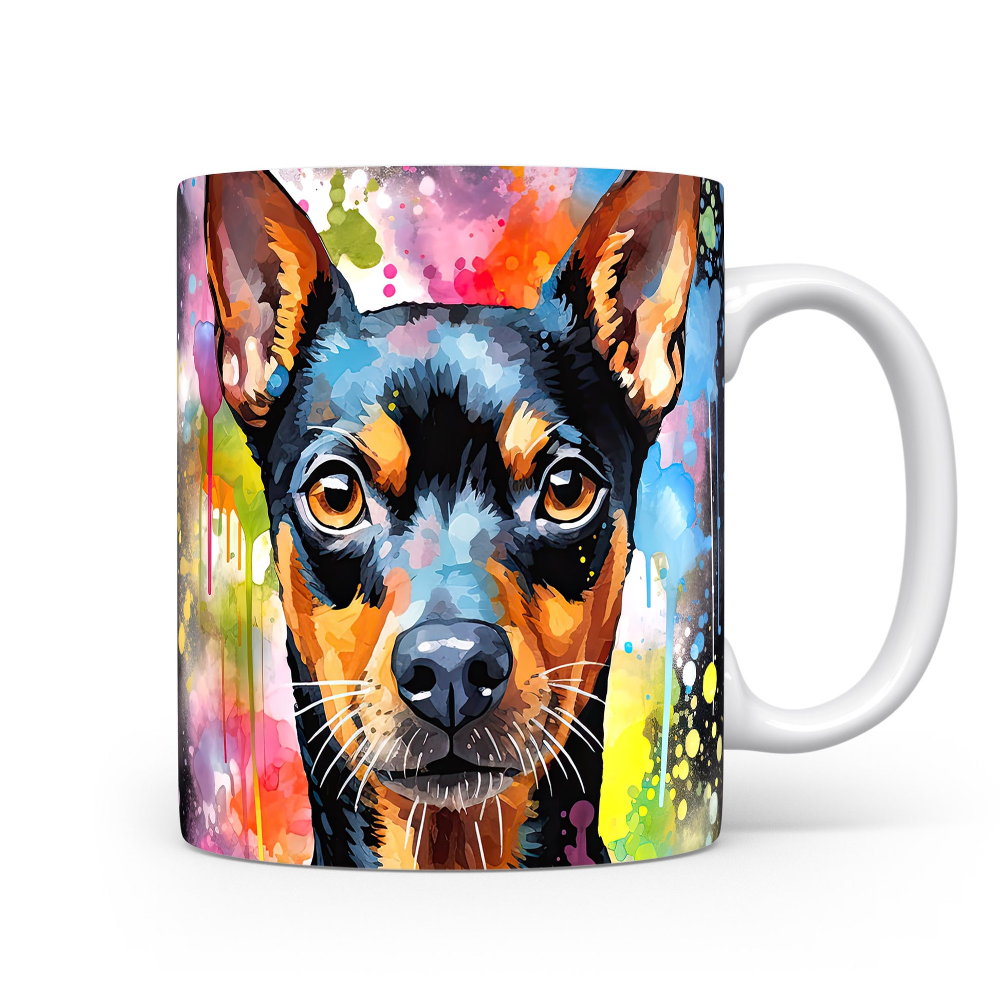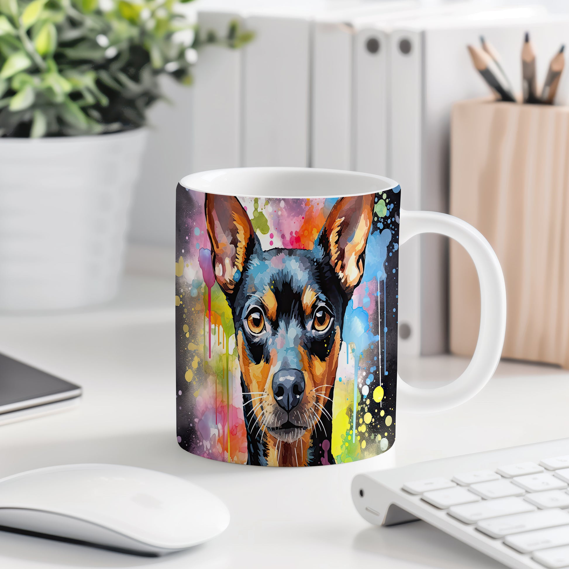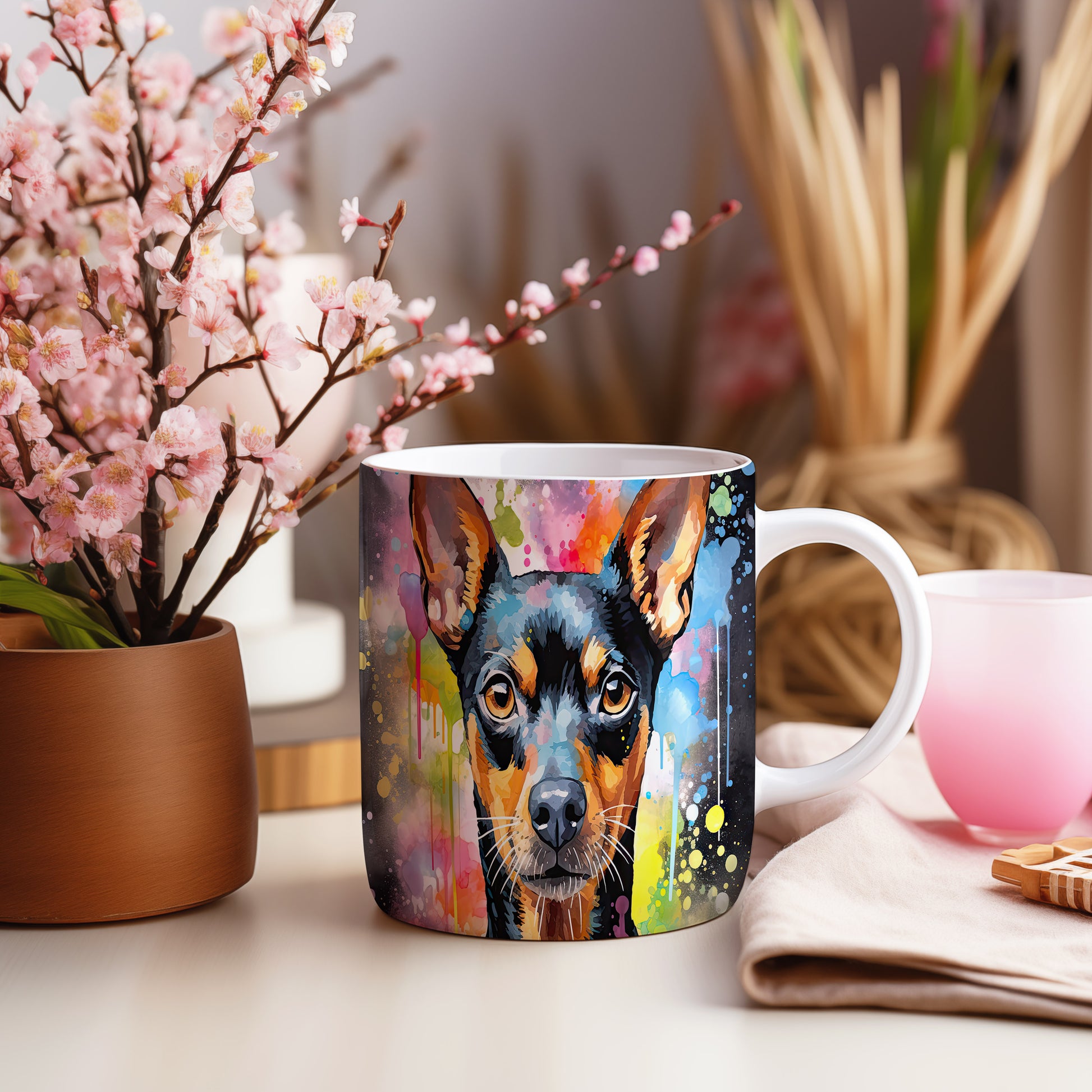 Hrnek s teriérem na barevném pozadí