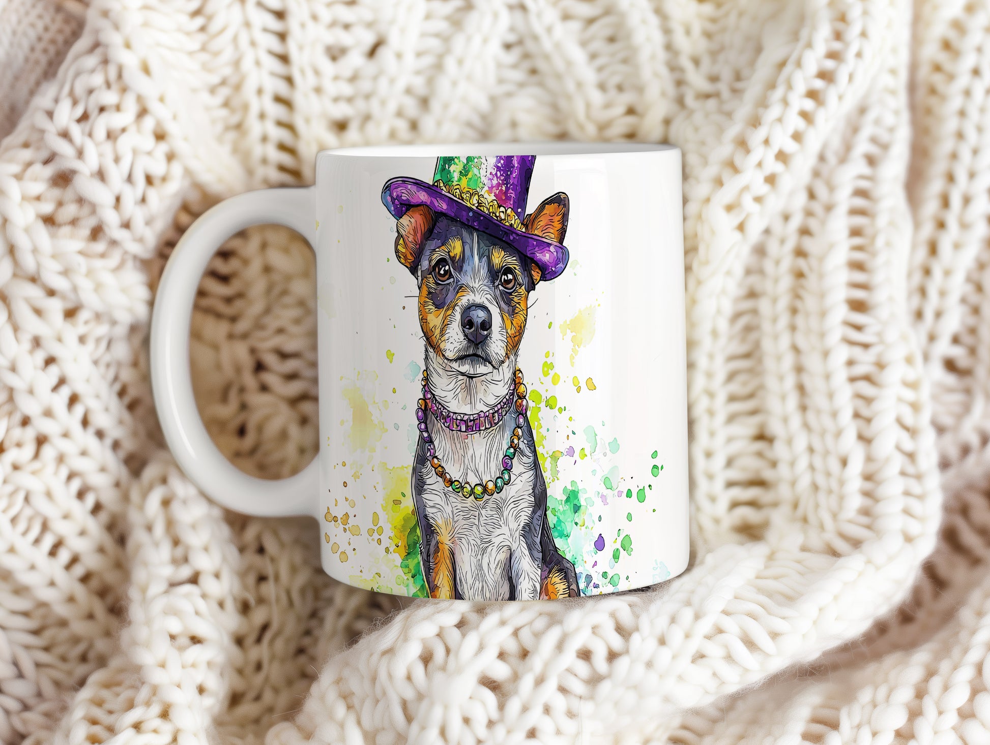 Hrnek s teriérem v klobouku a korálky