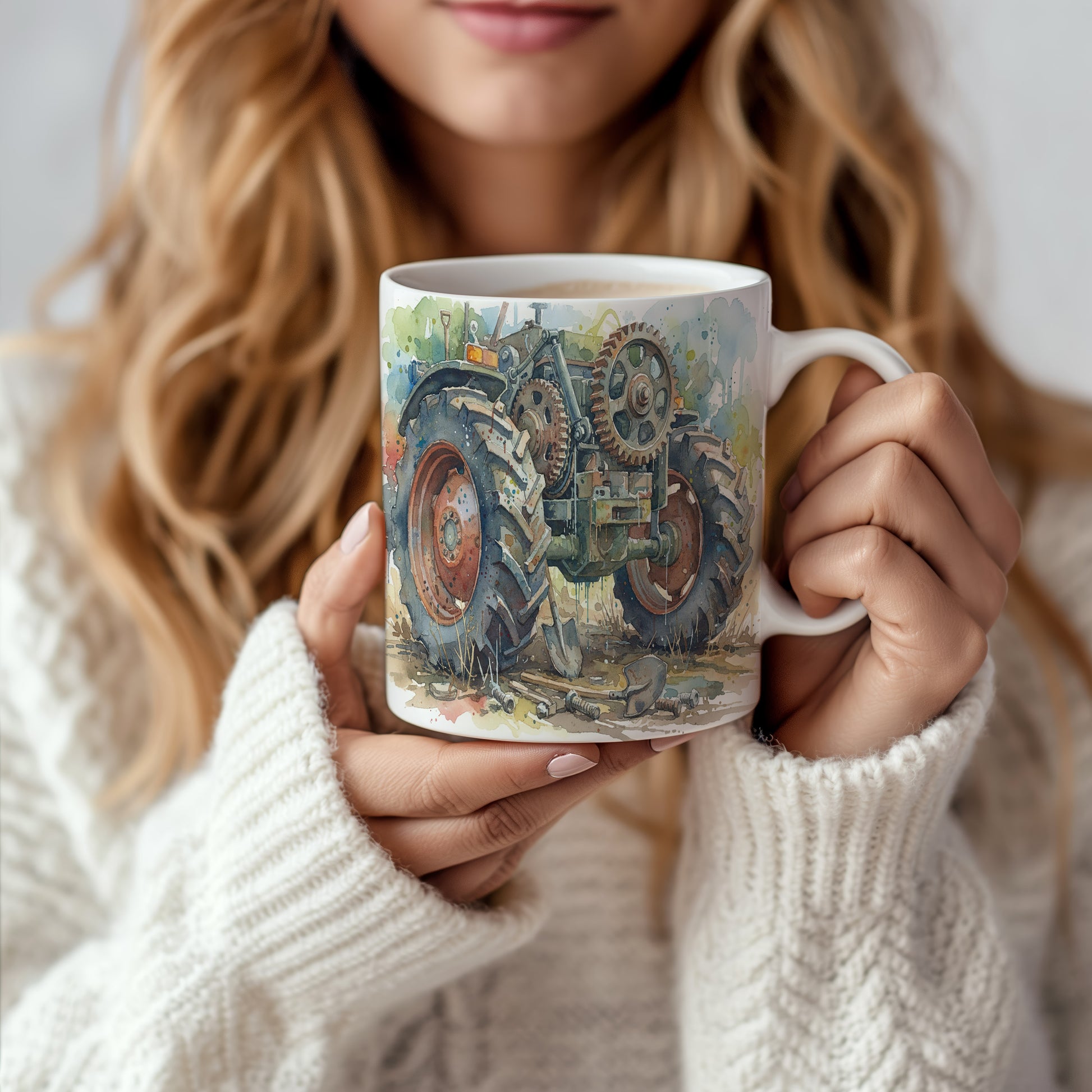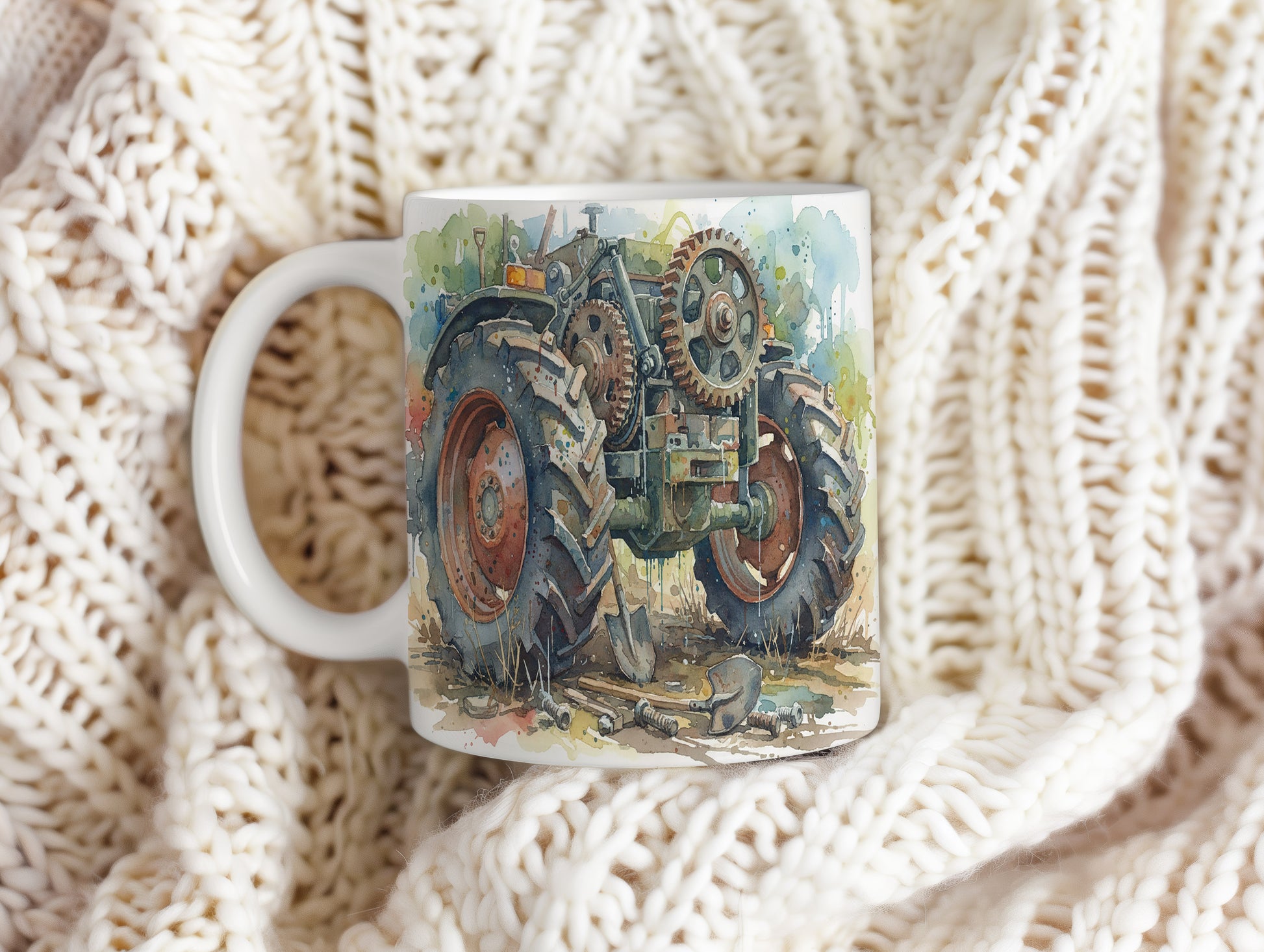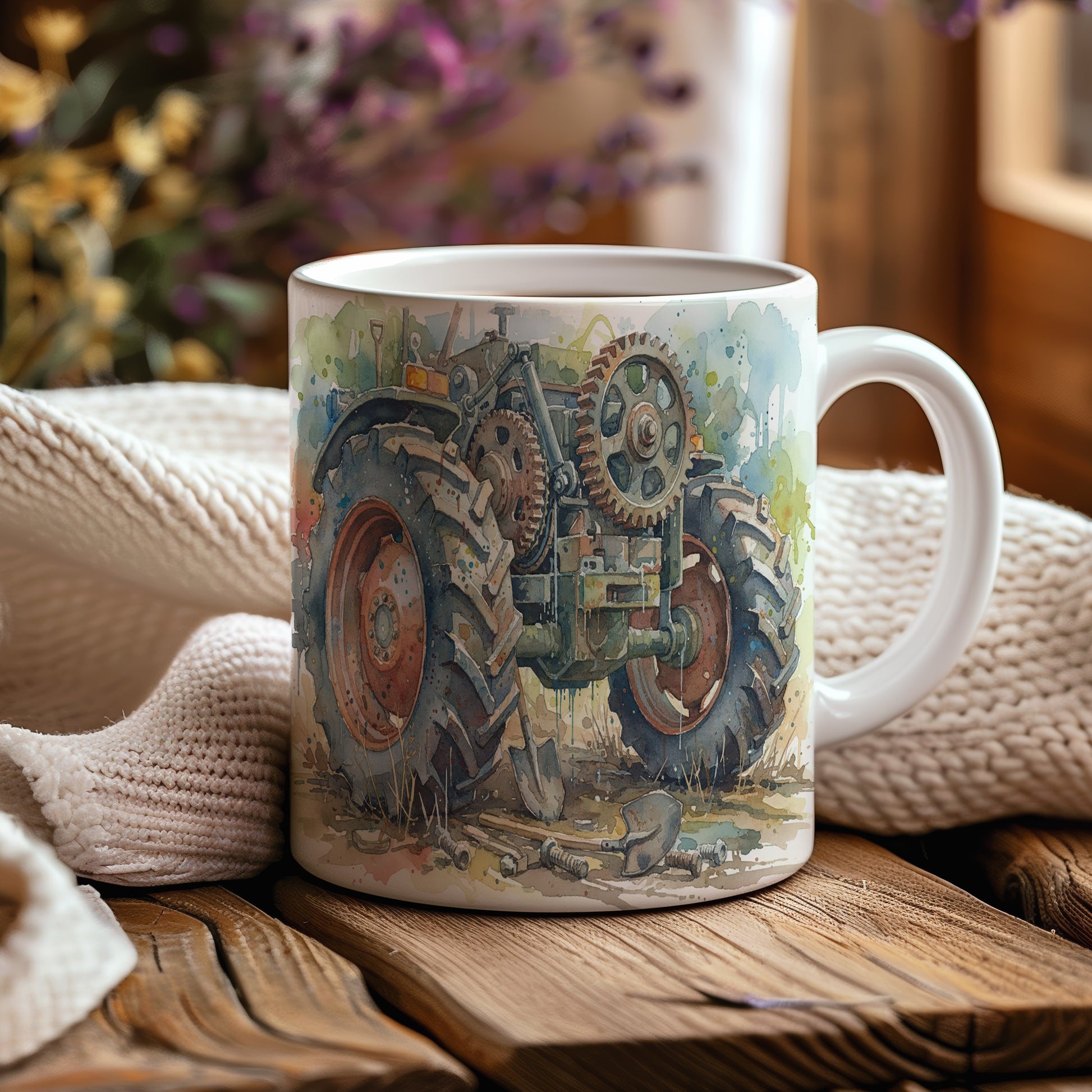 Objevte kouzlo akvarelového traktoru obklopeného nářadím. Tento hrnek přináší rustikální atmosféru na váš stůl. Hrnek 330 ml – vhodný do myčky i mikrovlnky.