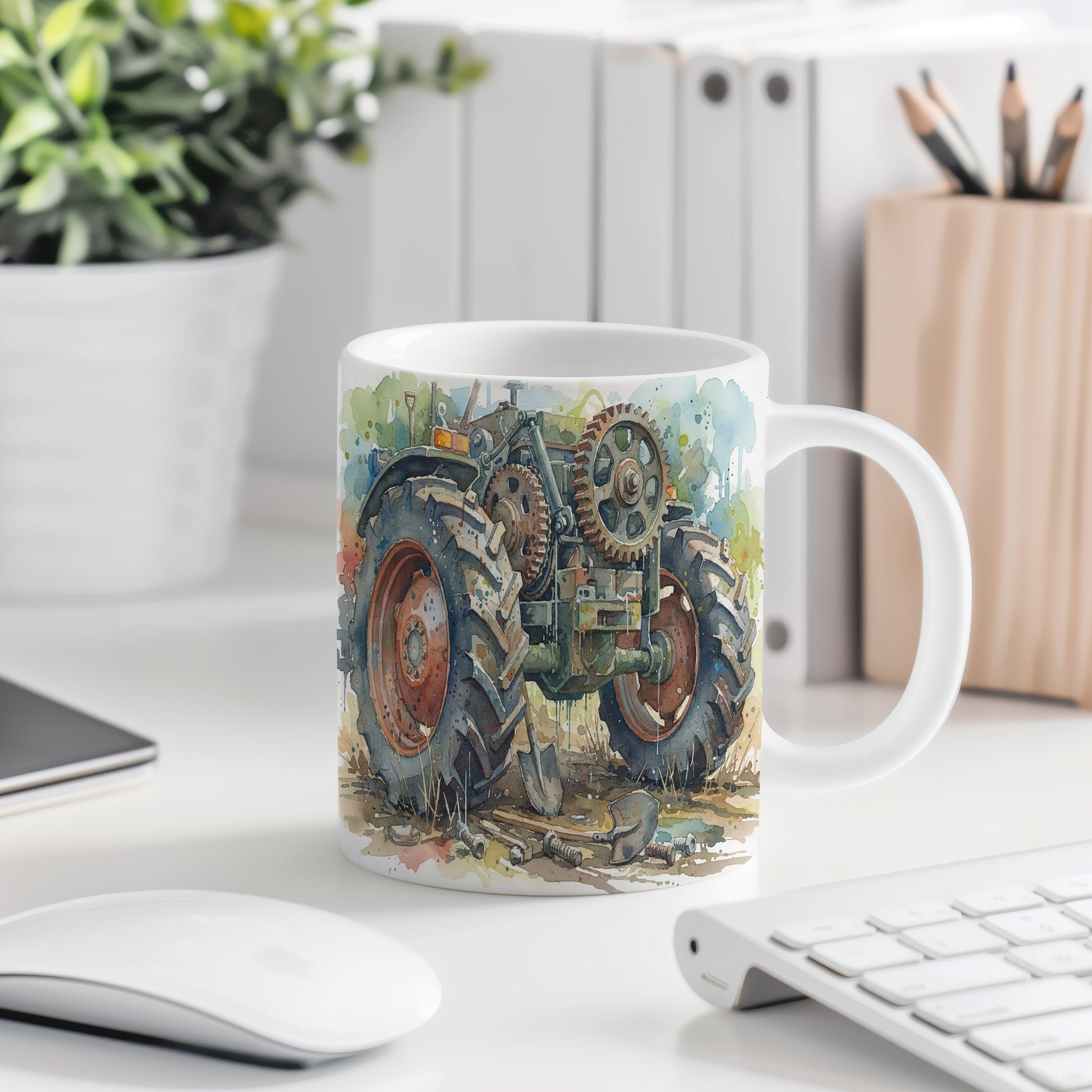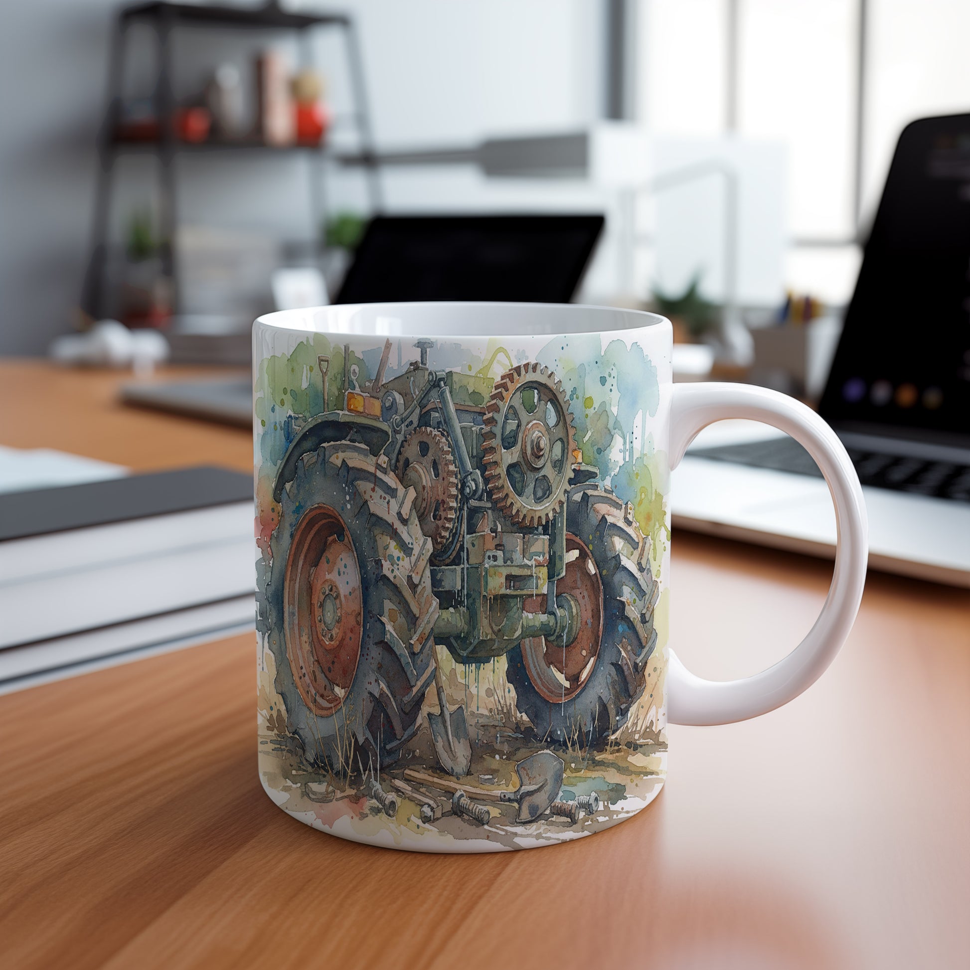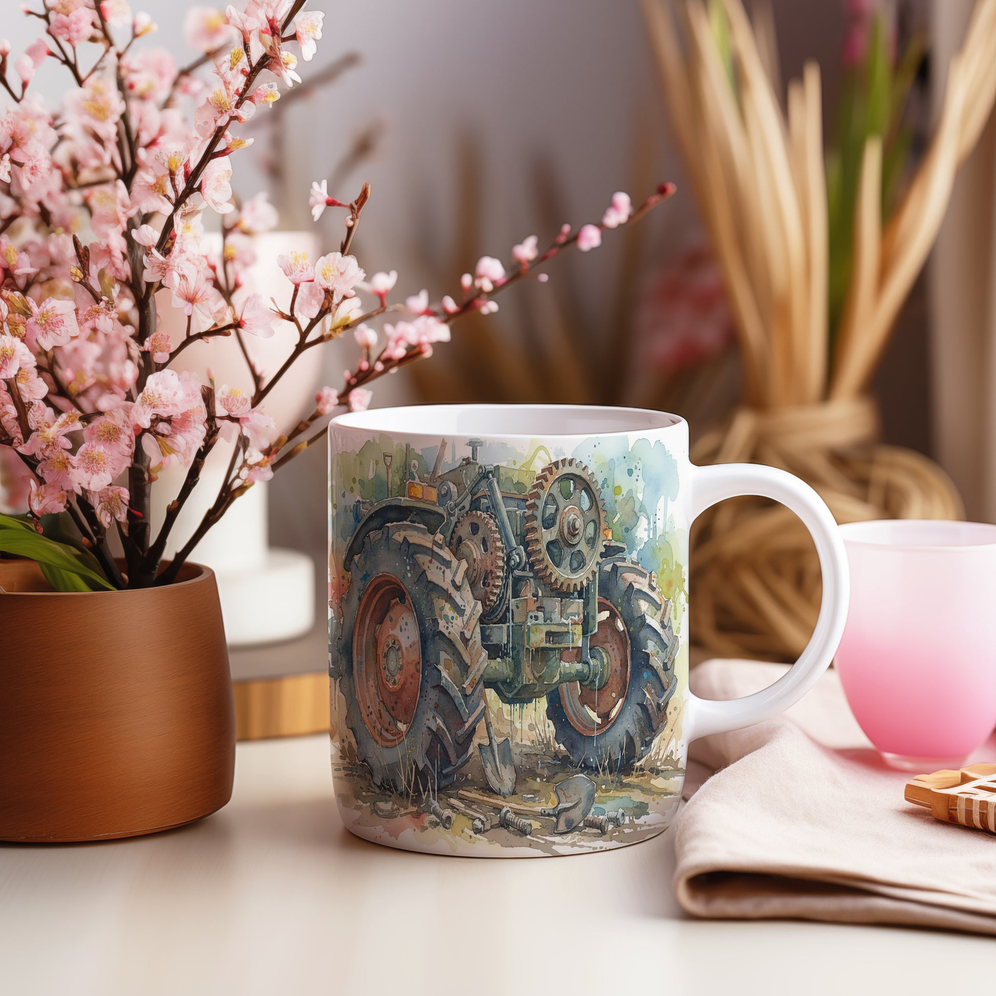 Objevte kouzlo akvarelového traktoru obklopeného nářadím. Tento hrnek přináší rustikální atmosféru na váš stůl. Hrnek 330 ml – vhodný do myčky i mikrovlnky.