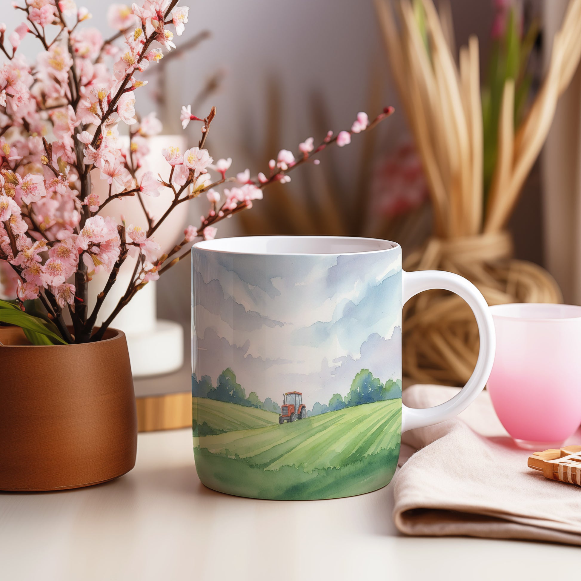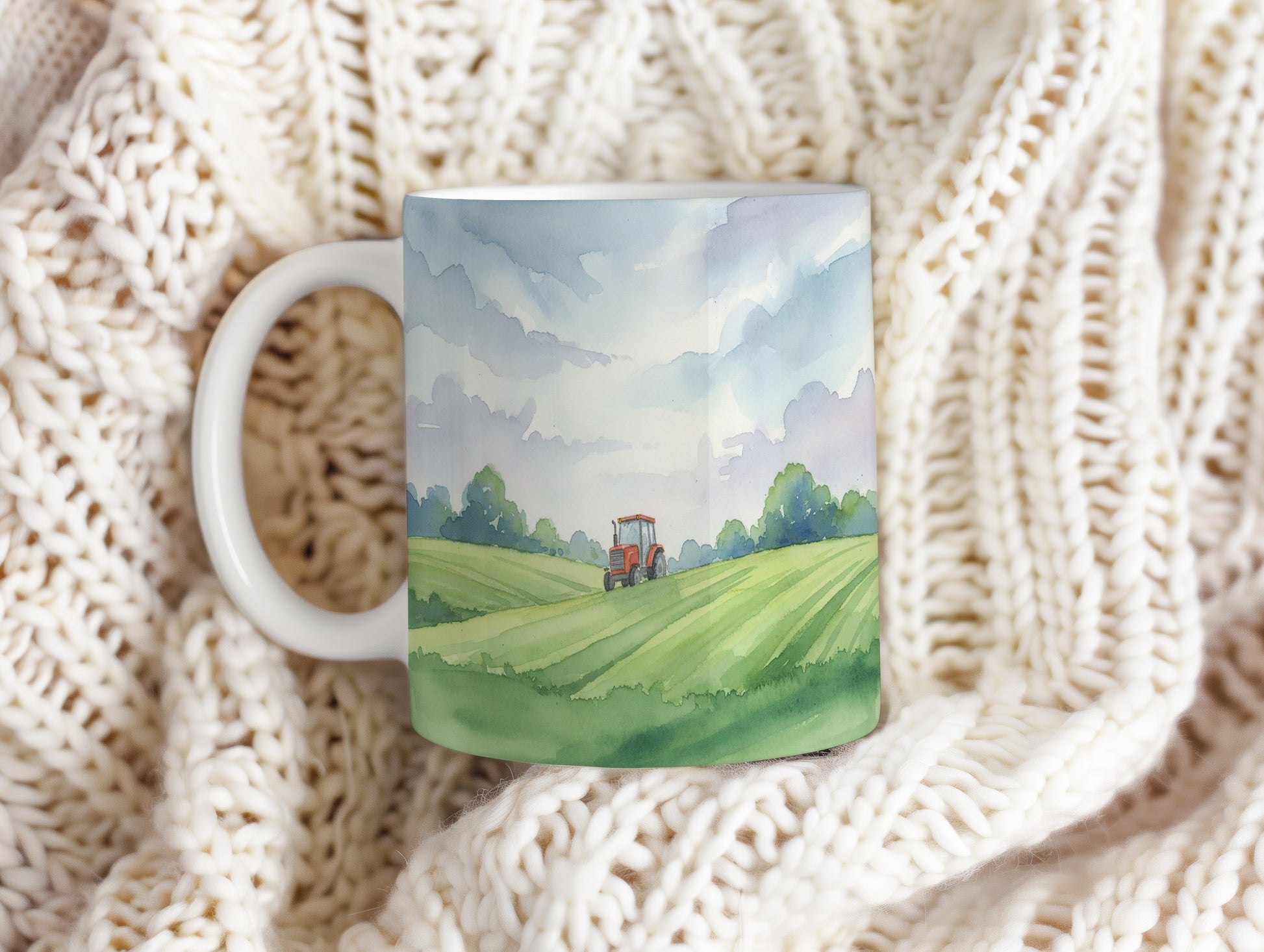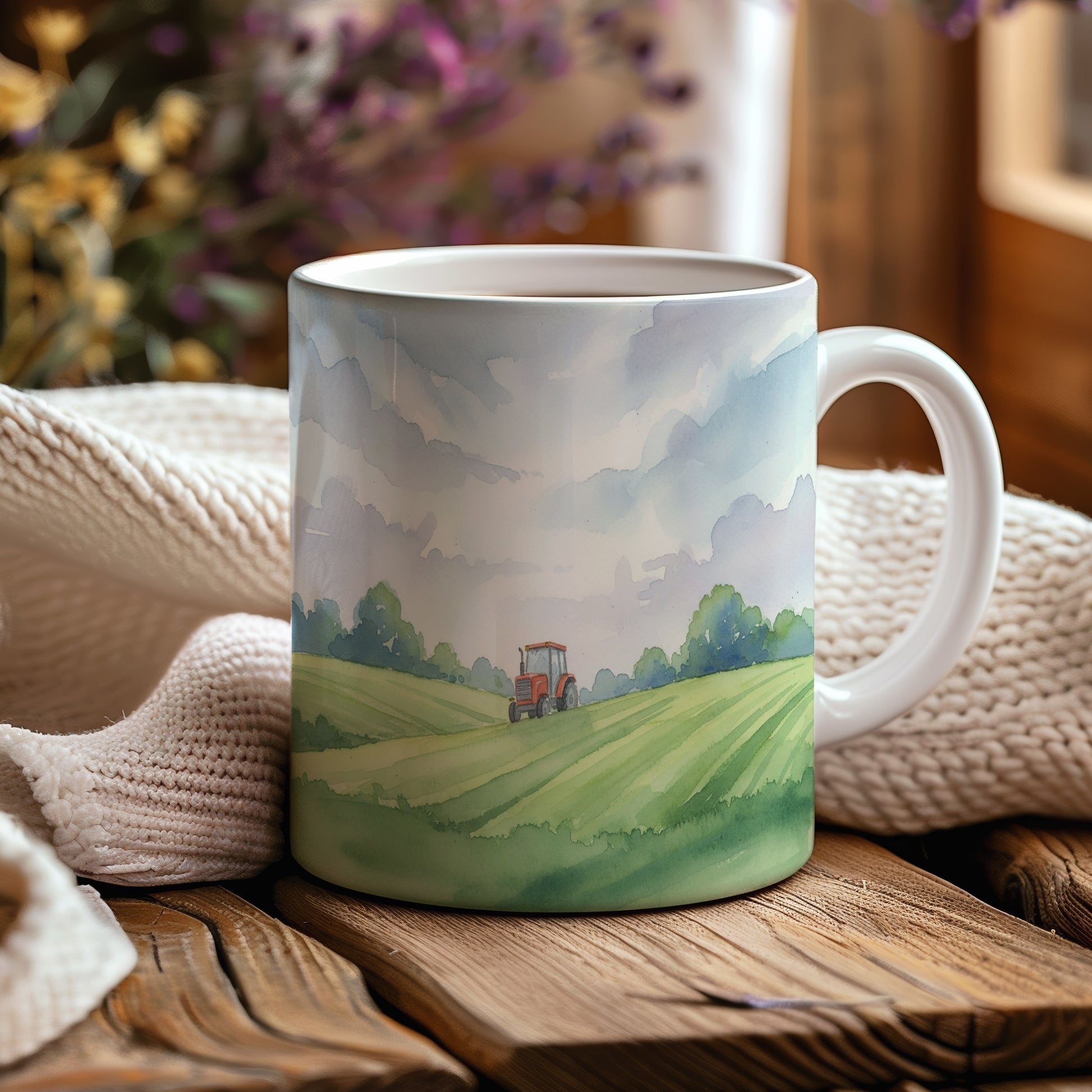Ponořte se do klidu venkova s hrnkem, který zobrazuje traktor na rozlehlé zelené louce. Jemné akvarelové detaily přinášejí pocit svobody. Hrnek 330 ml – vhodný do myčky i mikrovlnky.