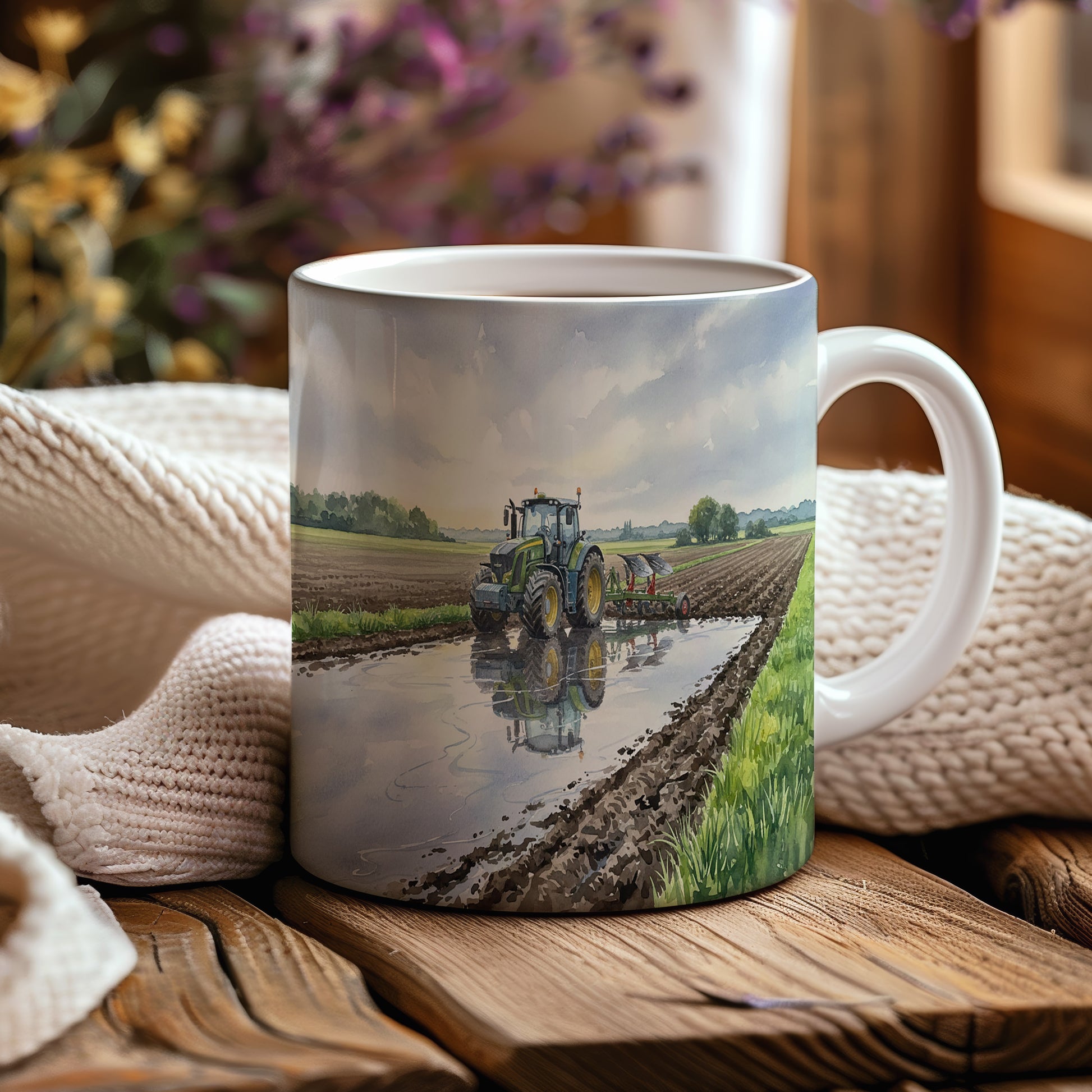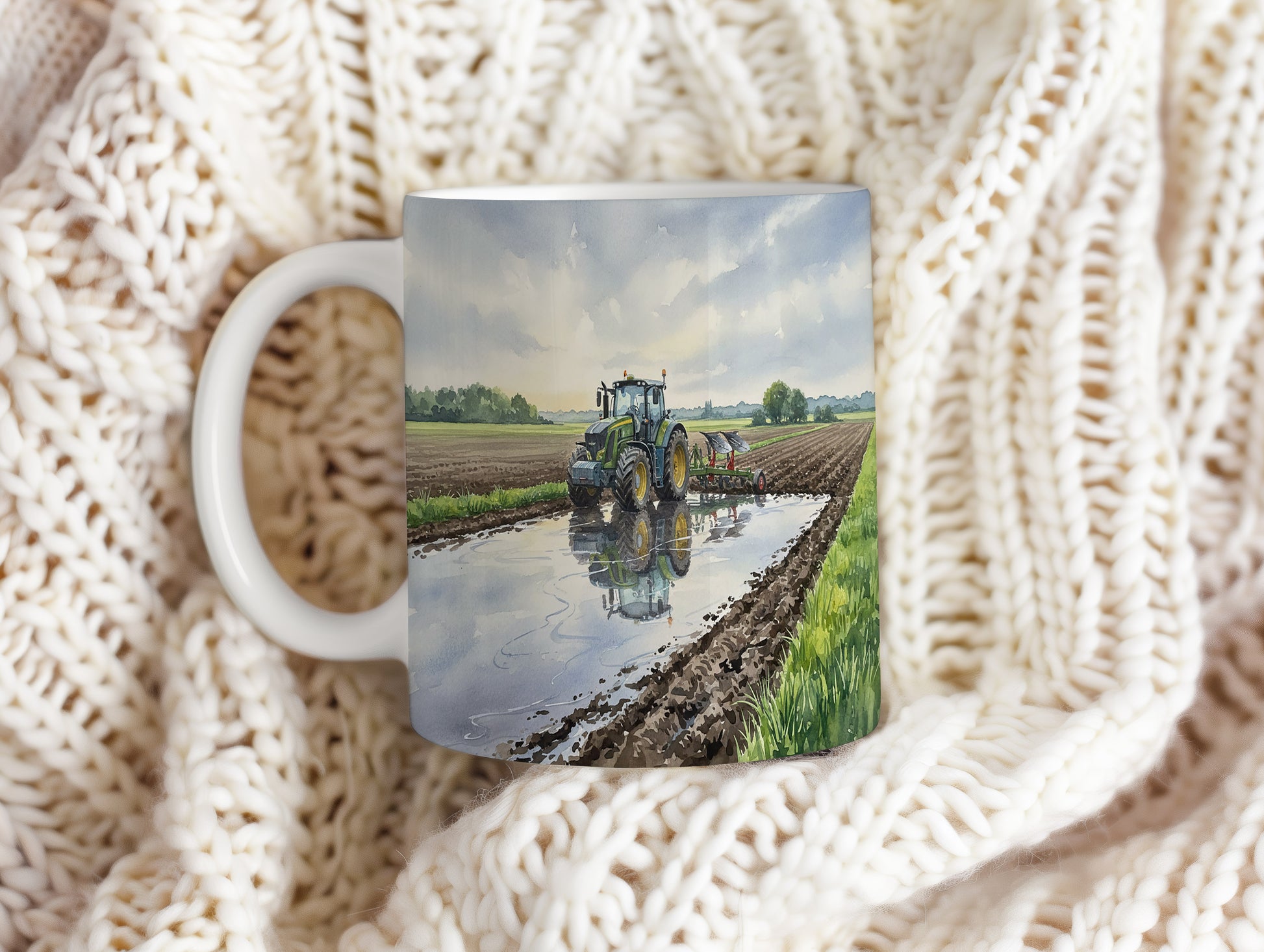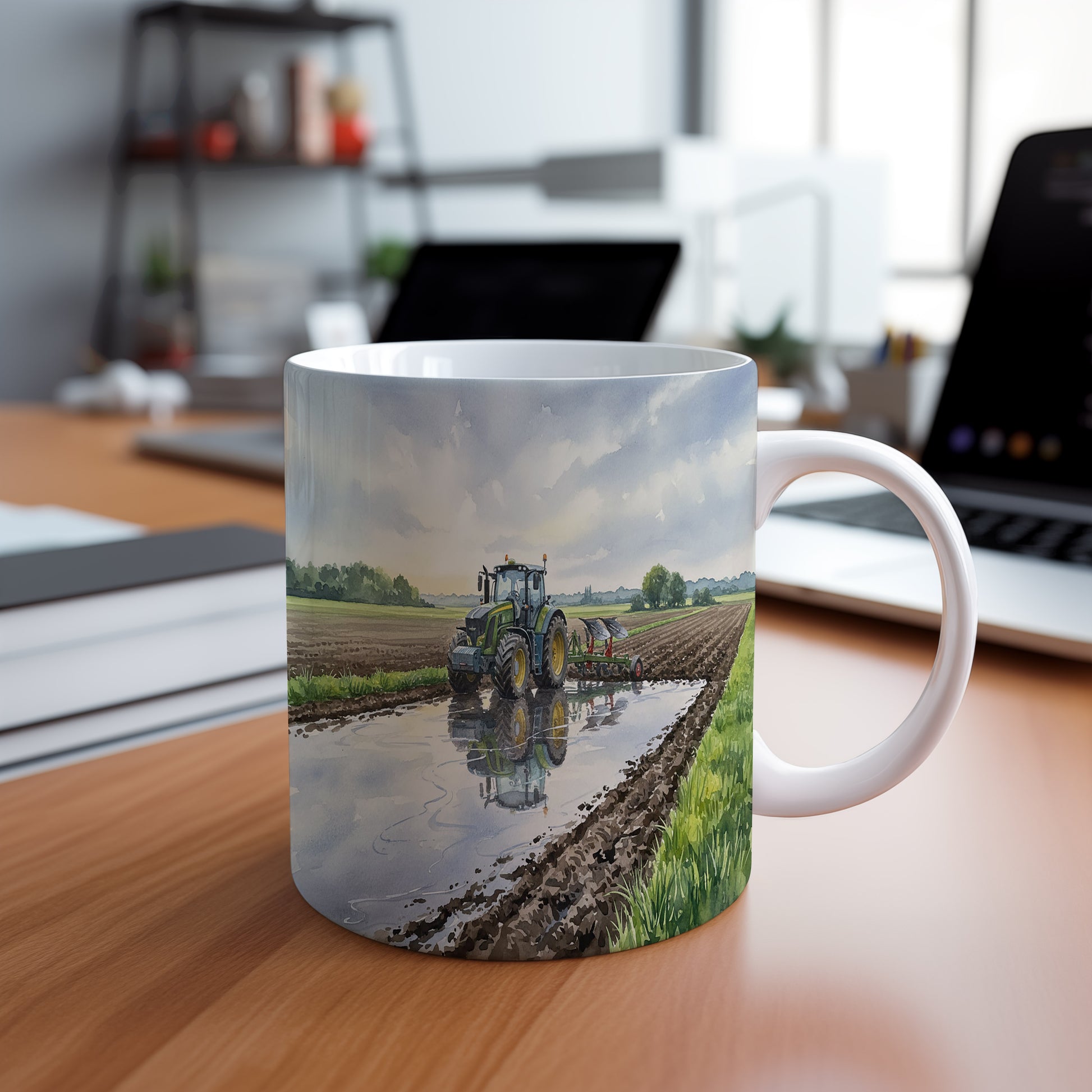 Objevte krásu akvarelového traktoru, který se odráží v klidné louži na poli. Ideální pro milovníky zemědělských strojů. Hrnek 330 ml – vhodný do myčky i mikrovlnky.