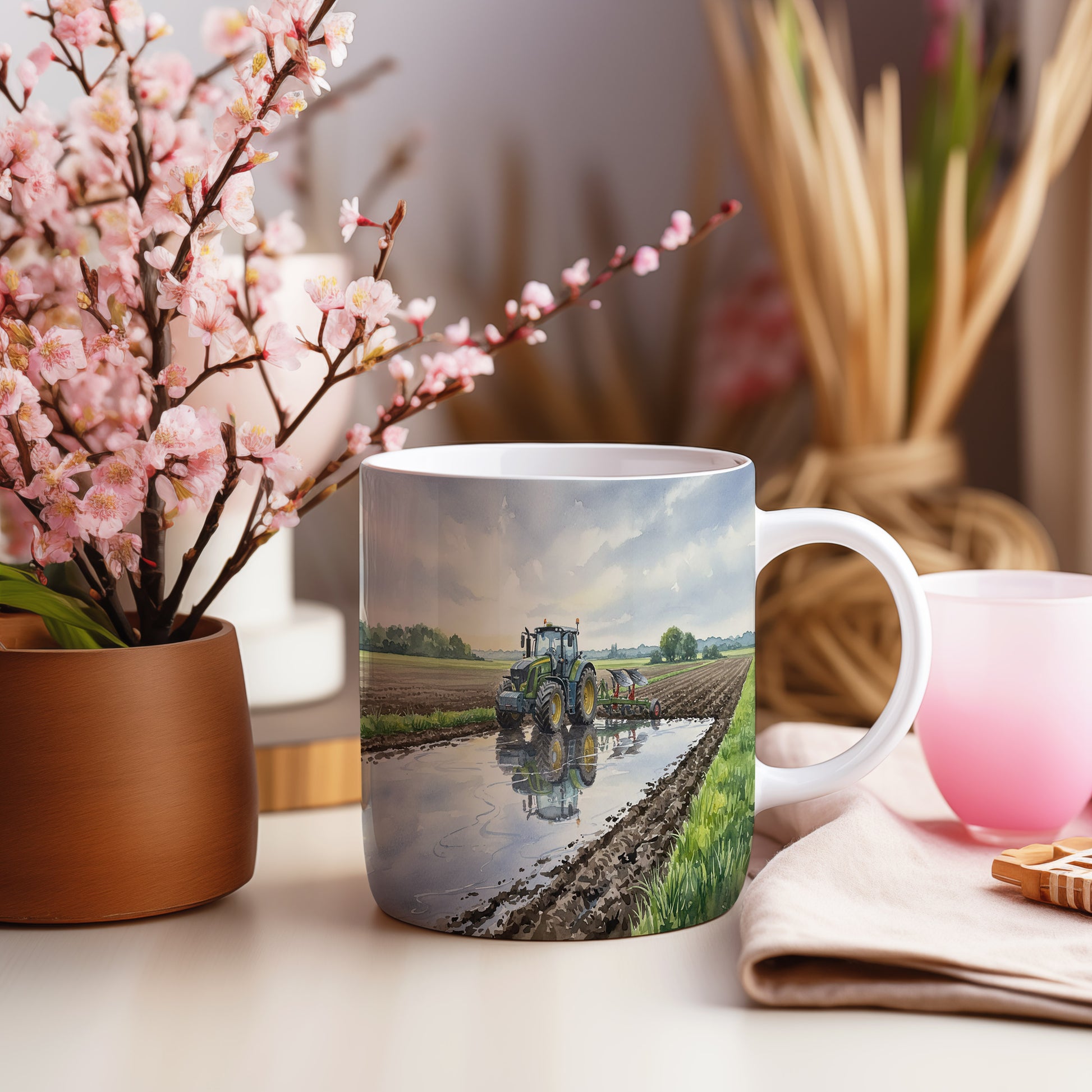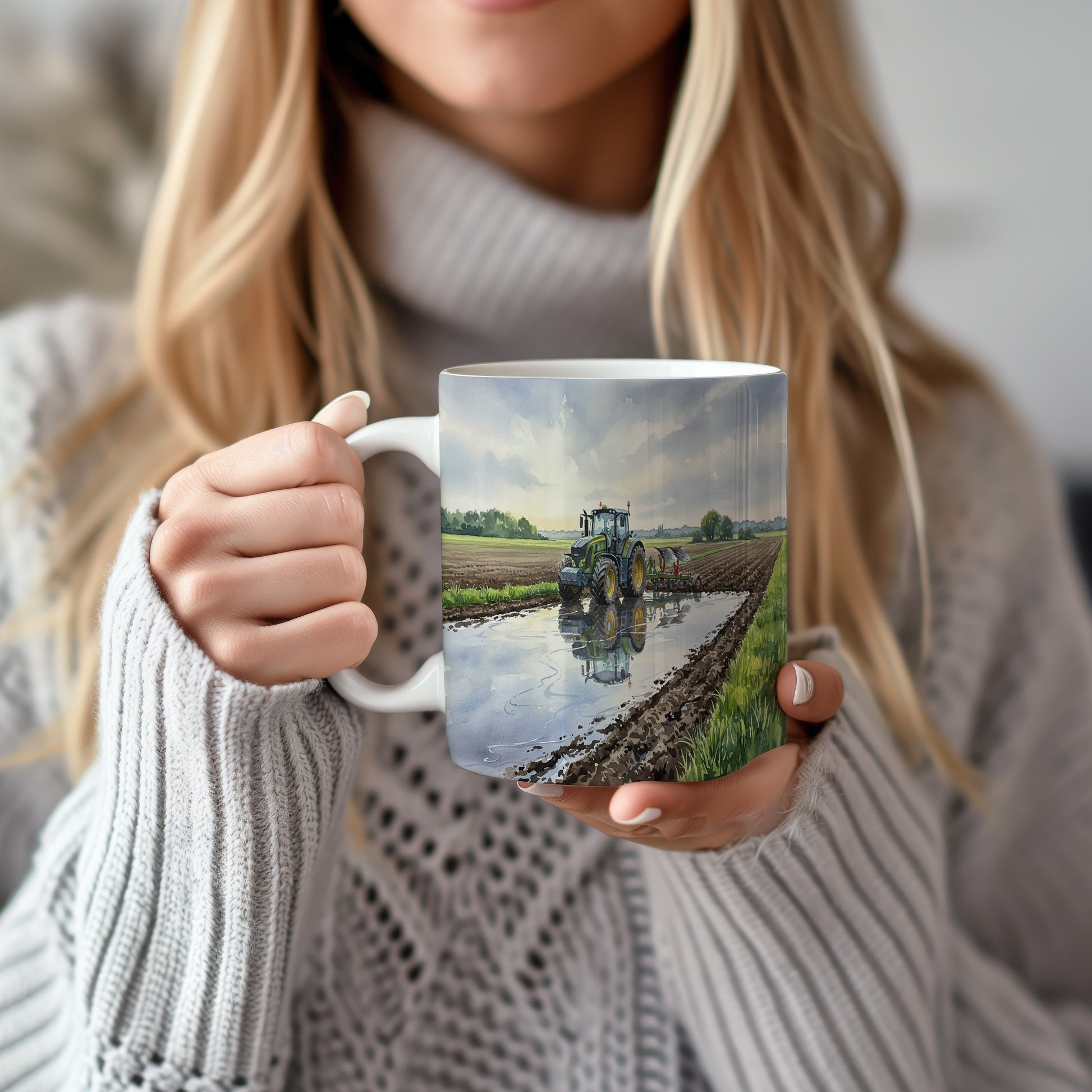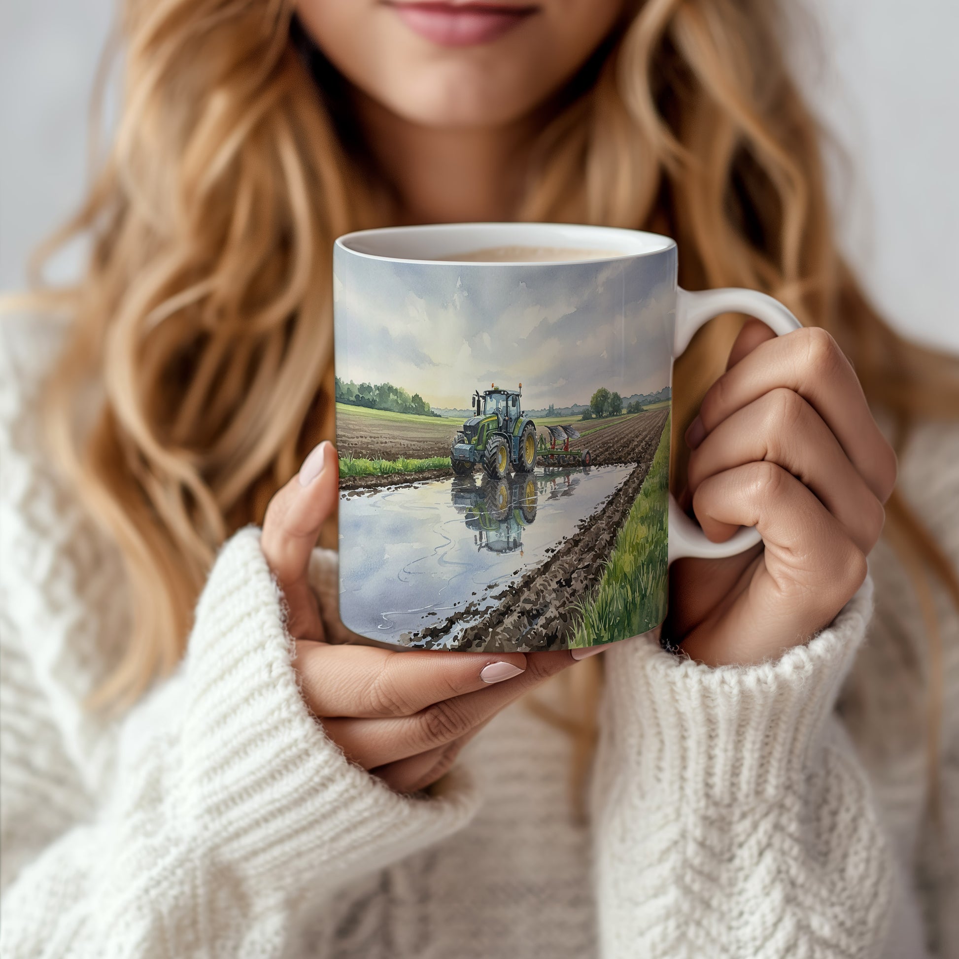 Objevte krásu akvarelového traktoru, který se odráží v klidné louži na poli. Ideální pro milovníky zemědělských strojů. Hrnek 330 ml – vhodný do myčky i mikrovlnky.