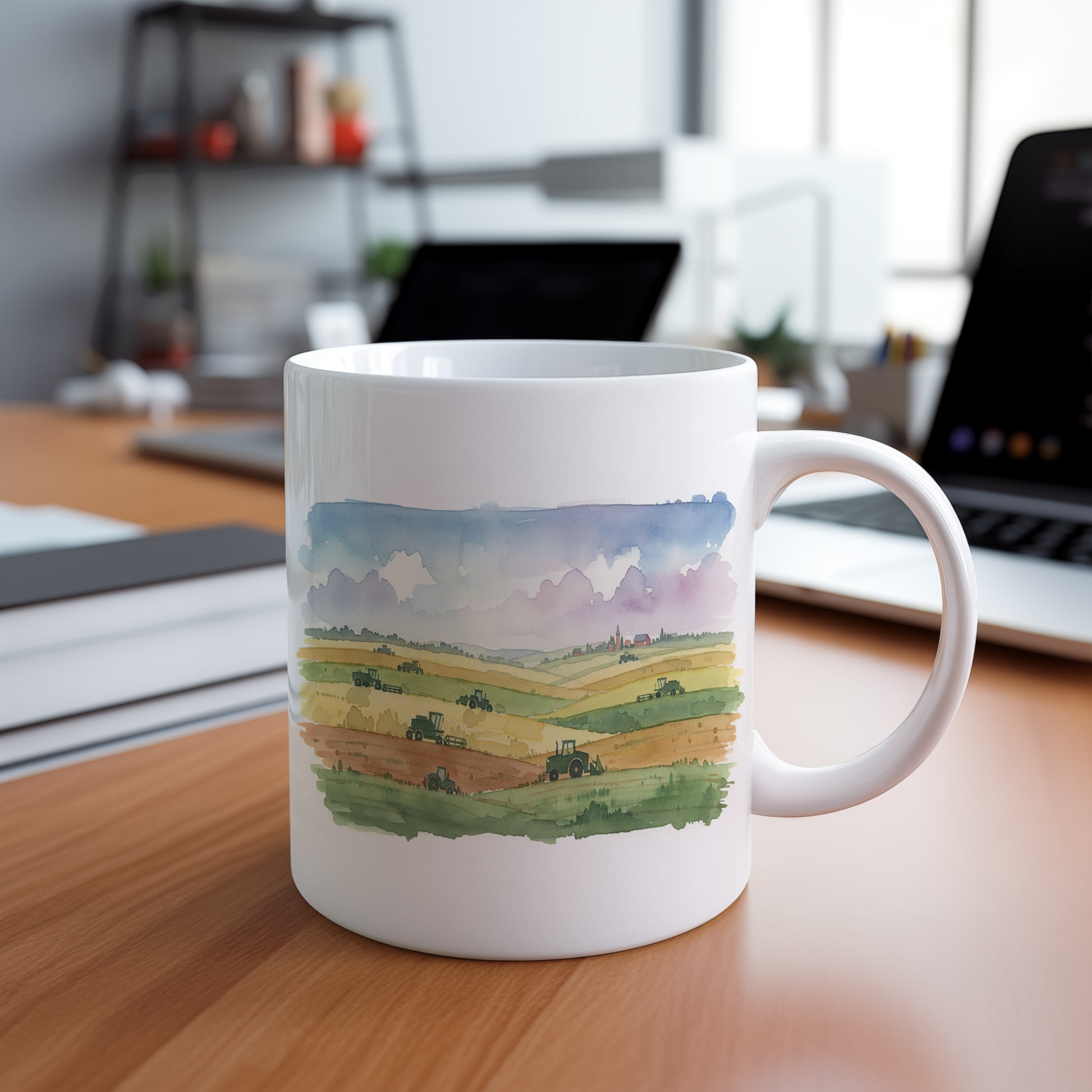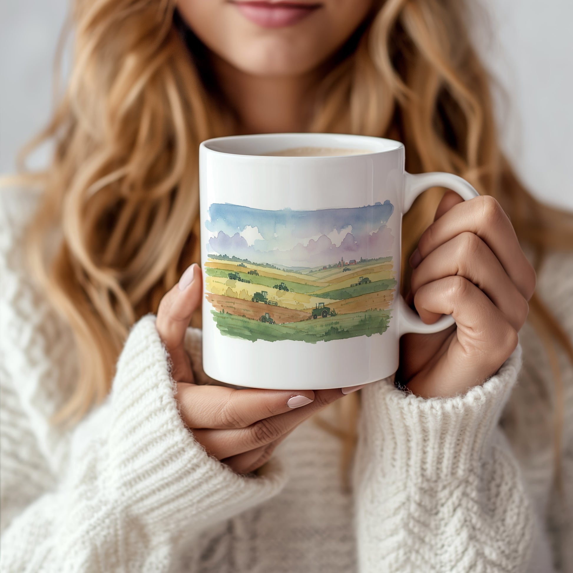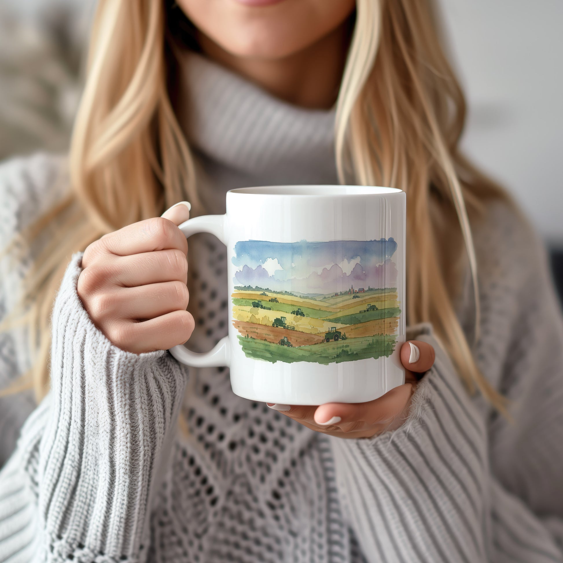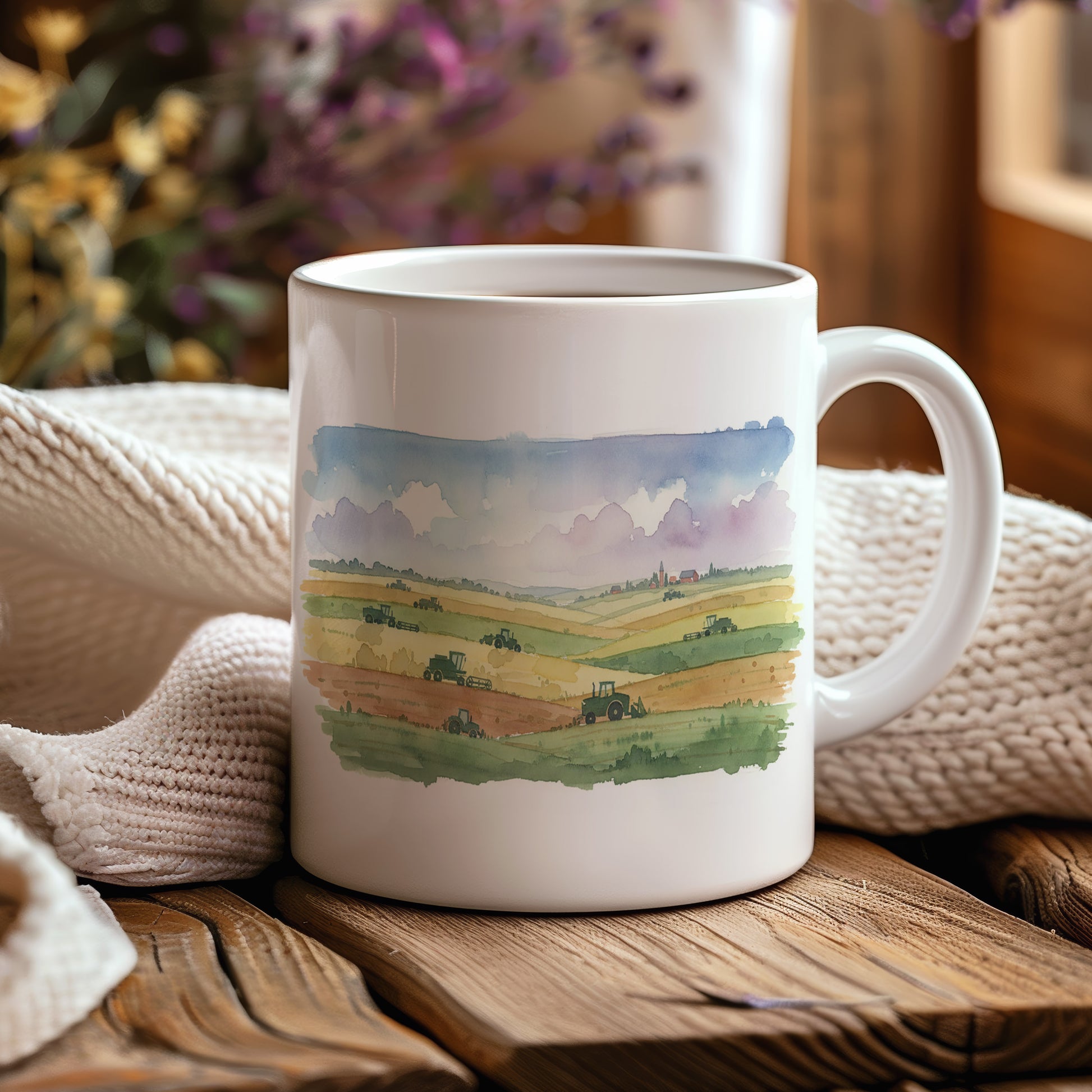 Akvarelový motiv traktorů pracujících na rozlehlých polích přináší do vaší kuchyně klidnou atmosféru venkova. Hrnek 330 ml – vhodný do myčky i mikrovlnky.