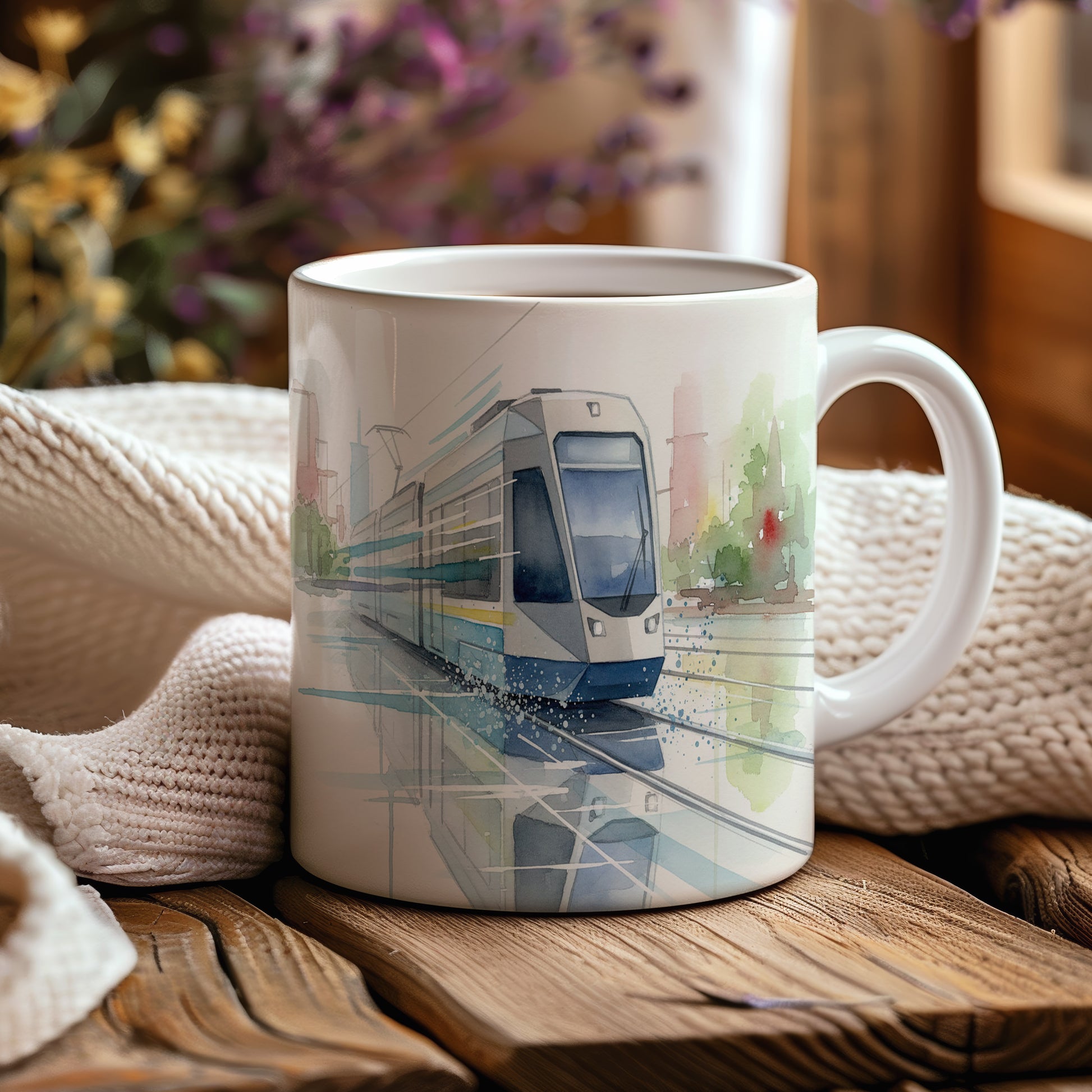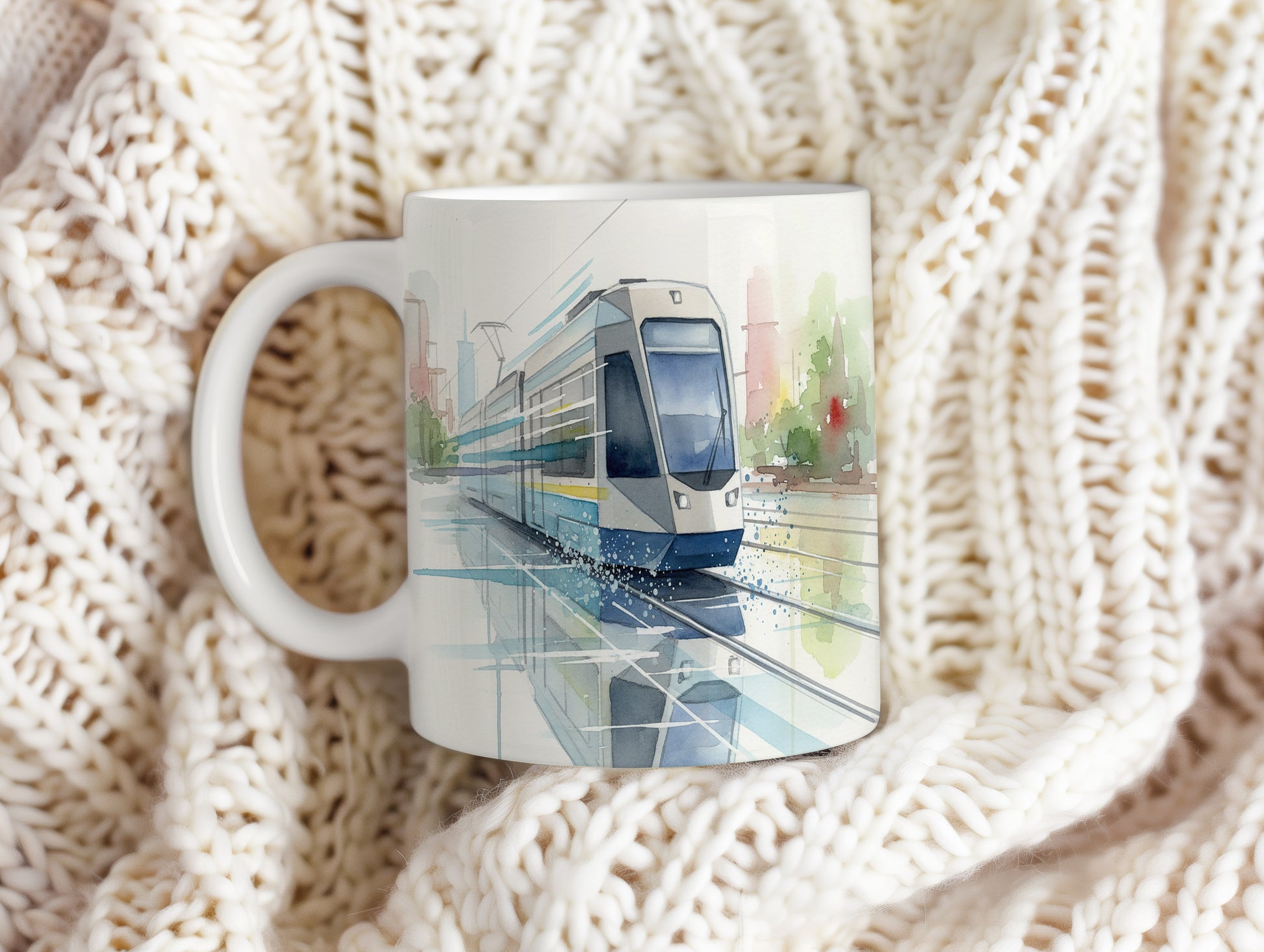 Objevte kouzlo městské dopravy s tímto hrnkem s akvarelovým motivem tramvaje projíždějící po mokrých kolejích. Hrnek 330 ml – vhodný do myčky i mikrovlnky.