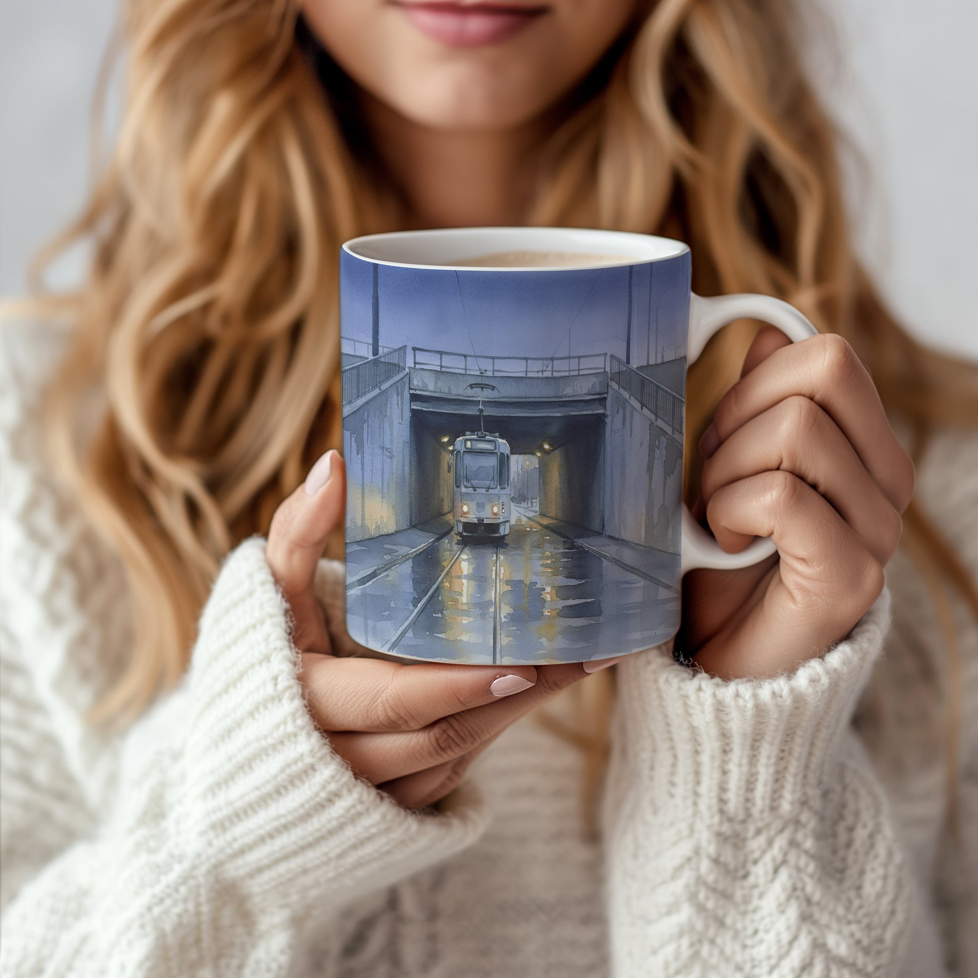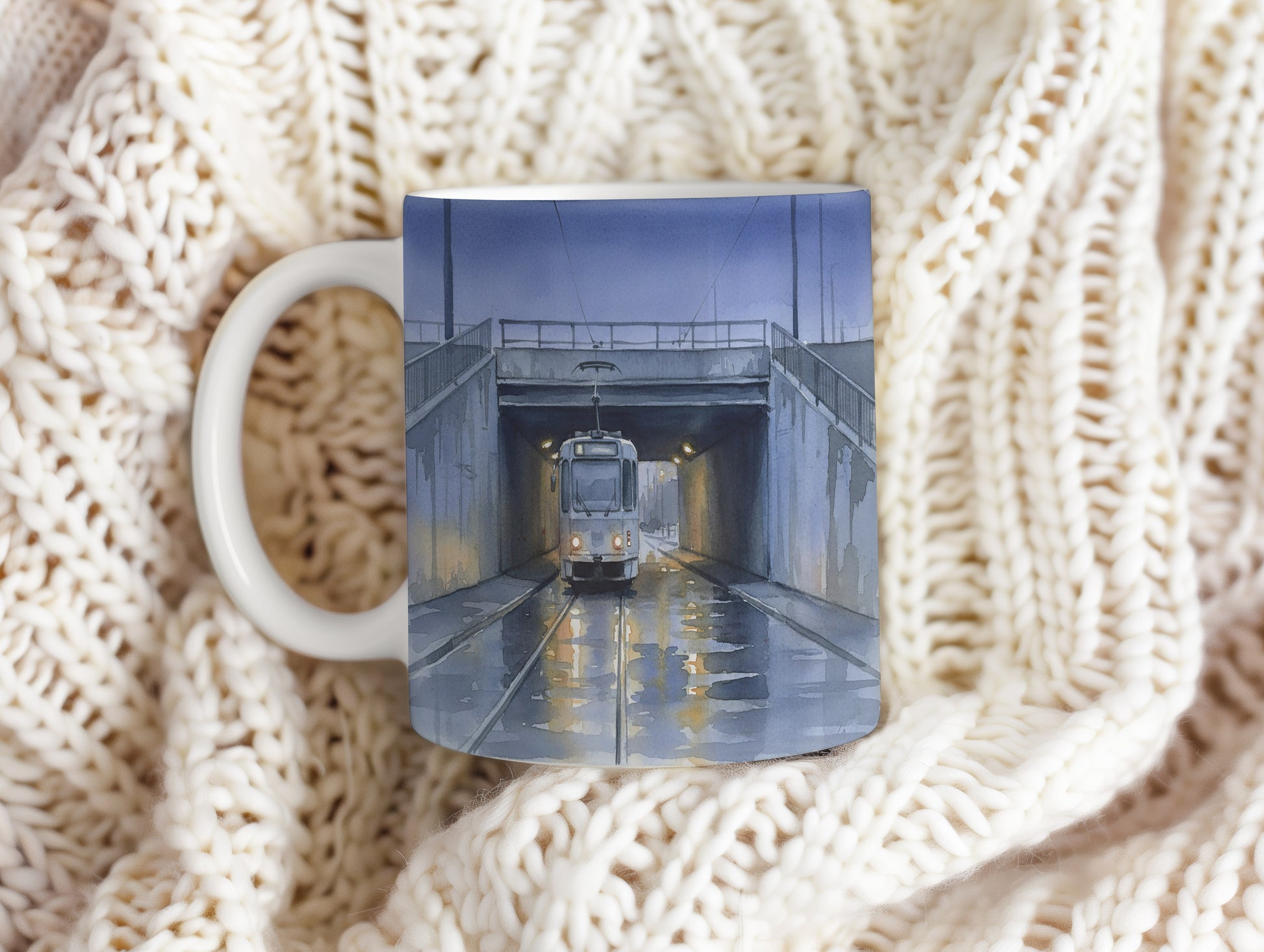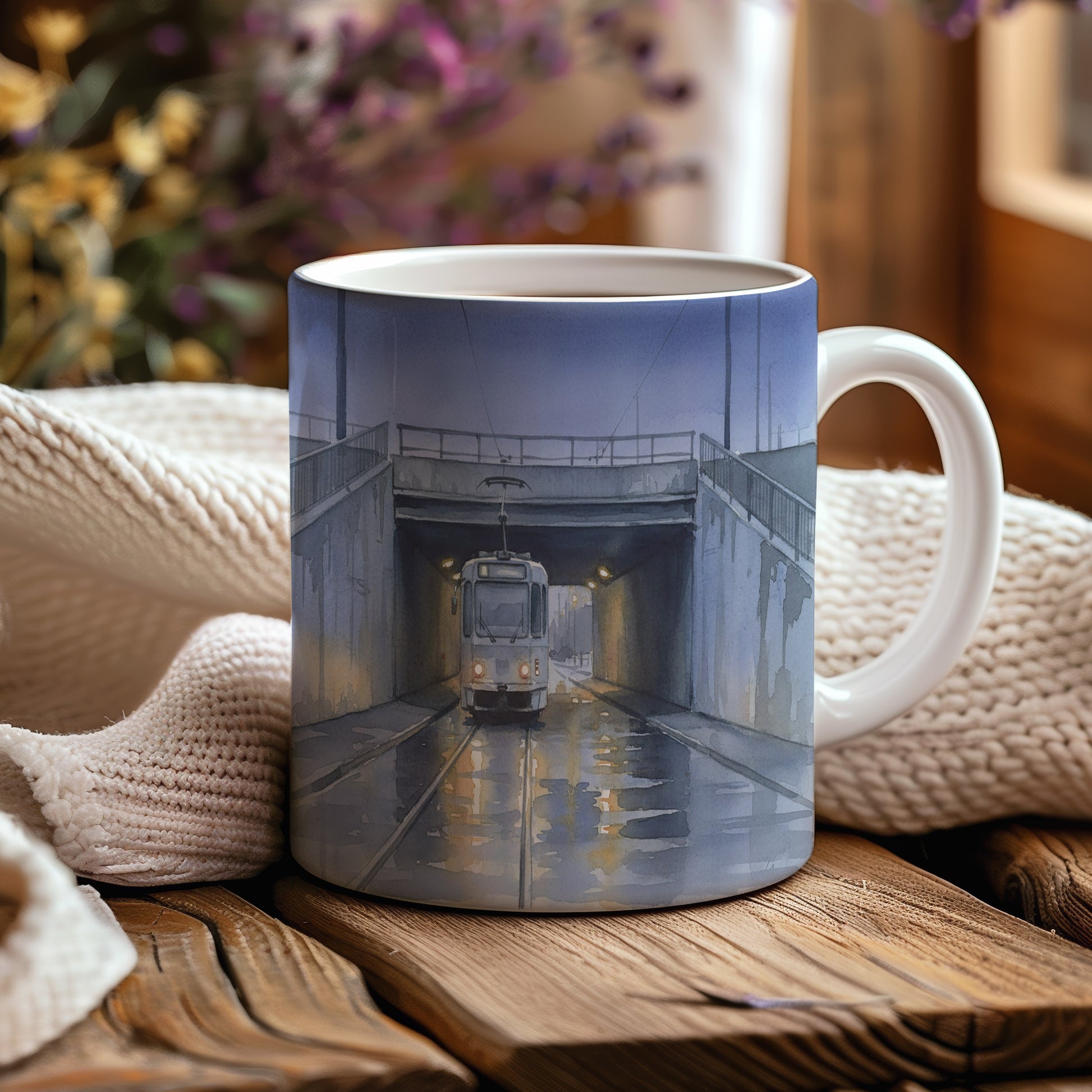 Objevte kouzlo městské dopravy s tímto hrnkem, kde tramvaj prochází pod mostem v jemném akvarelu. Hrnek 330 ml – vhodný do myčky i mikrovlnky.