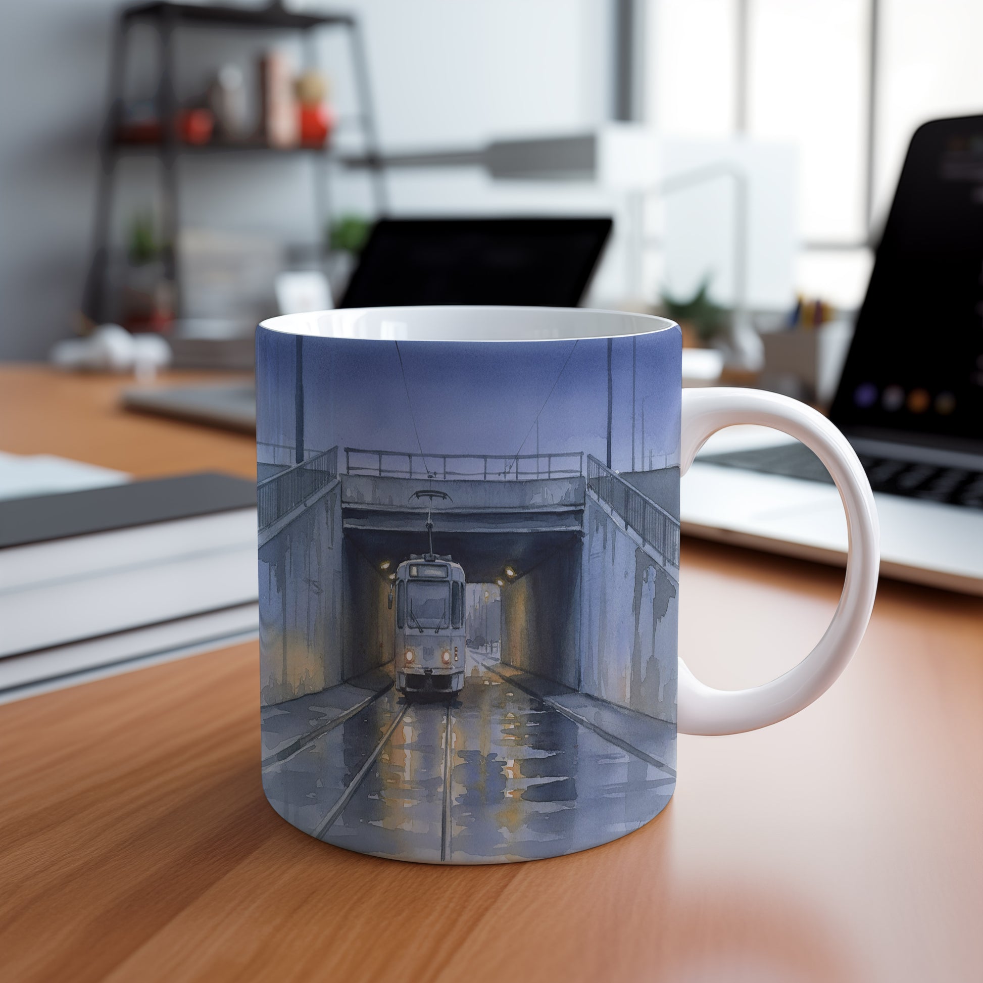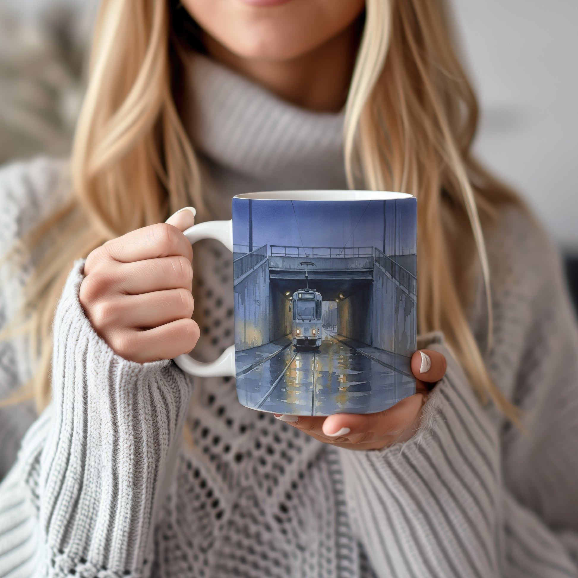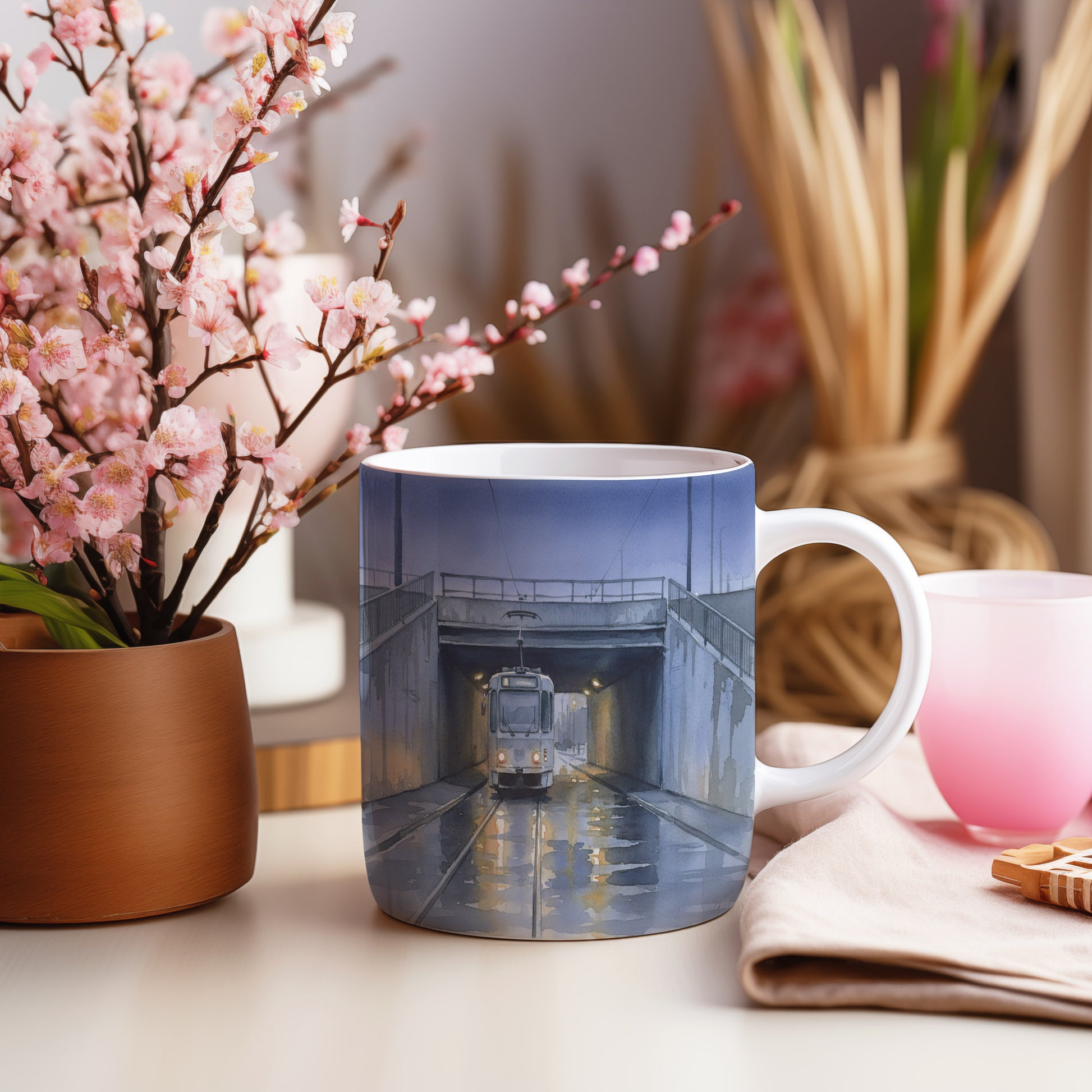 Objevte kouzlo městské dopravy s tímto hrnkem, kde tramvaj prochází pod mostem v jemném akvarelu. Hrnek 330 ml – vhodný do myčky i mikrovlnky.