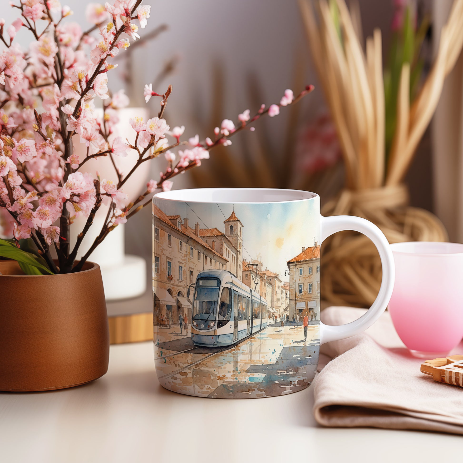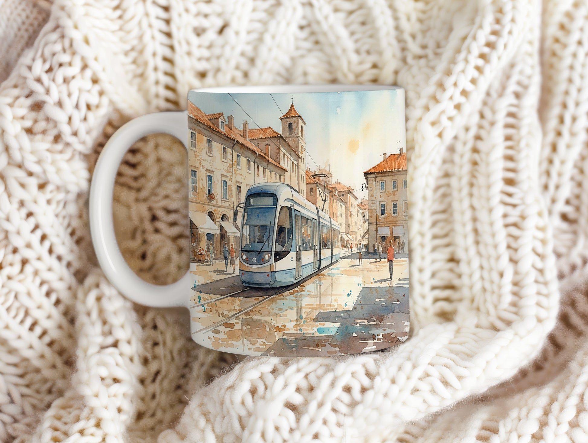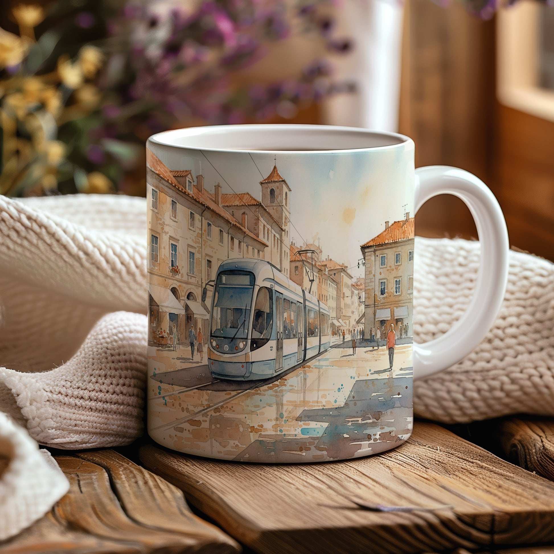 Objevte kouzlo městské dopravy s hrnkem zdobeným elegantní tramvají v historickém centru. Hrnek 330 ml – vhodný do myčky i mikrovlnky.