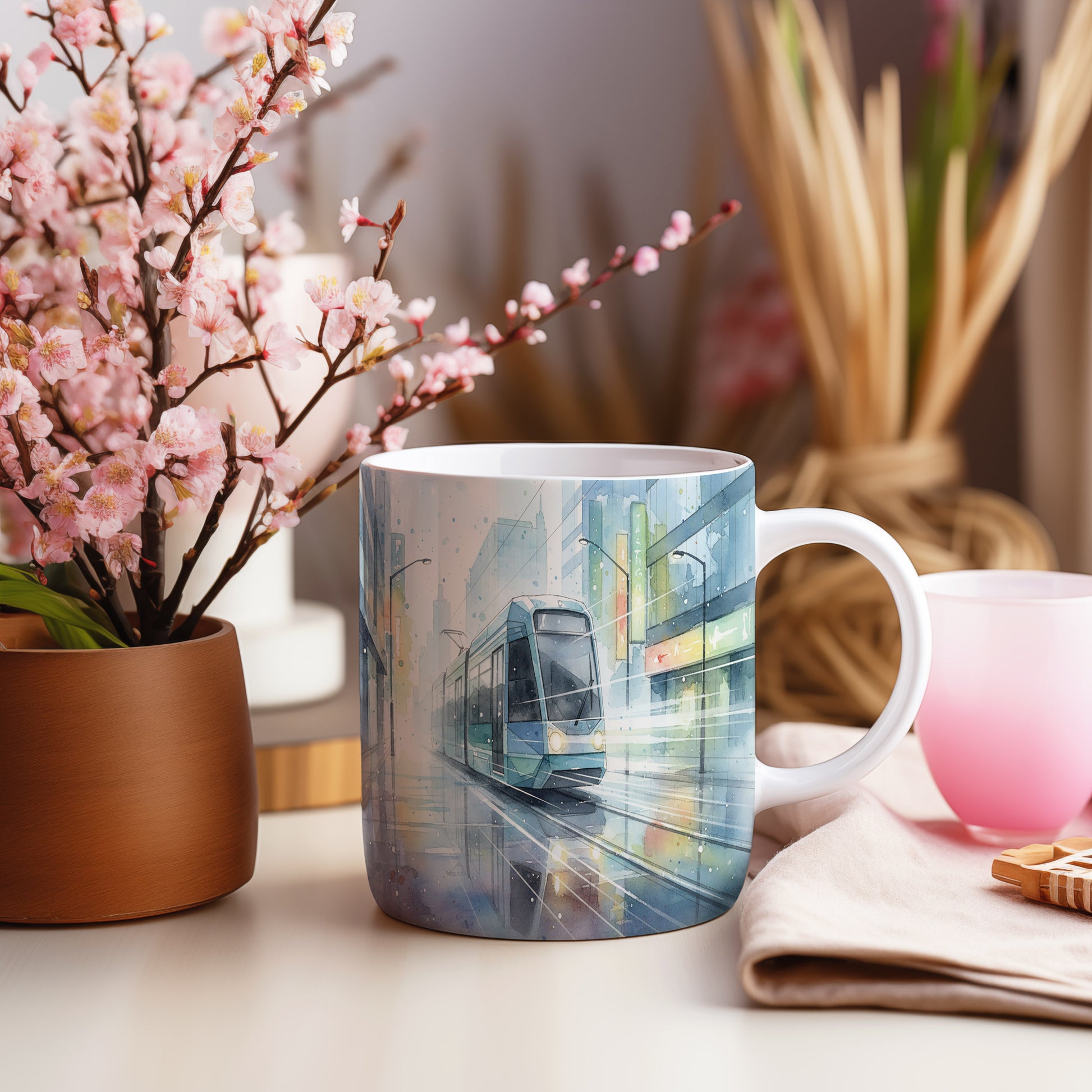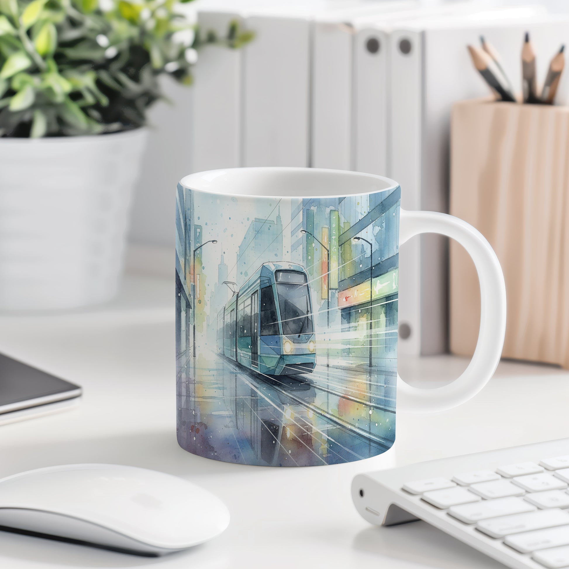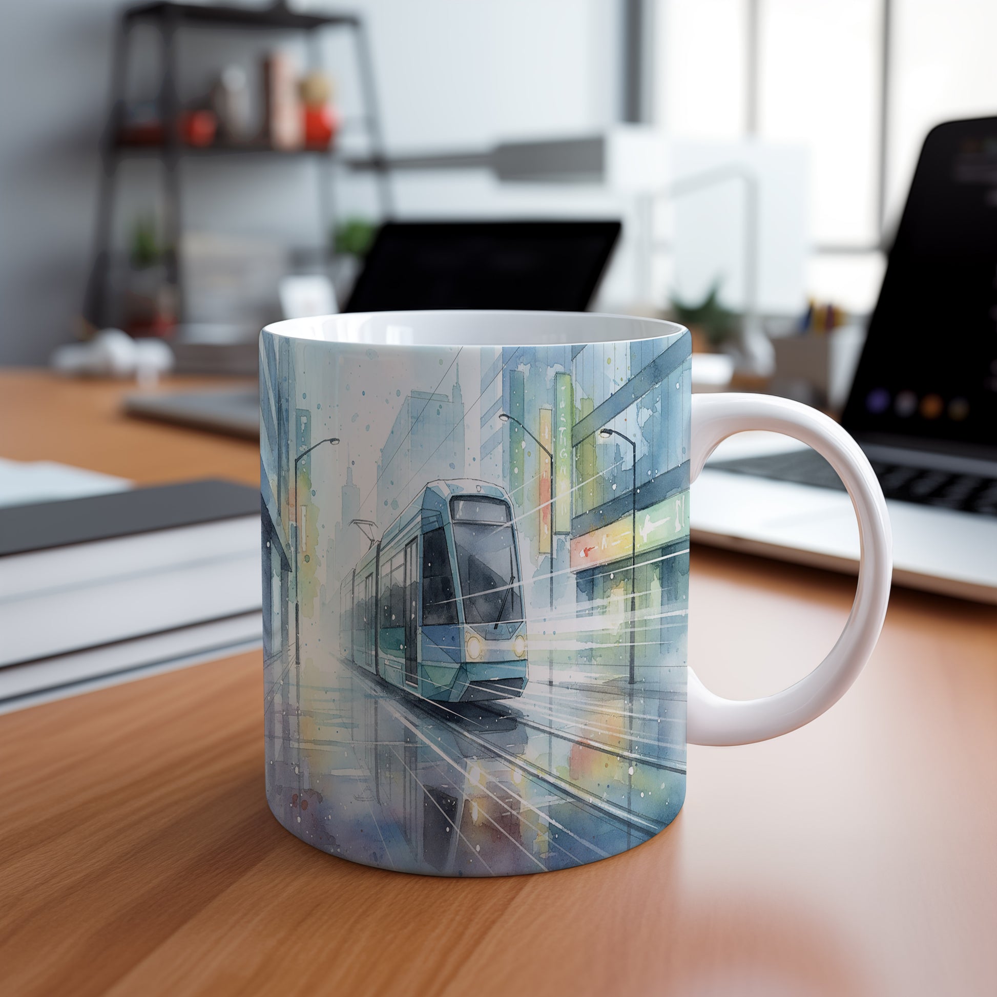 Objevte kouzlo moderní metropole s tímto hrnkem, který zachycuje tramvaj ve městě. Jemné akvarelové odstíny dodávají motivu eleganci. Hrnek 330 ml – vhodný do myčky i mikrovlnky.