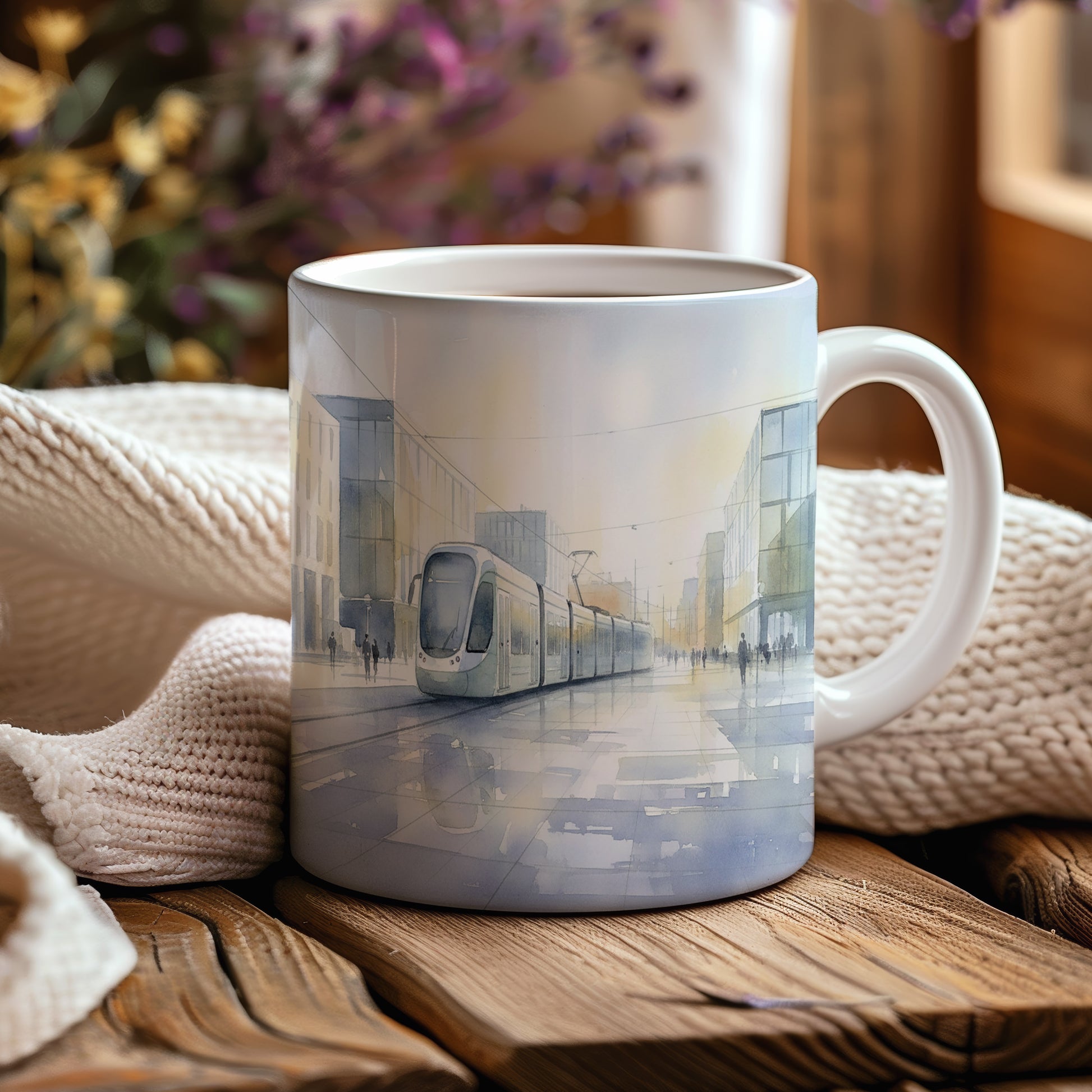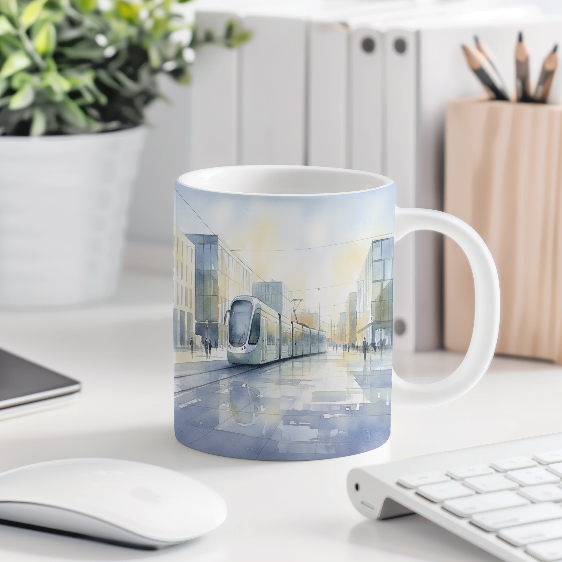 Elegantní hrnek s akvarelem tramvaje projíždějící městskou krajinou v jemné ranní mlze. Ideální pro milovníky dopravy a umění. Hrnek 330 ml – vhodný do myčky i mikrovlnky.