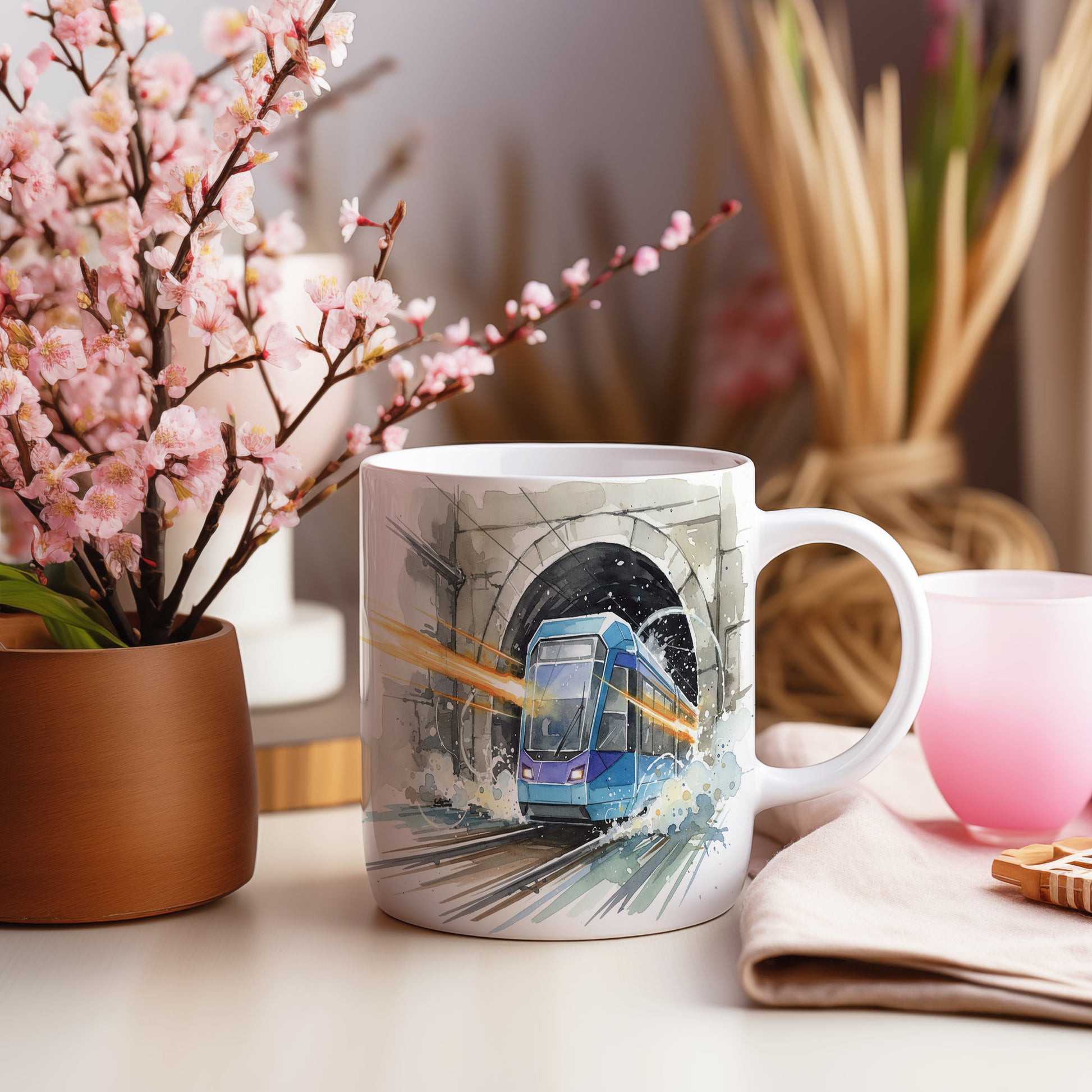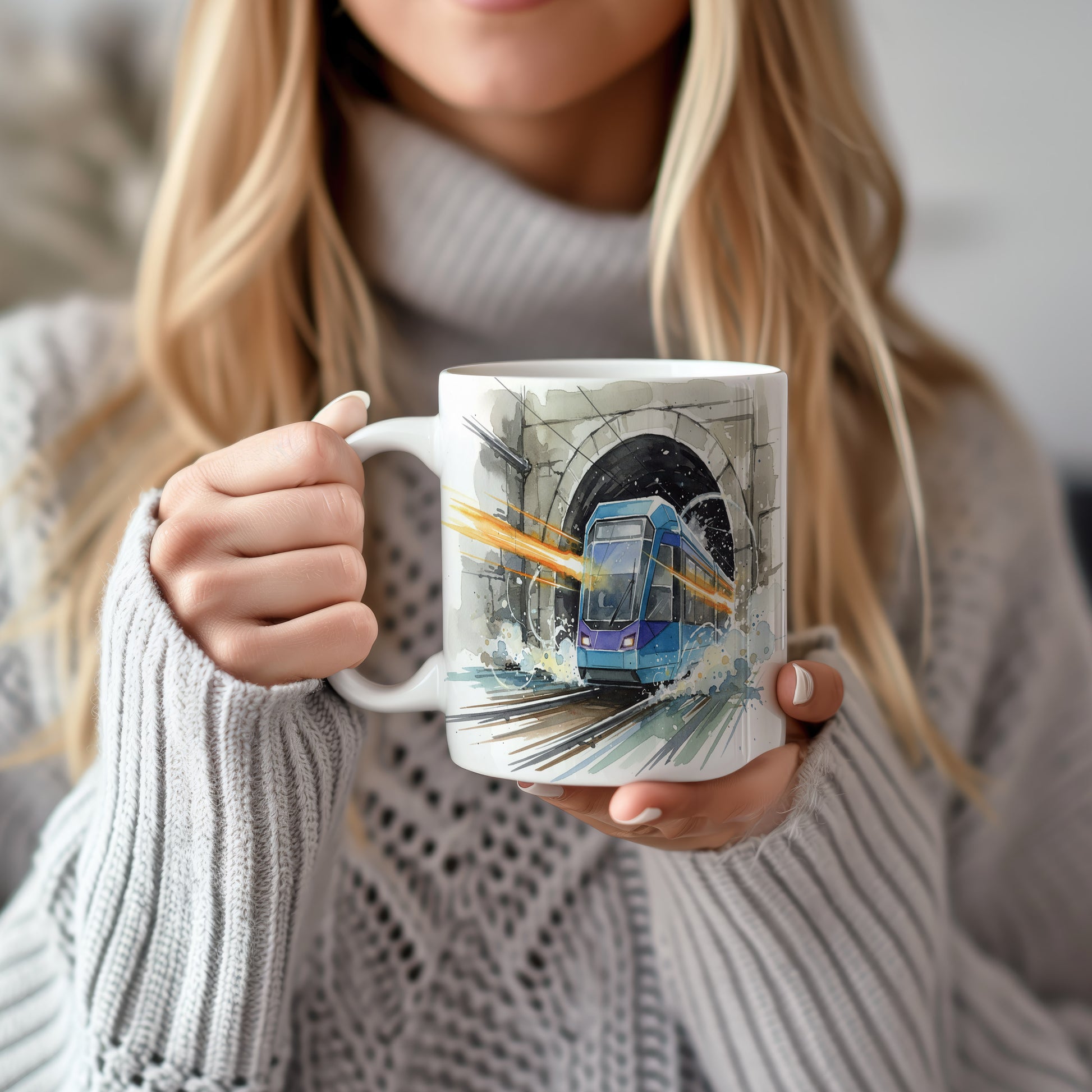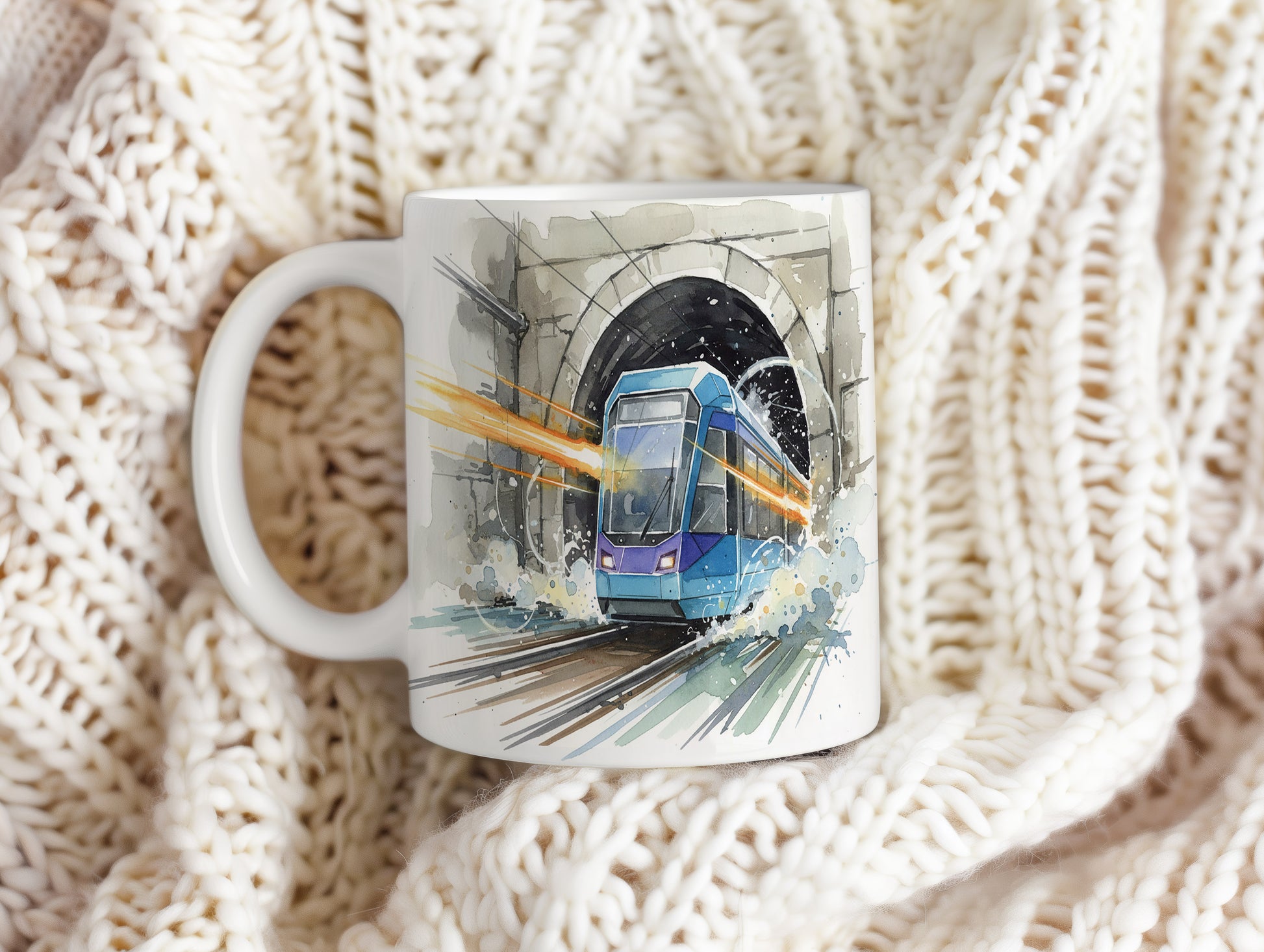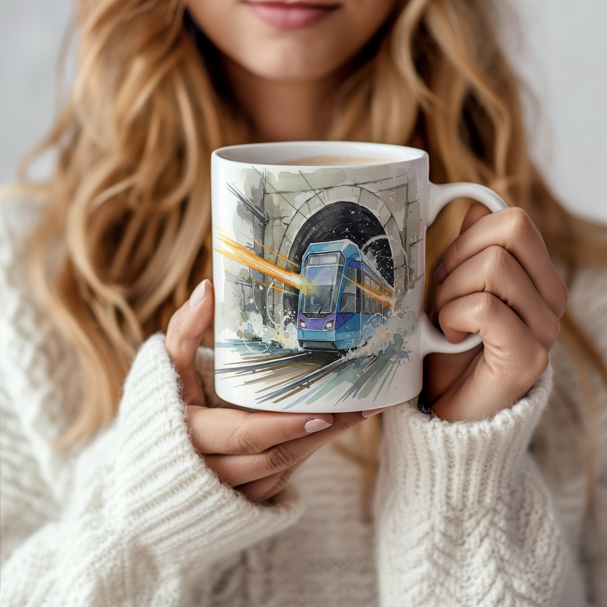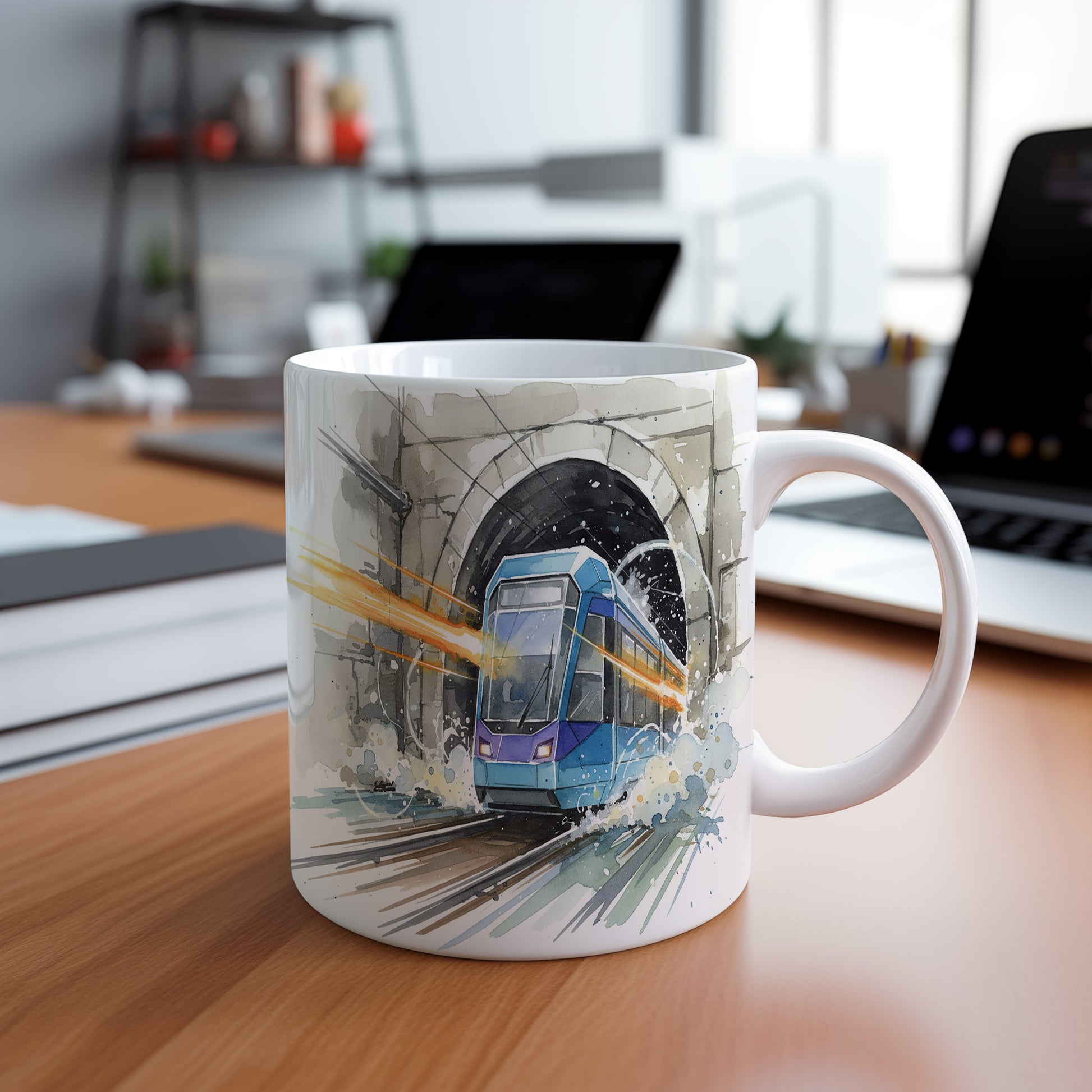 Objevte dynamiku moderní tramvaje, která vyjíždí z tunelu v živém akvarelovém stylu. Hrnek 330 ml – vhodný do myčky i mikrovlnky.