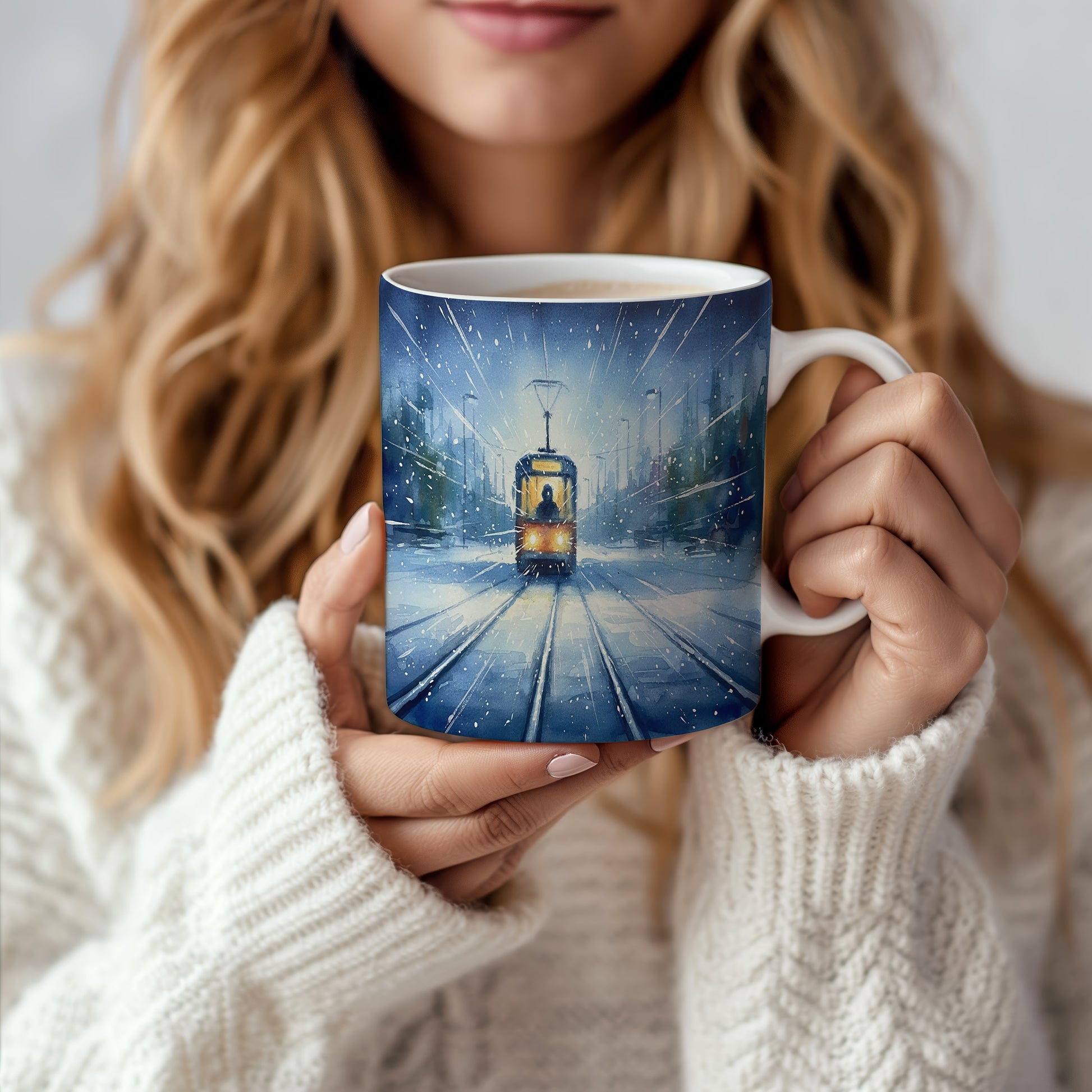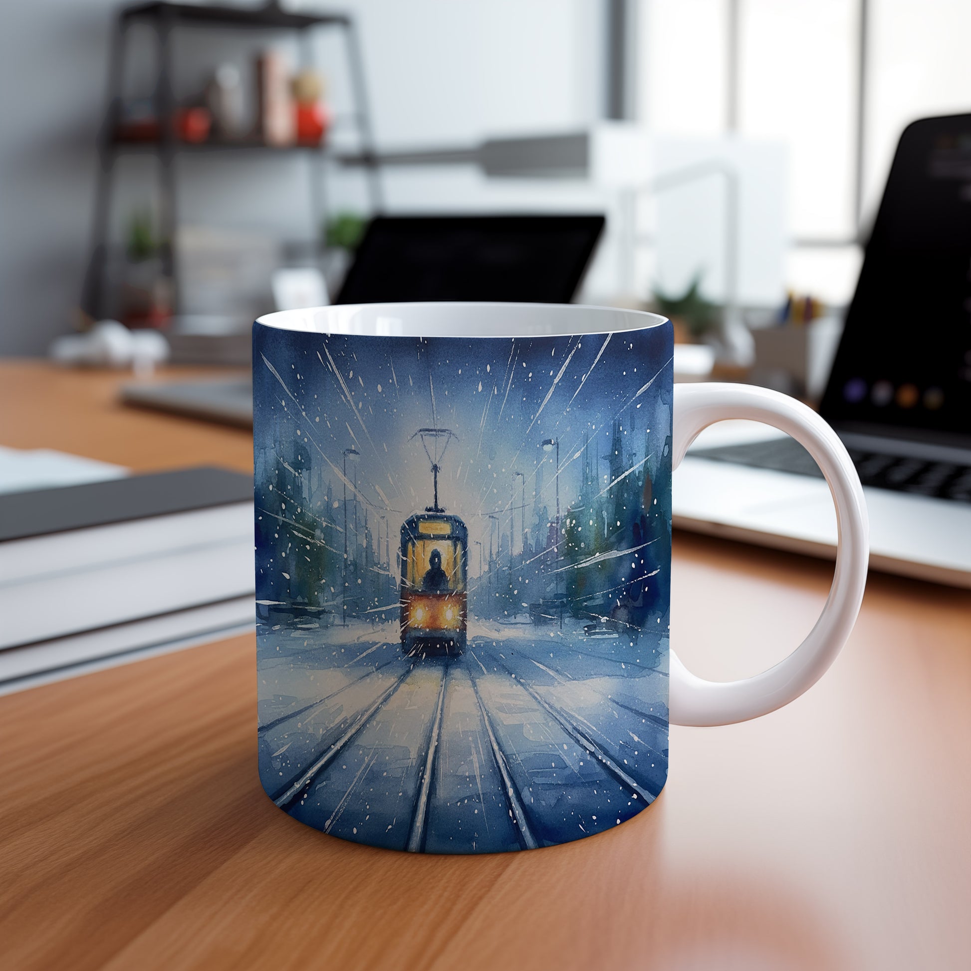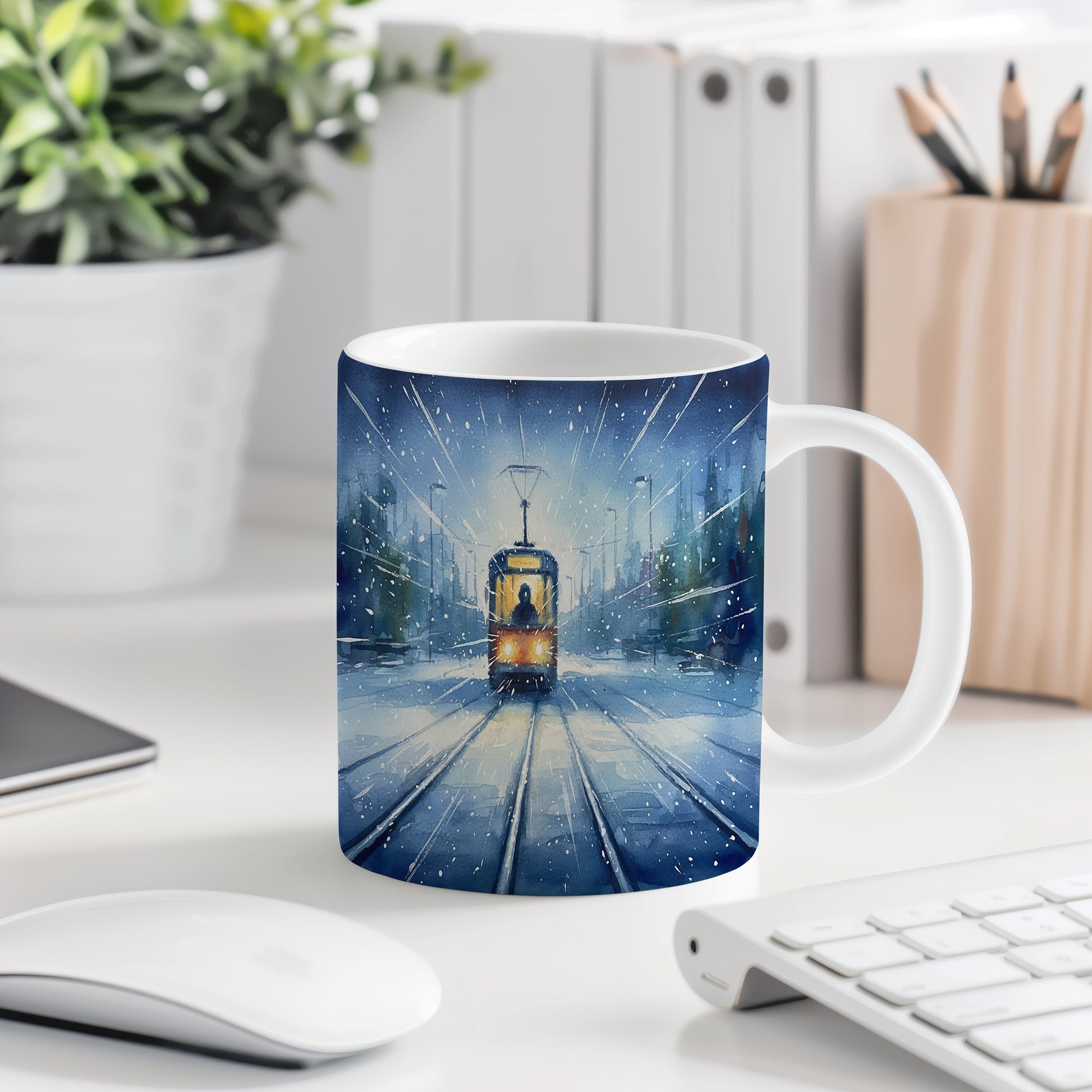 Nechte se unést kouzelnou zimní krajinou s tramvají, která projíždí zasněženou ulicí. Jemný akvarelový motiv přináší klid a pohodu do každého dne. Hrnek 330 ml – vhodný do myčky i mikrovlnky.