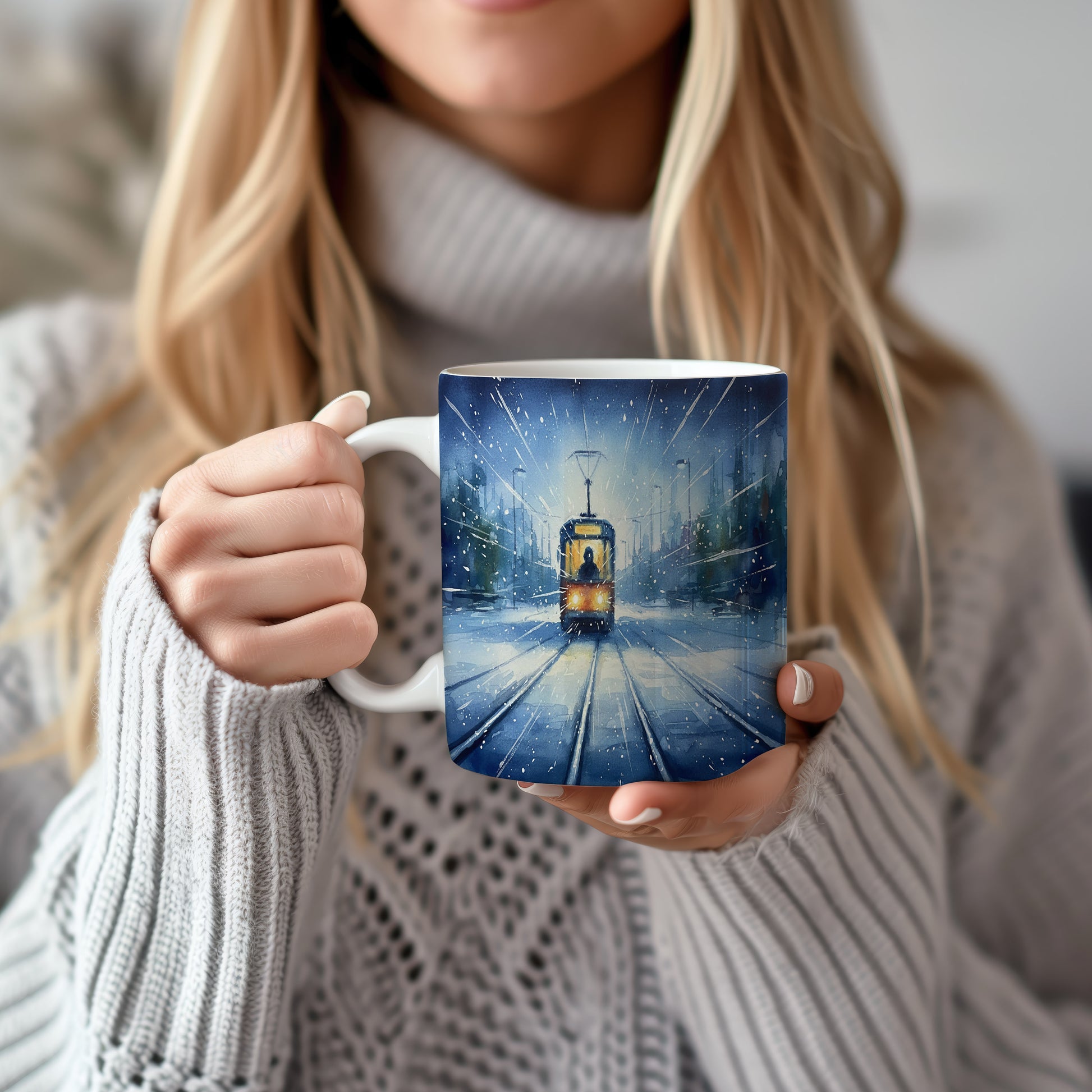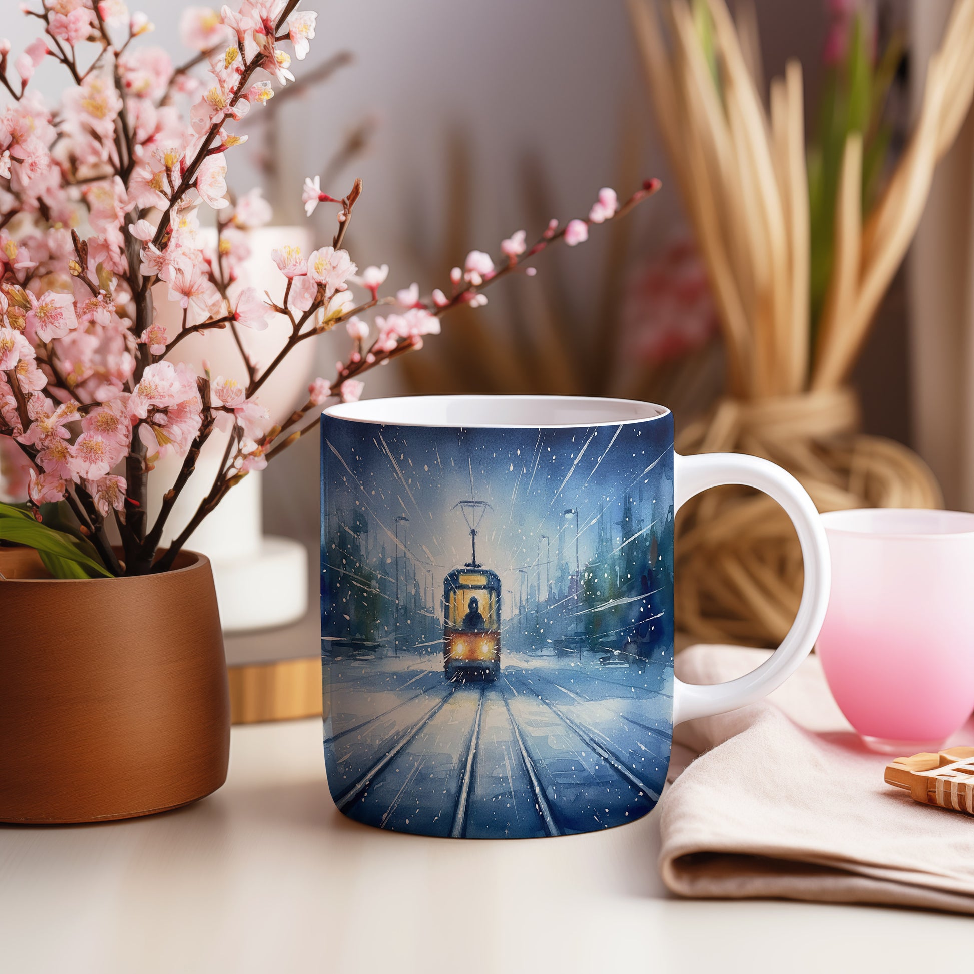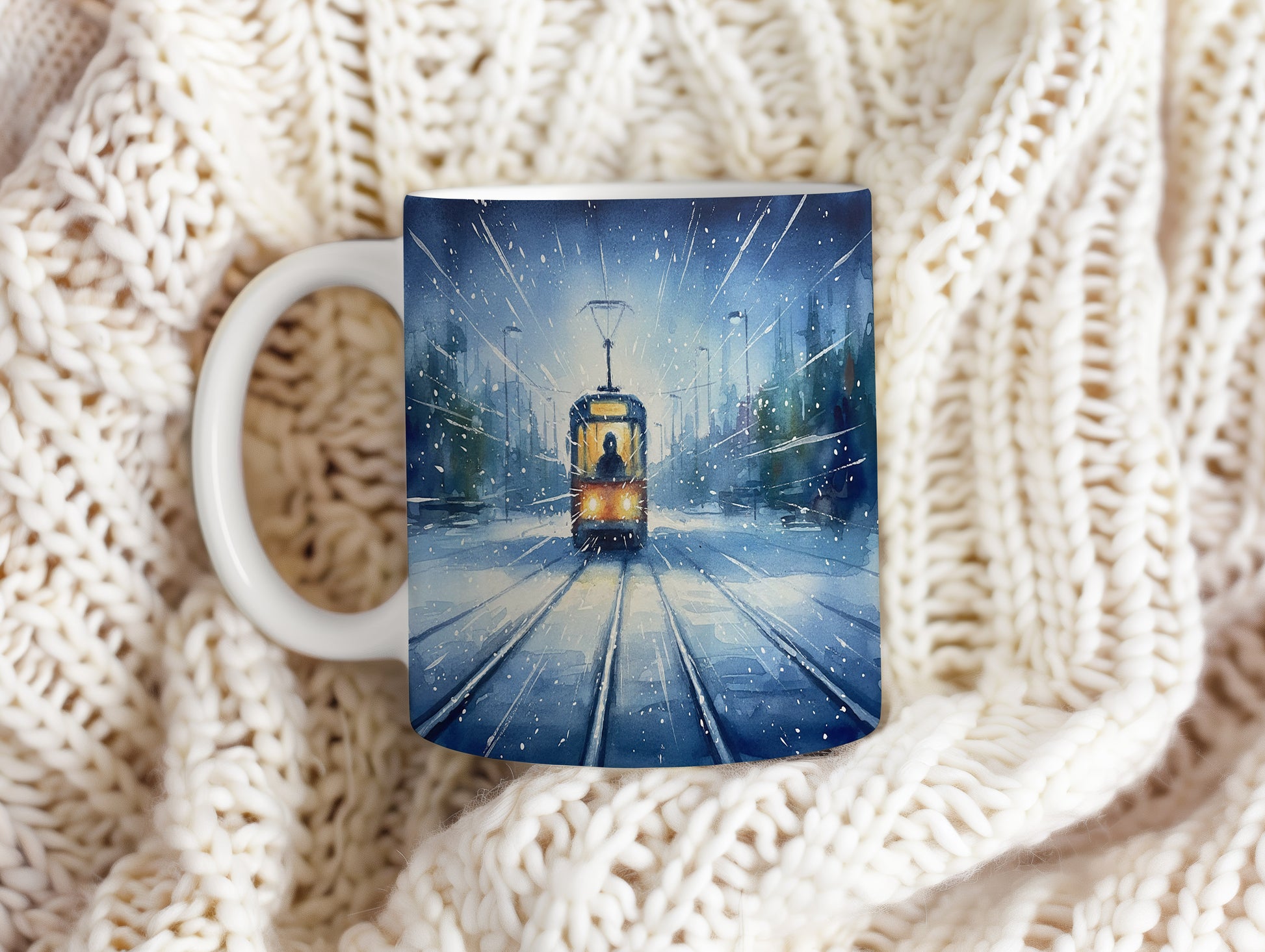 Nechte se unést kouzelnou zimní krajinou s tramvají, která projíždí zasněženou ulicí. Jemný akvarelový motiv přináší klid a pohodu do každého dne. Hrnek 330 ml – vhodný do myčky i mikrovlnky.