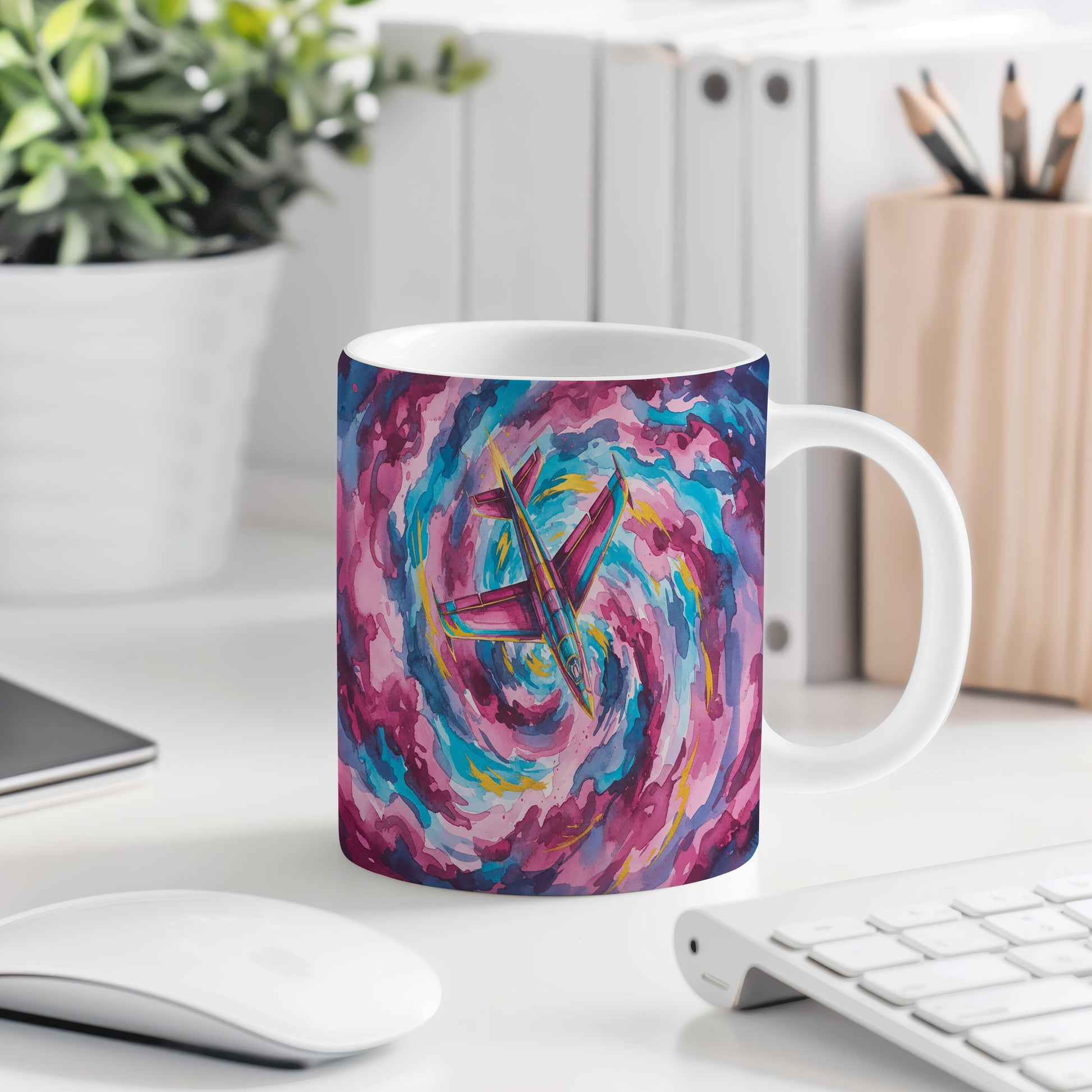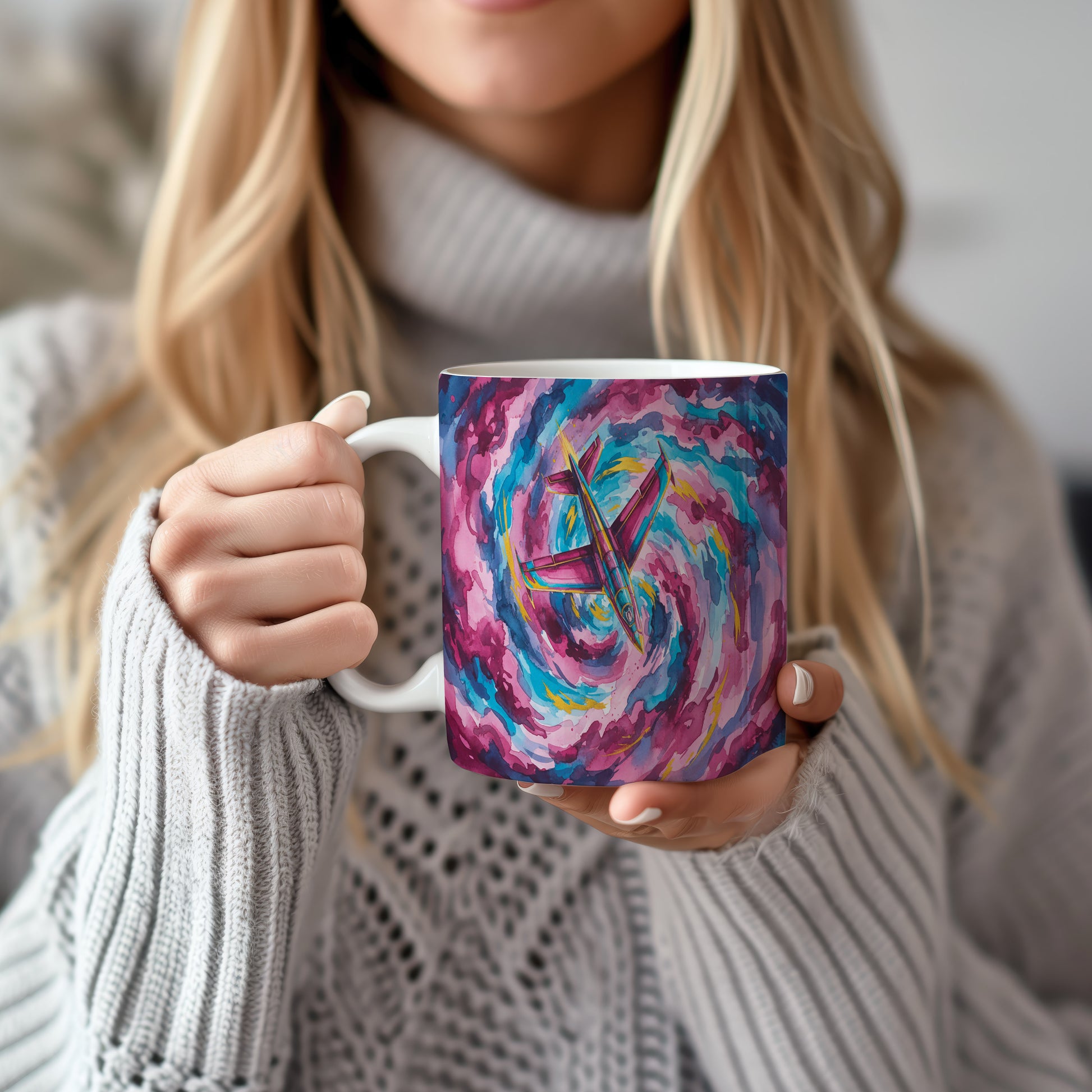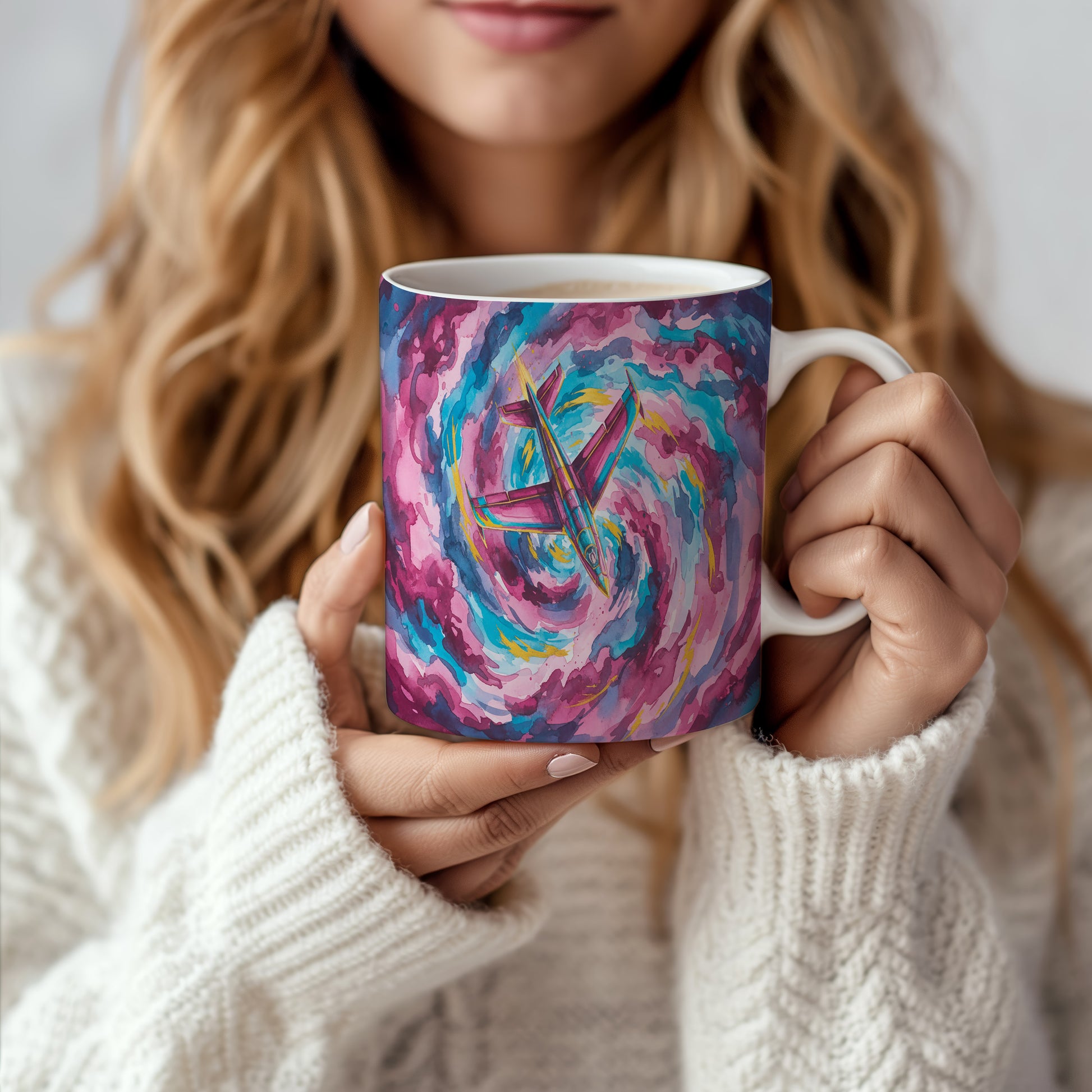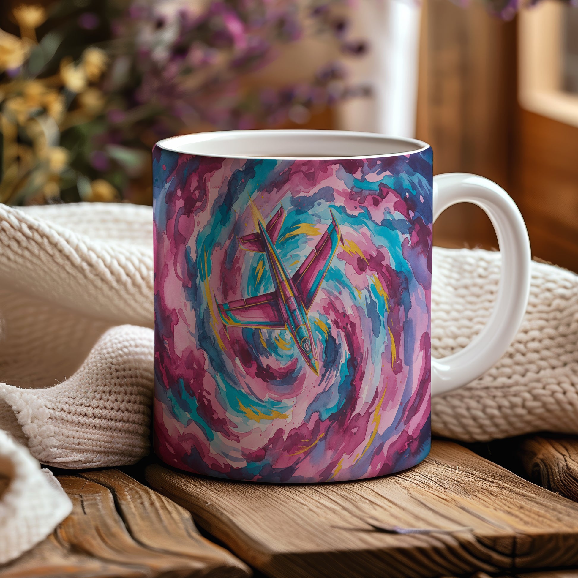 Objevte kouzlo akvarelu s hrnkem, na kterém je tryskáč v dynamickém barevném víru. Ideální pro milovníky letectví. Hrnek 330 ml – vhodný do myčky i mikrovlnky.