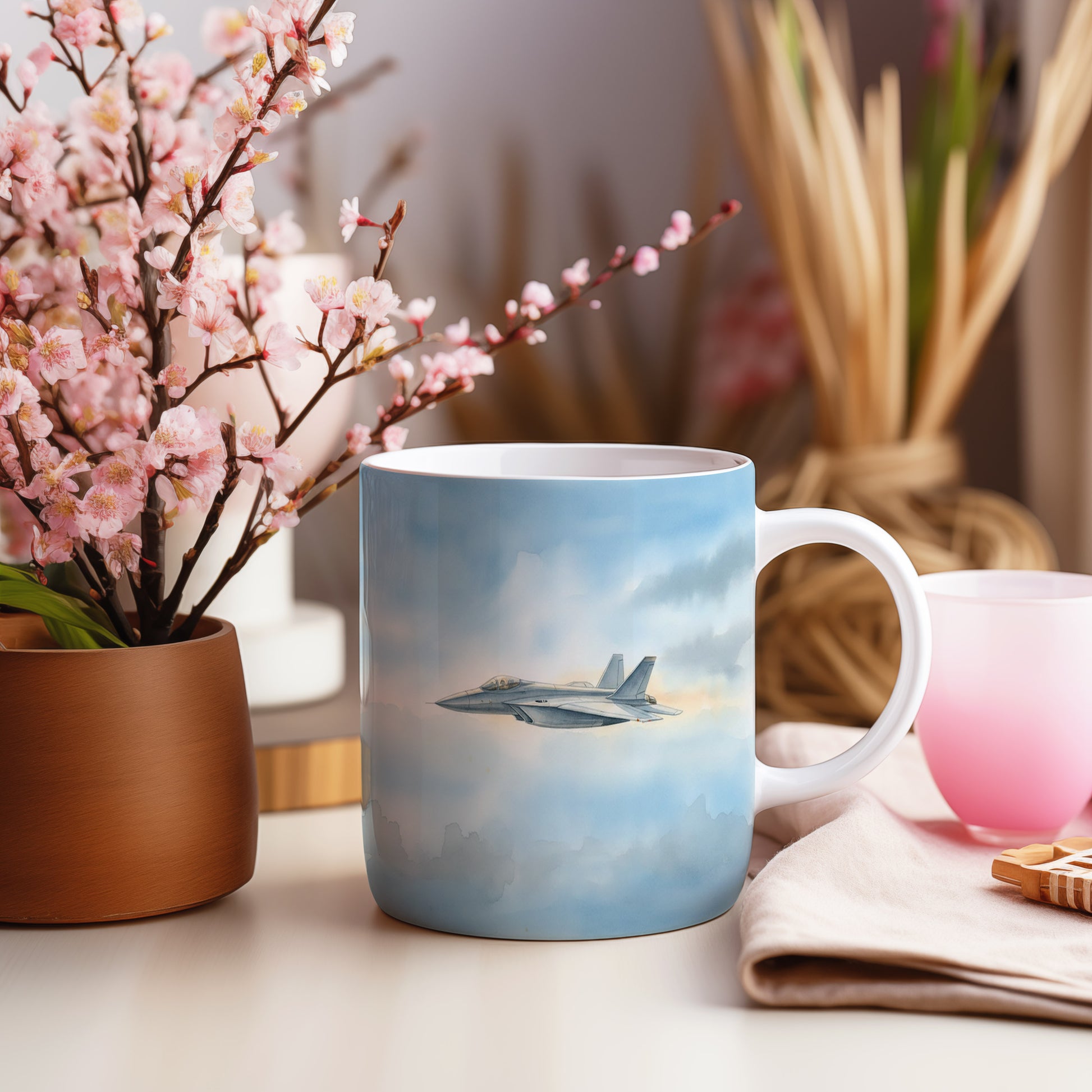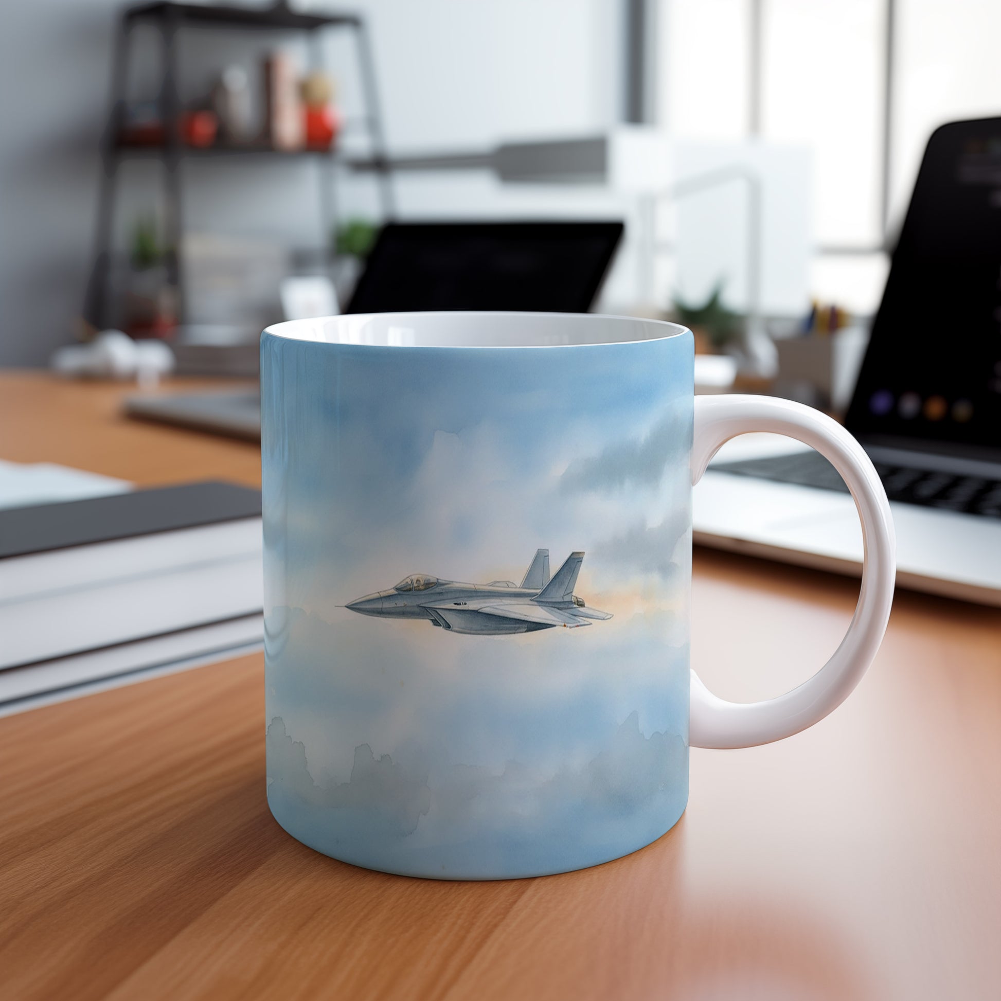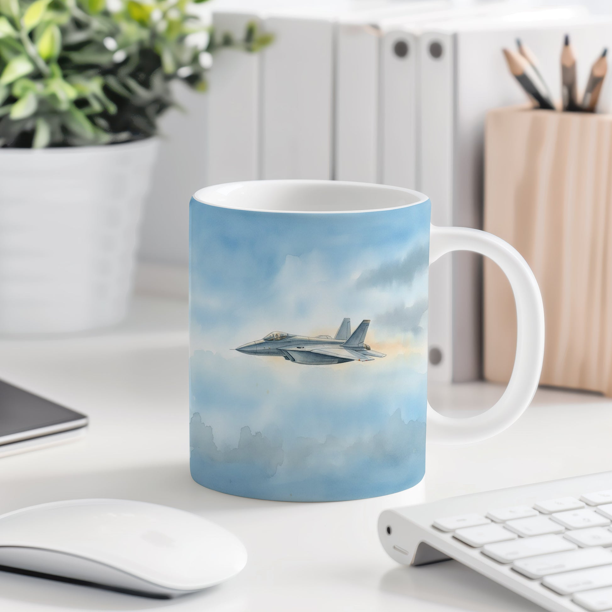 Elegantní hrnek s akvarelovým motivem tryskáče letícího v modrém nebi. Ideální pro milovníky letectví.