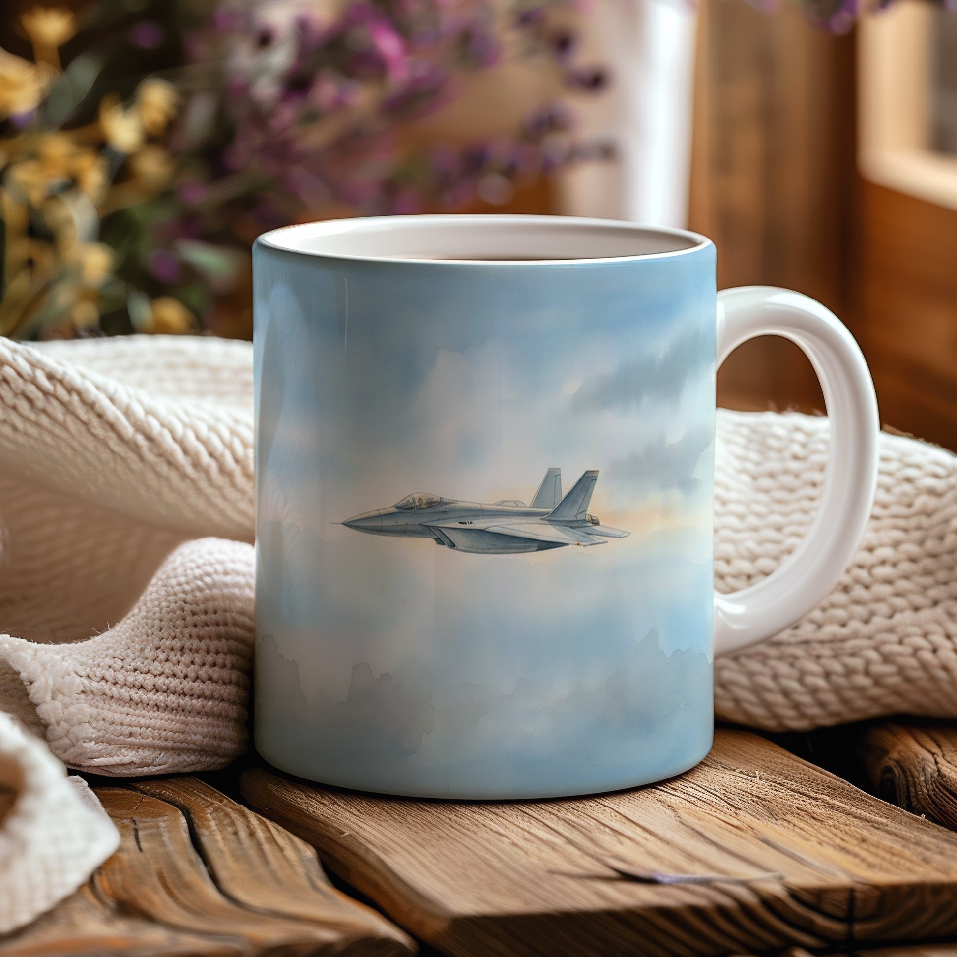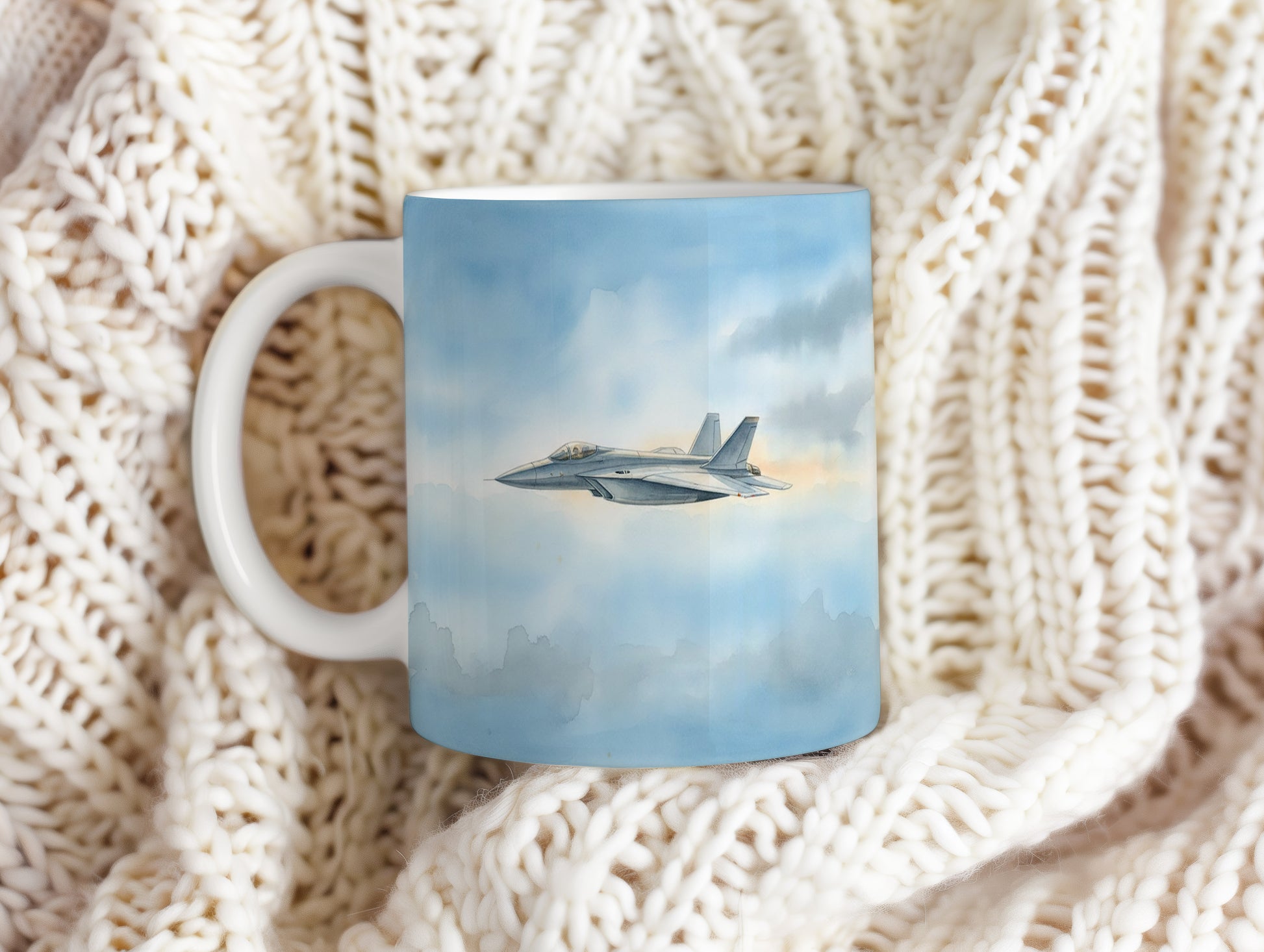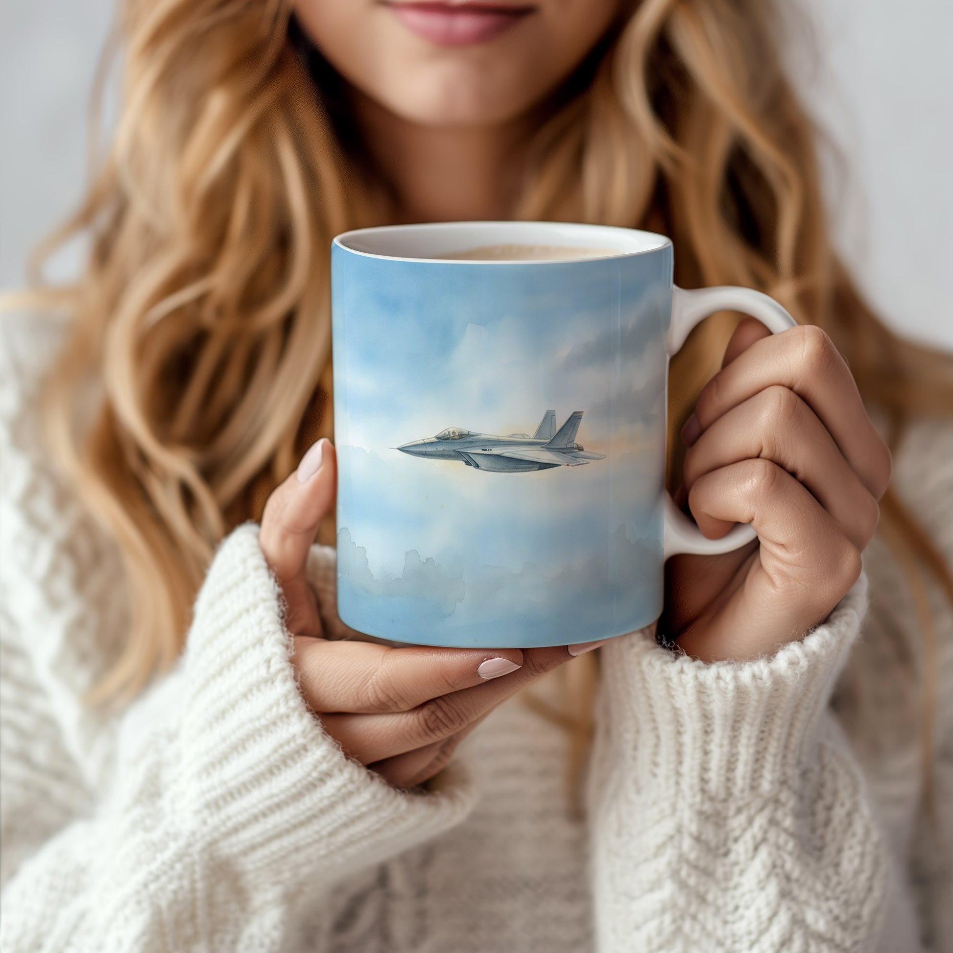 Elegantní hrnek s akvarelovým motivem tryskáče letícího v modrém nebi. Ideální pro milovníky letectví.