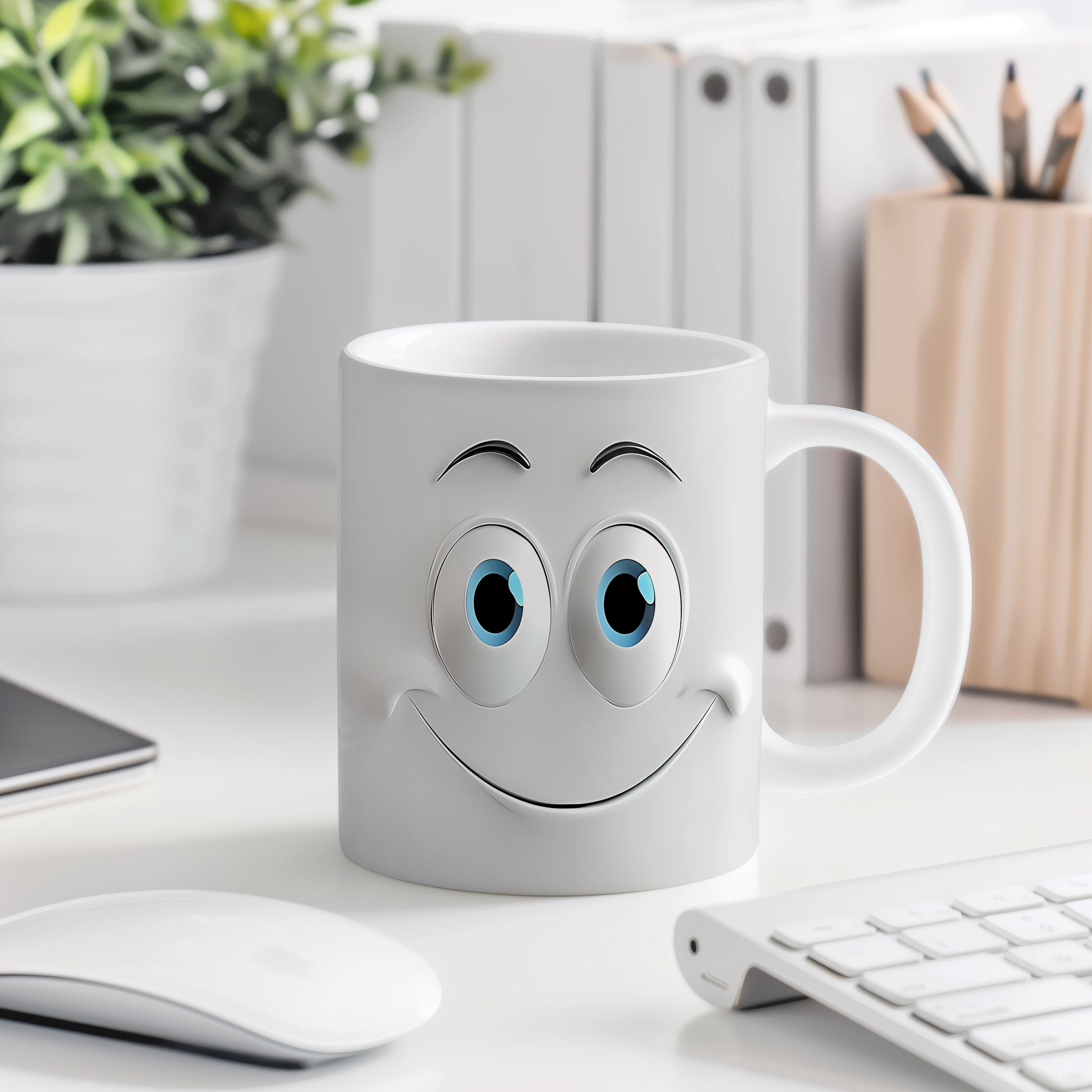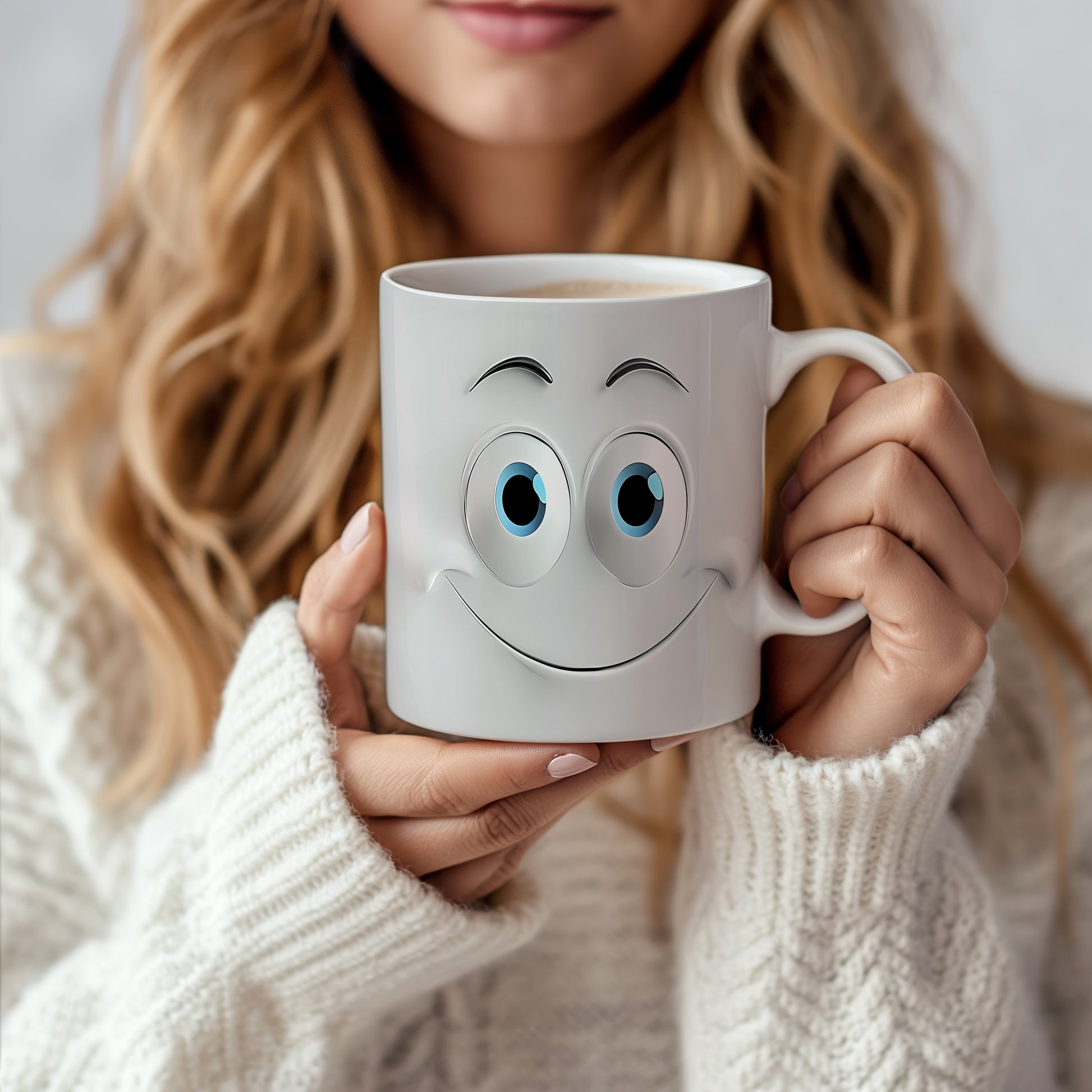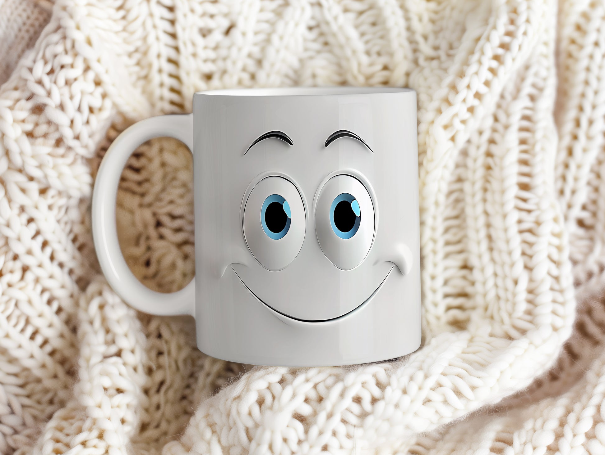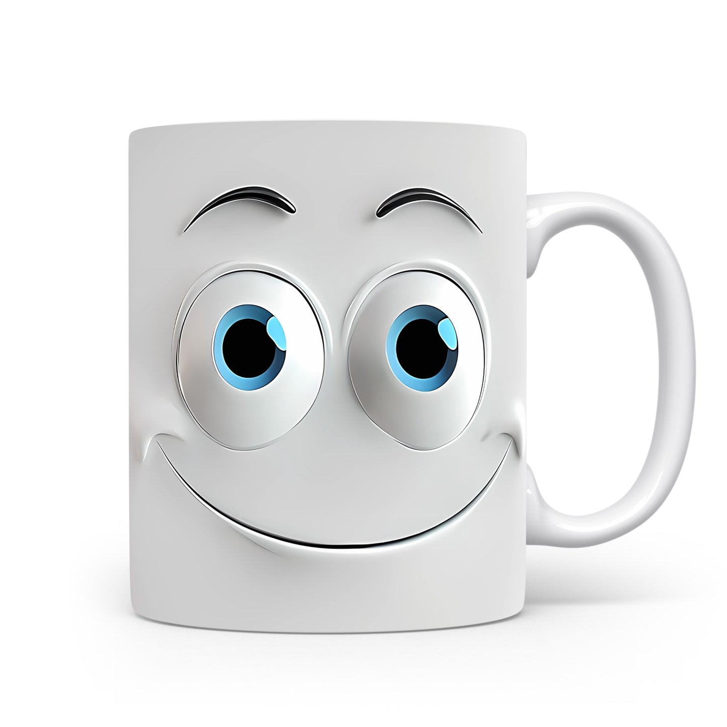 Hrnek s usměvavým obličejem a modrýma očima – modrýma očima