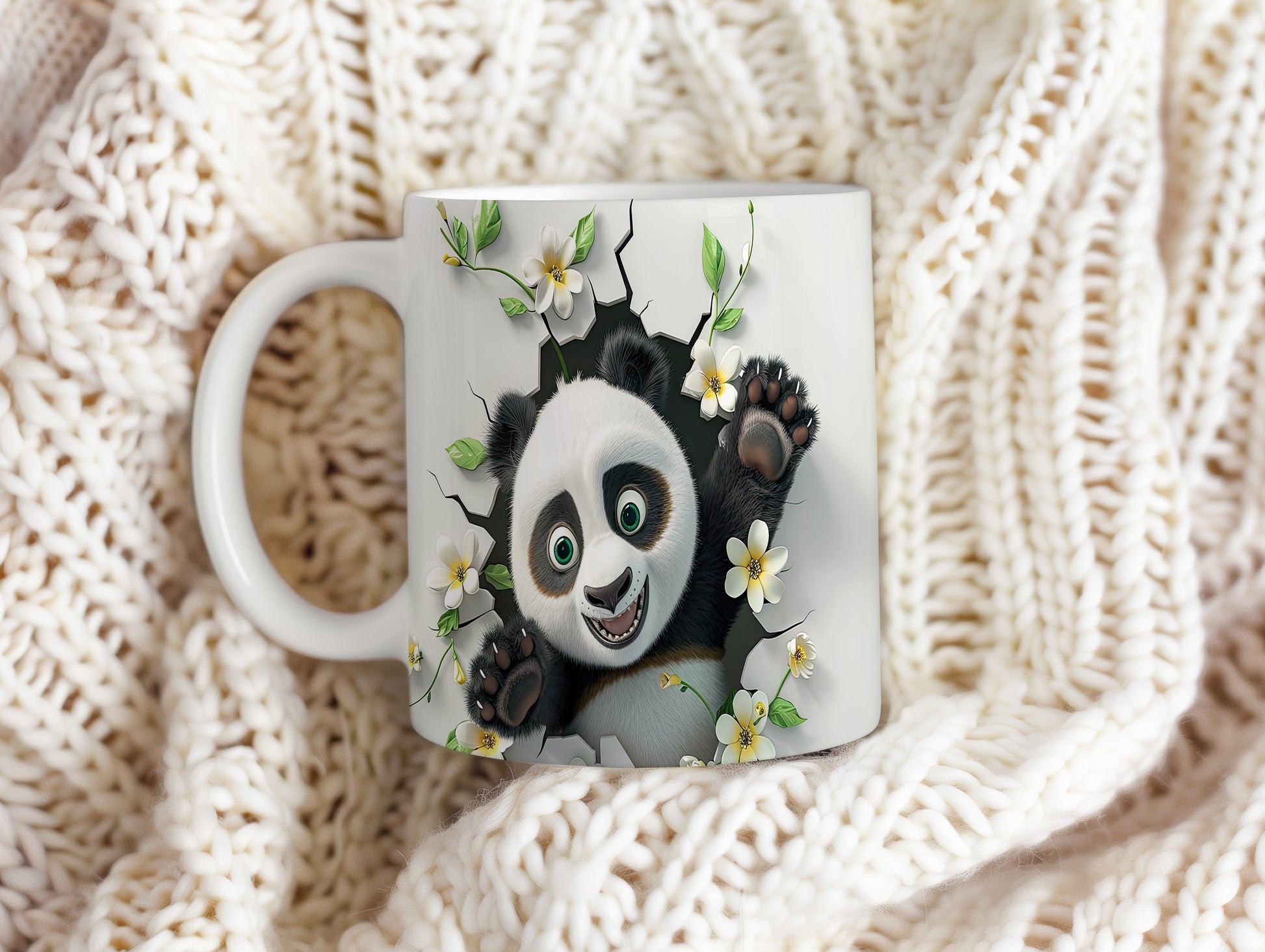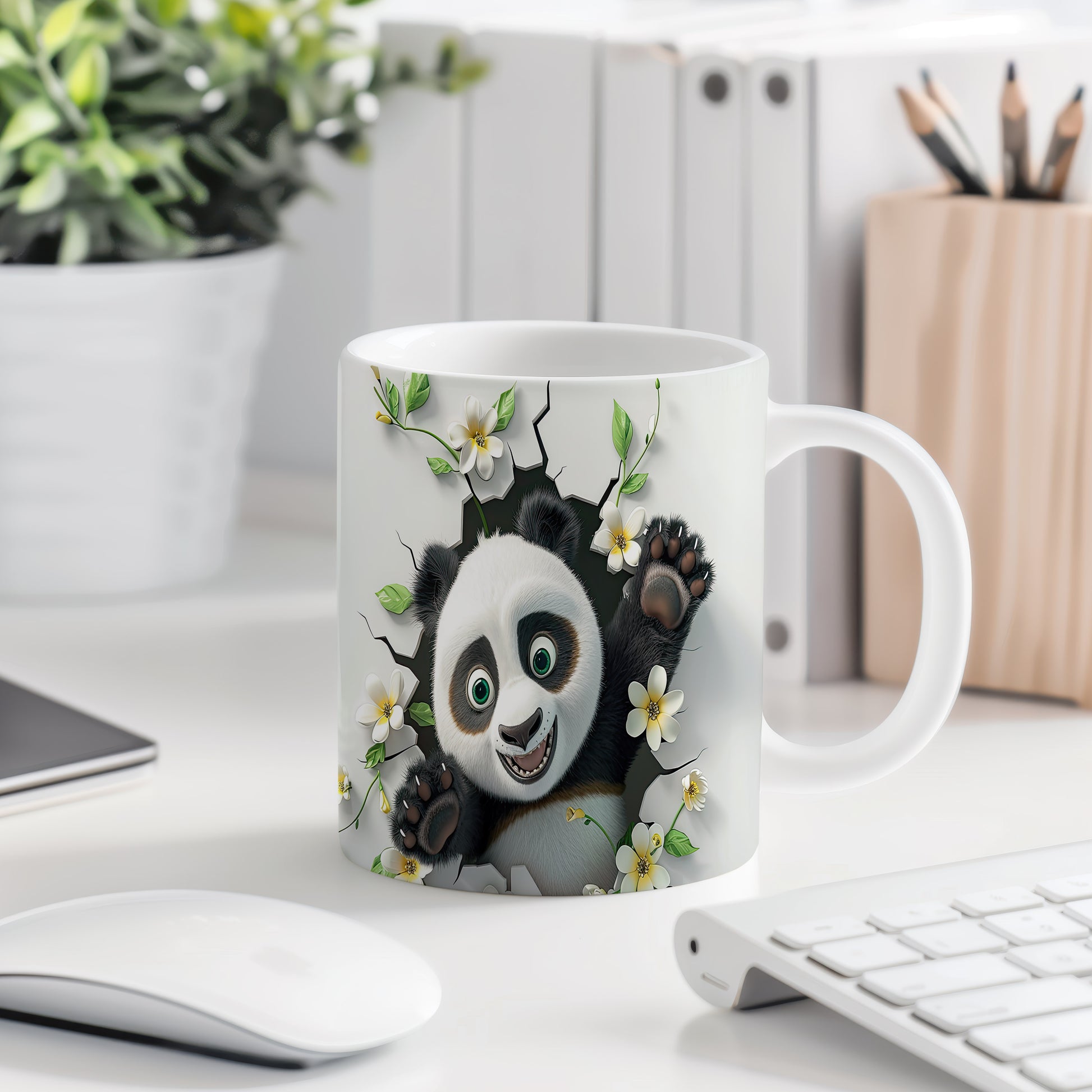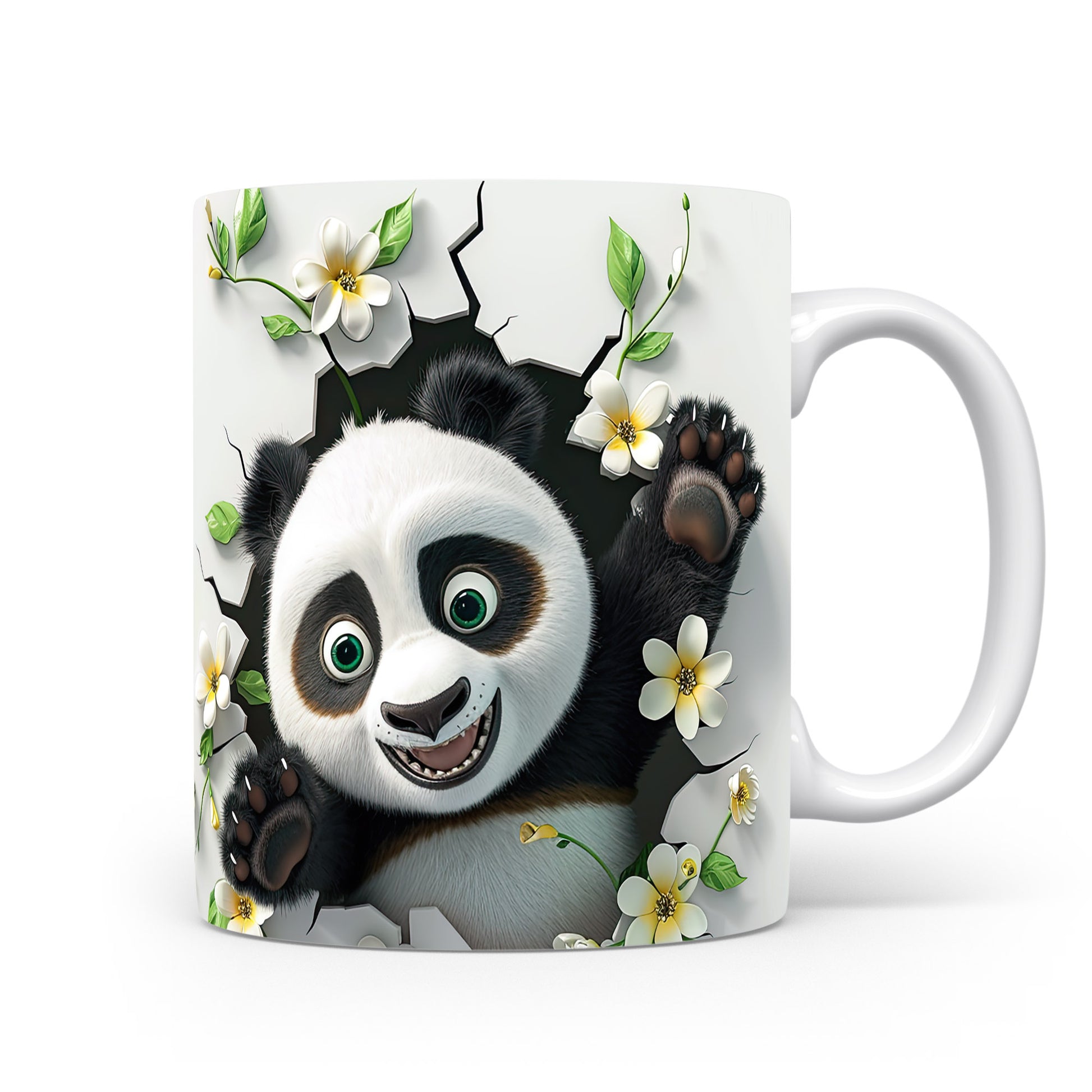 Hrnek s usmívající pandou a květinami v bílých tónech