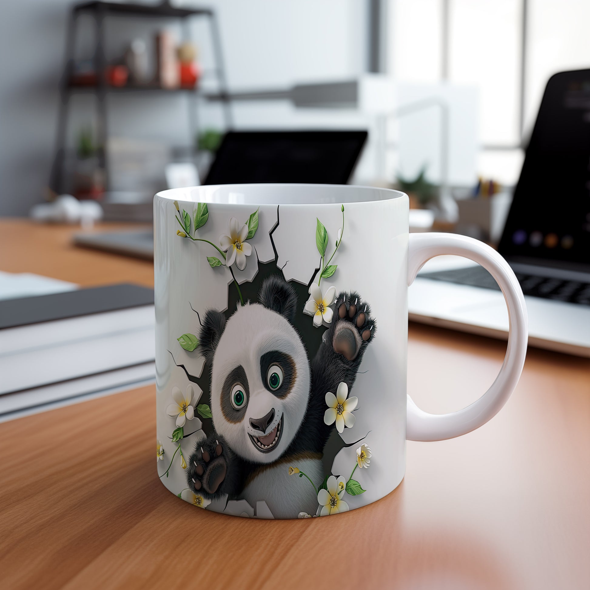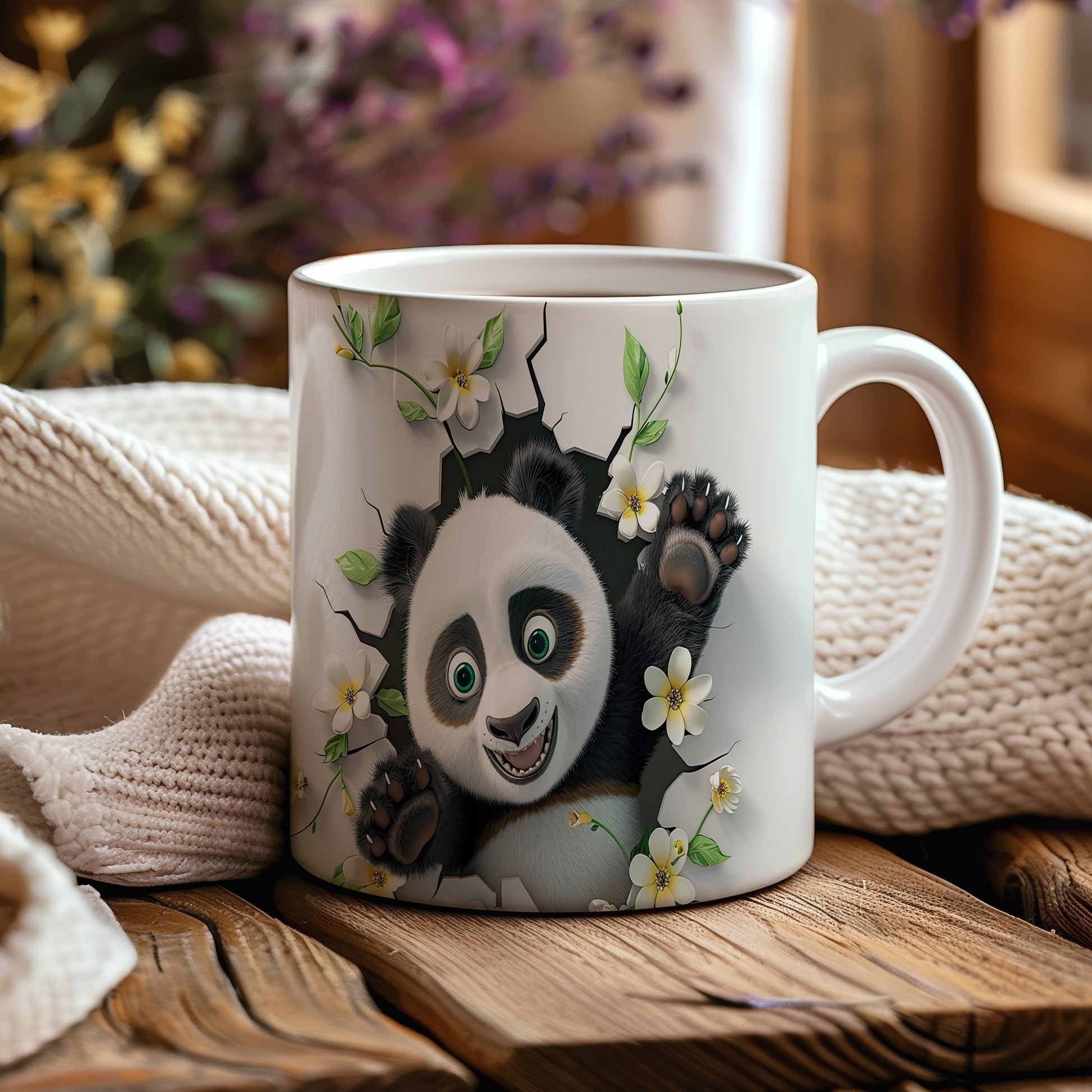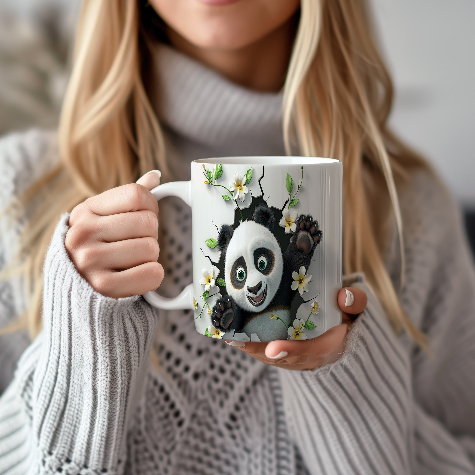 Hrnek s usmívající pandou a květinami v bílých tónech