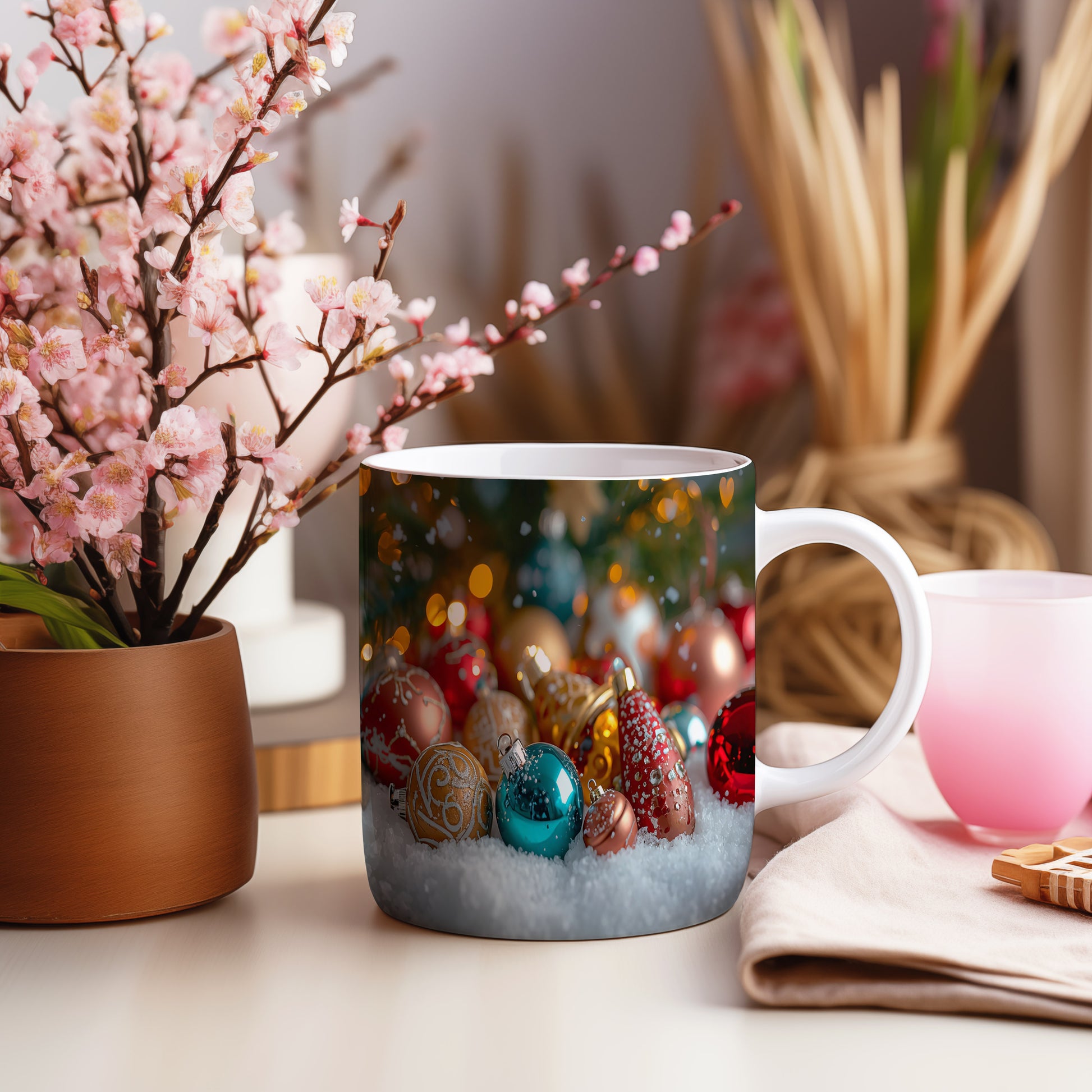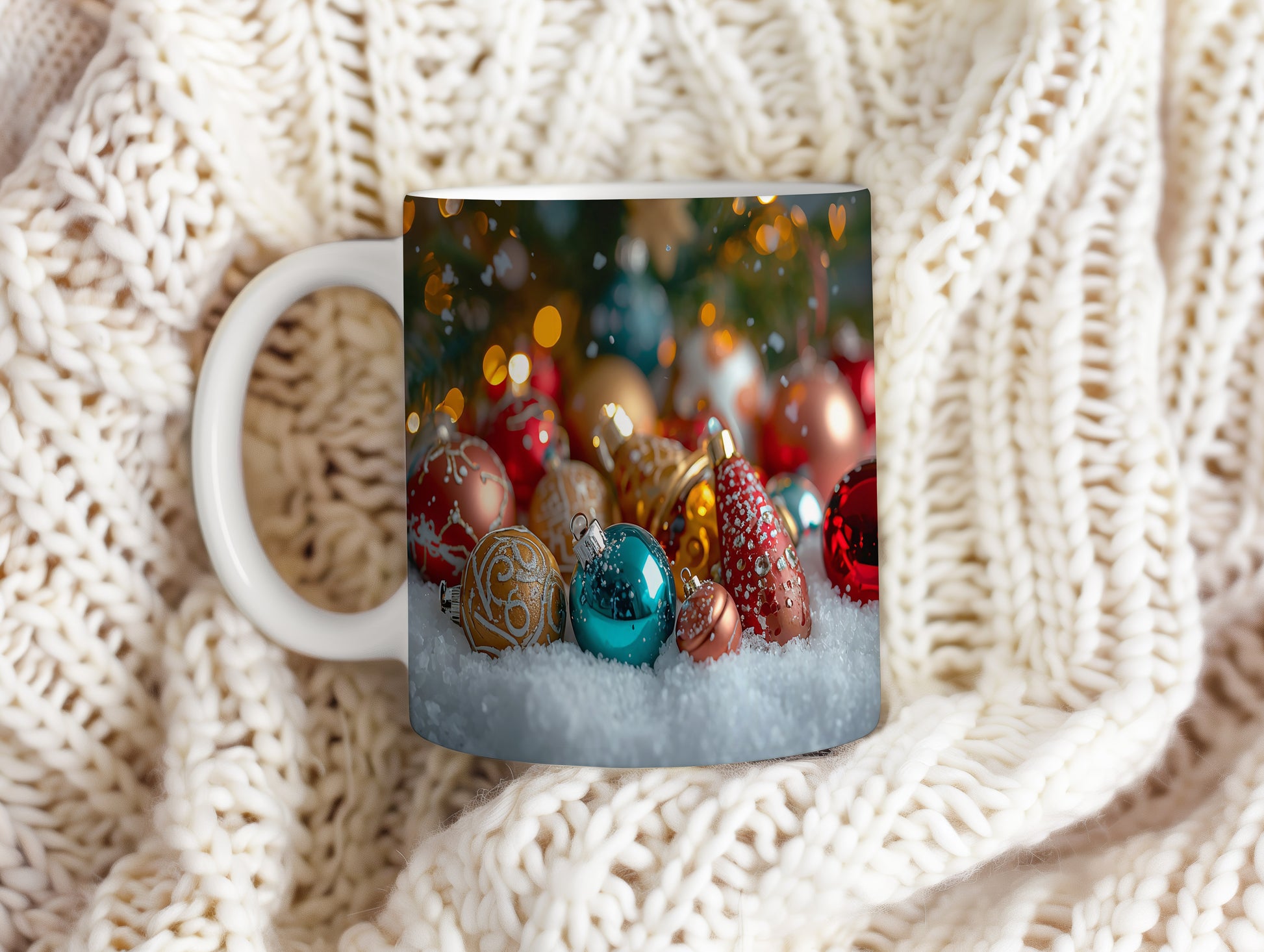 Hrnek s vánočním motivem – barevné ozdoby v sněhu