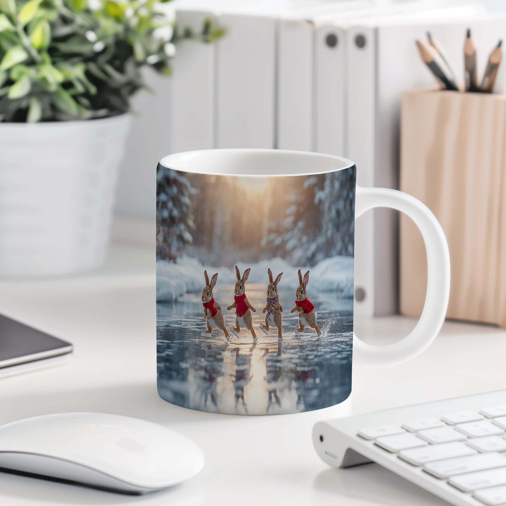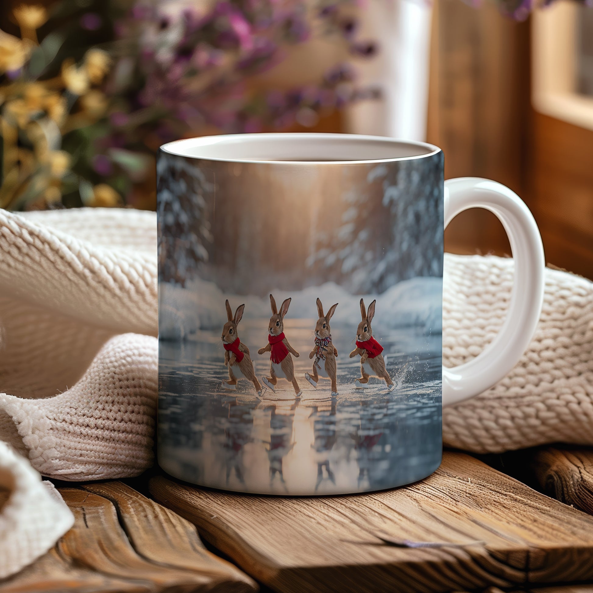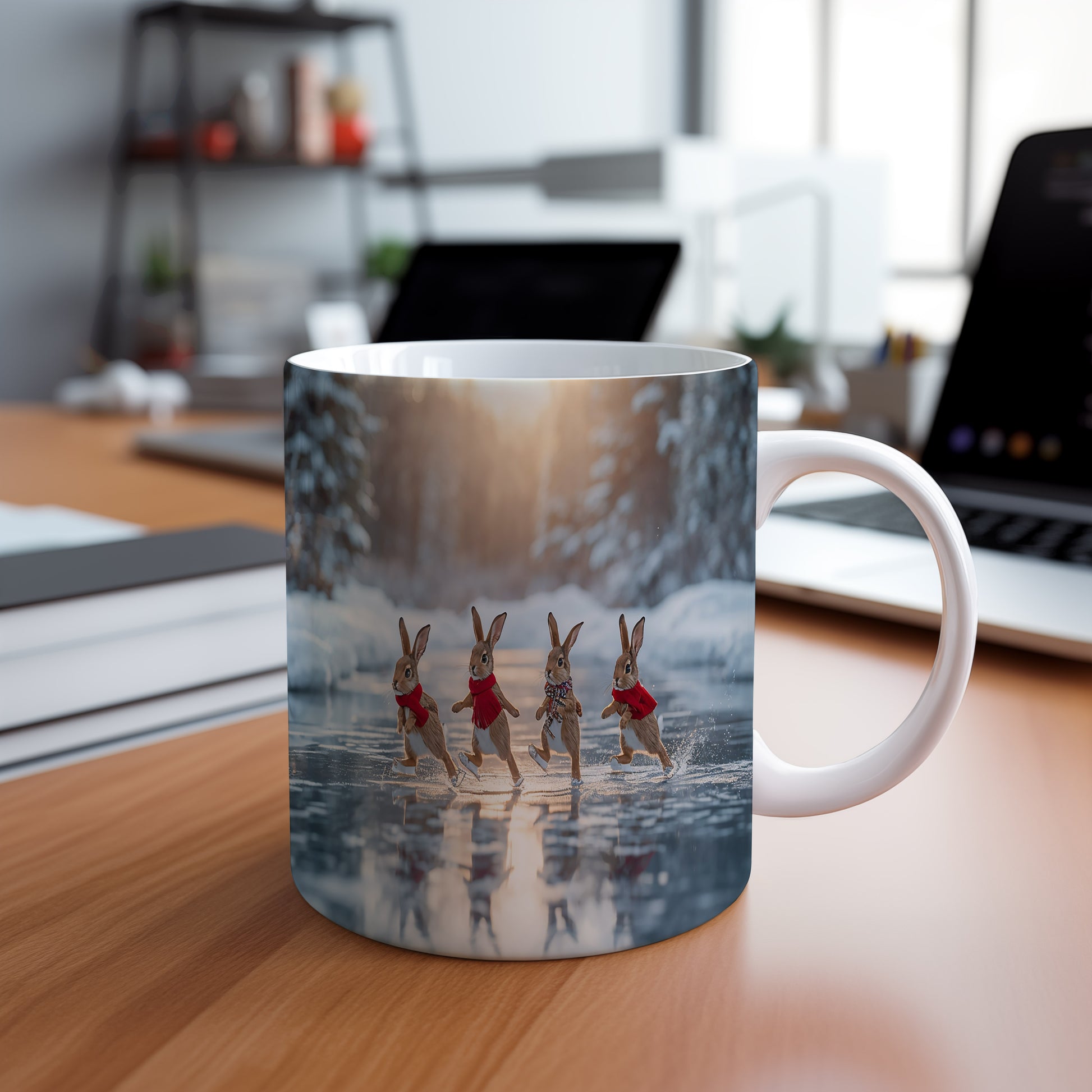 Hrnek zobrazuje čtyři zajíčky v červených šálách, jak bruslí na zamrzlém jezeře. V pozadí je zimní les s jemným světlem zapadajícího slunce. Hrnek 330ml – vhodný do myčky i mikrovlnky.
