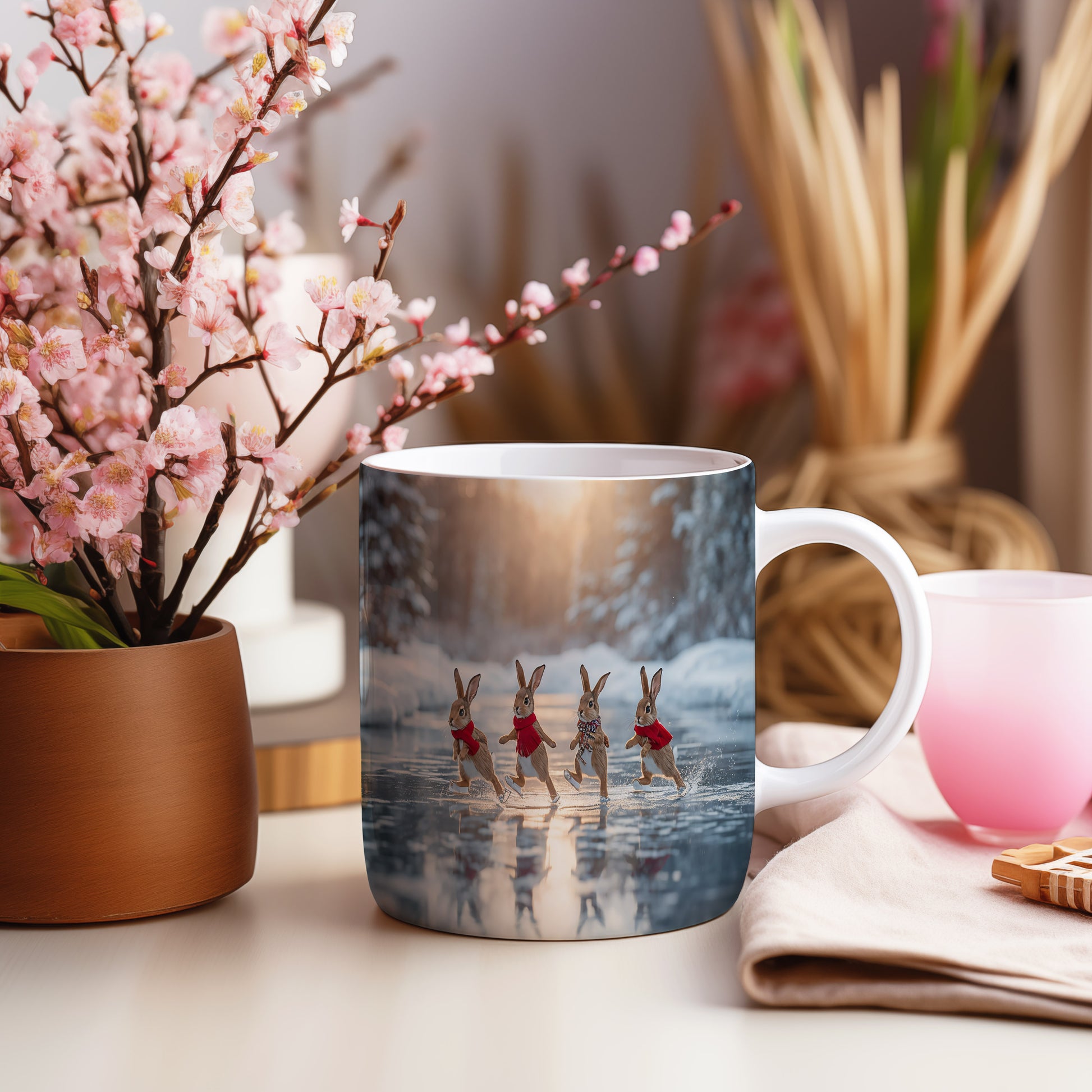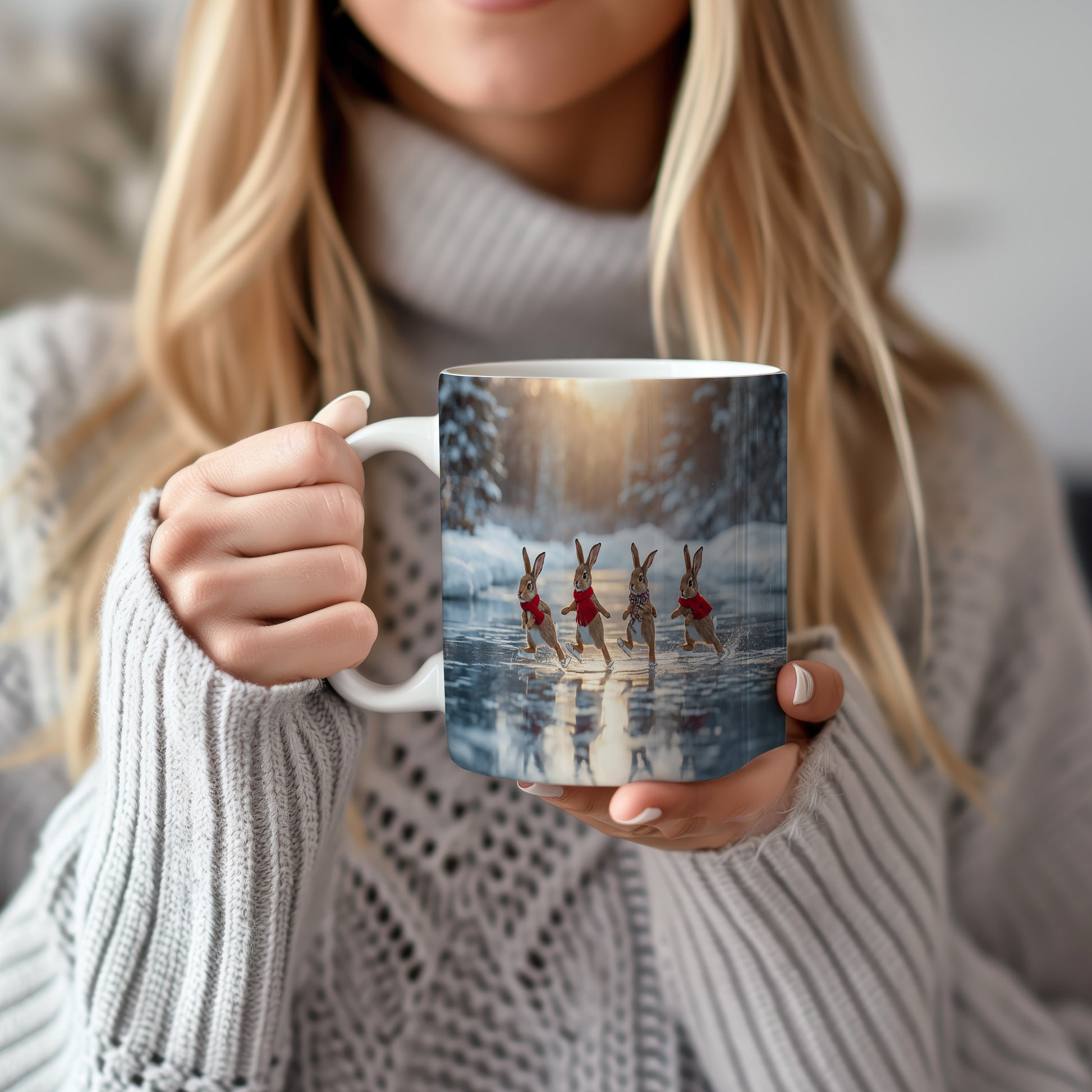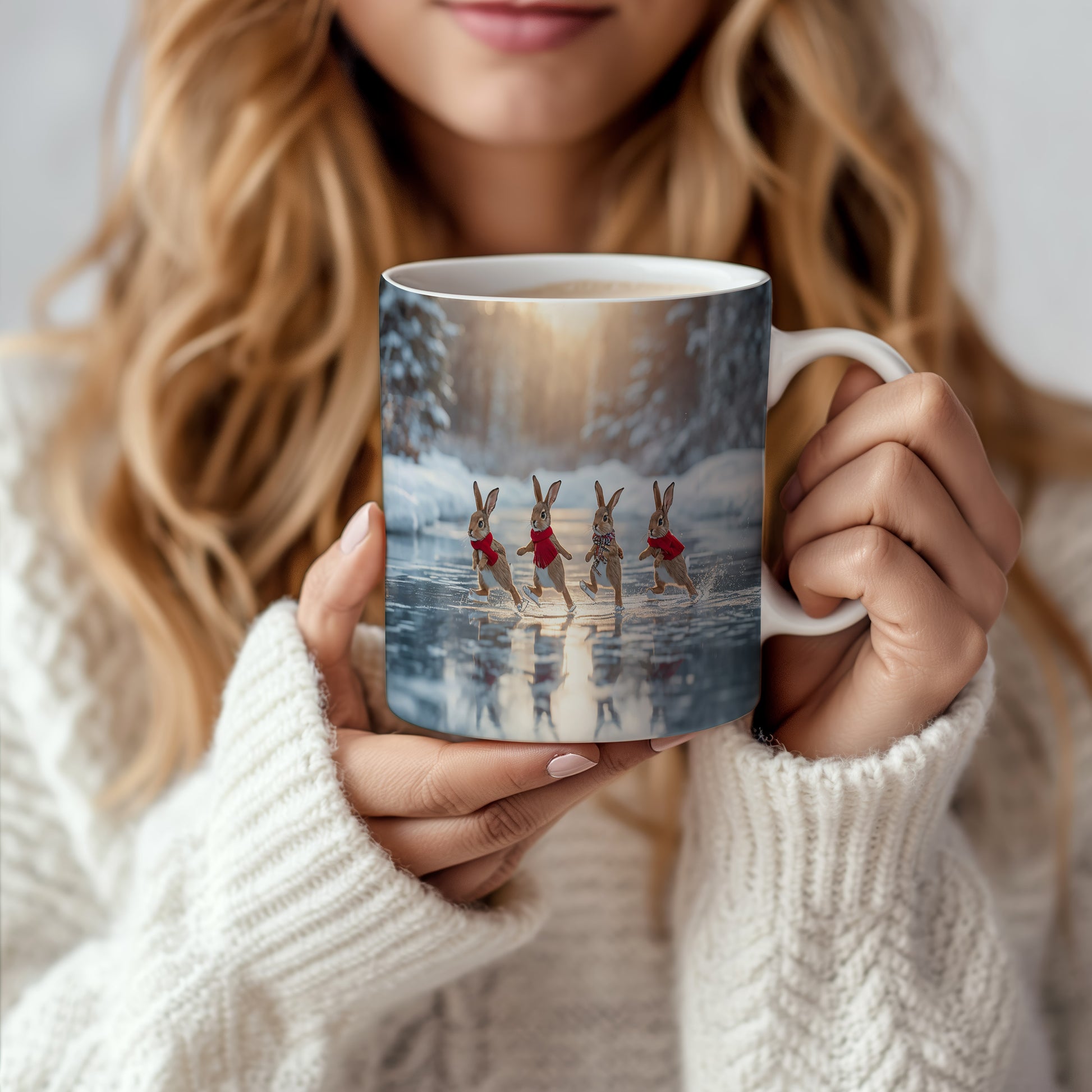 Hrnek zobrazuje čtyři zajíčky v červených šálách, jak bruslí na zamrzlém jezeře. V pozadí je zimní les s jemným světlem zapadajícího slunce. Hrnek 330ml – vhodný do myčky i mikrovlnky.