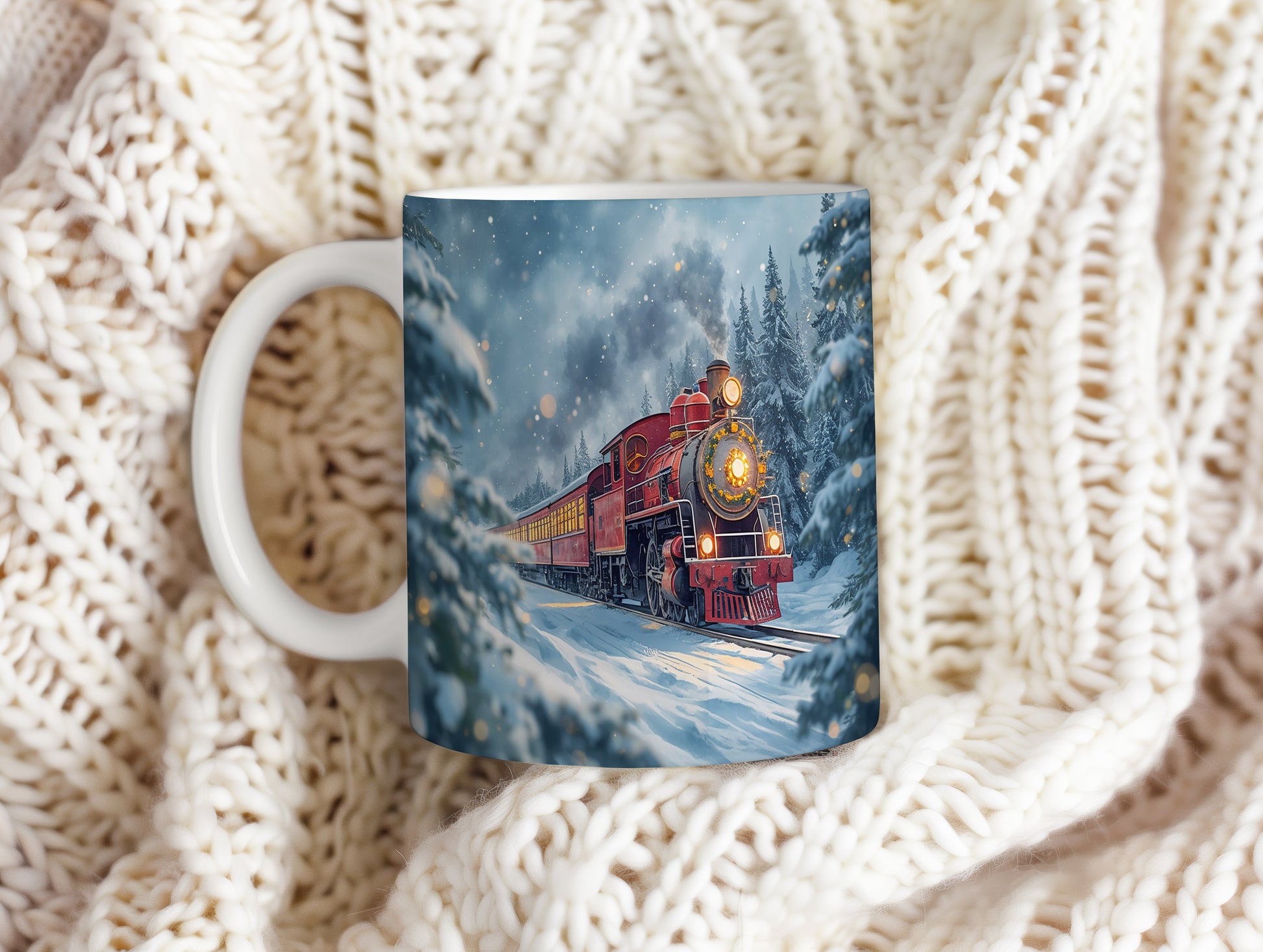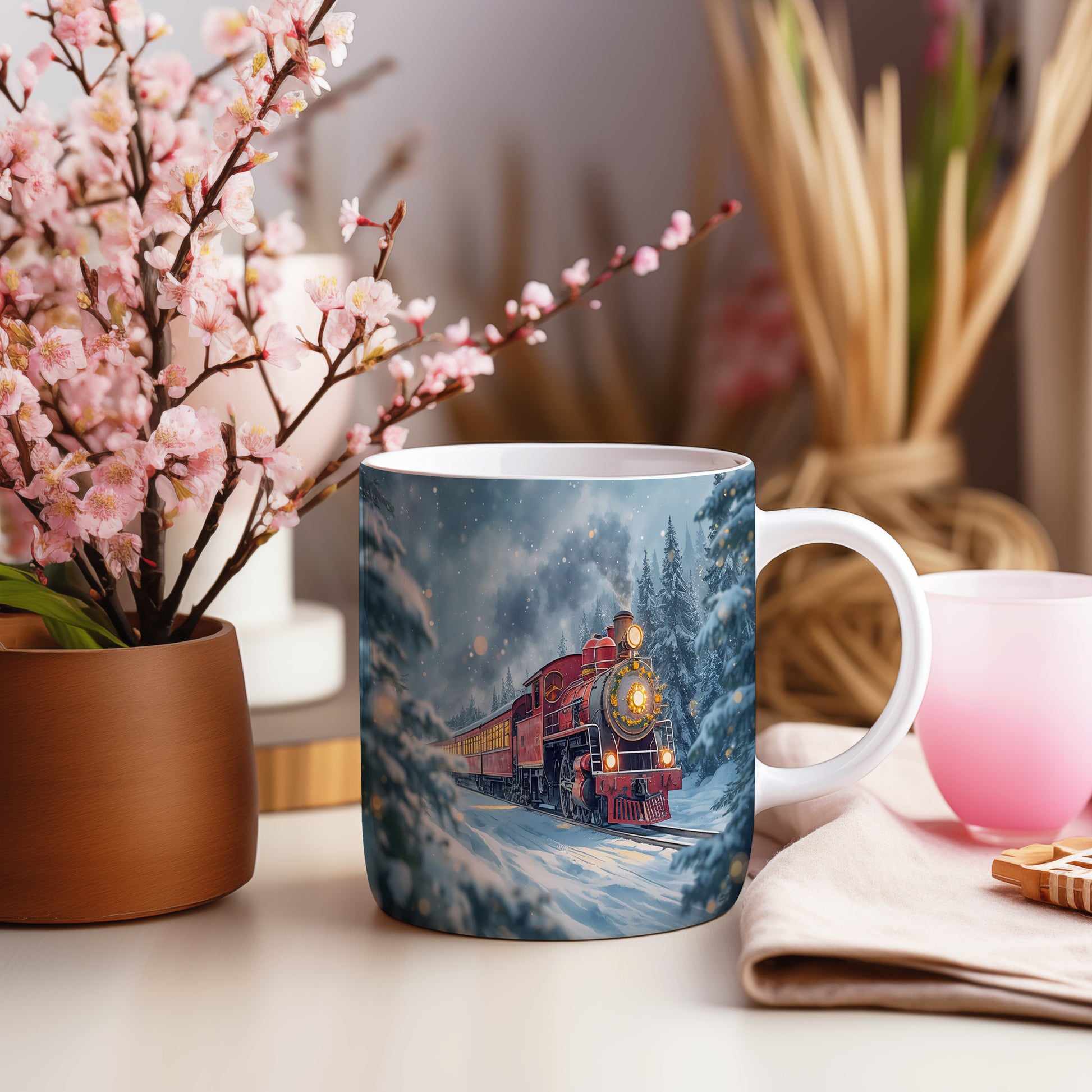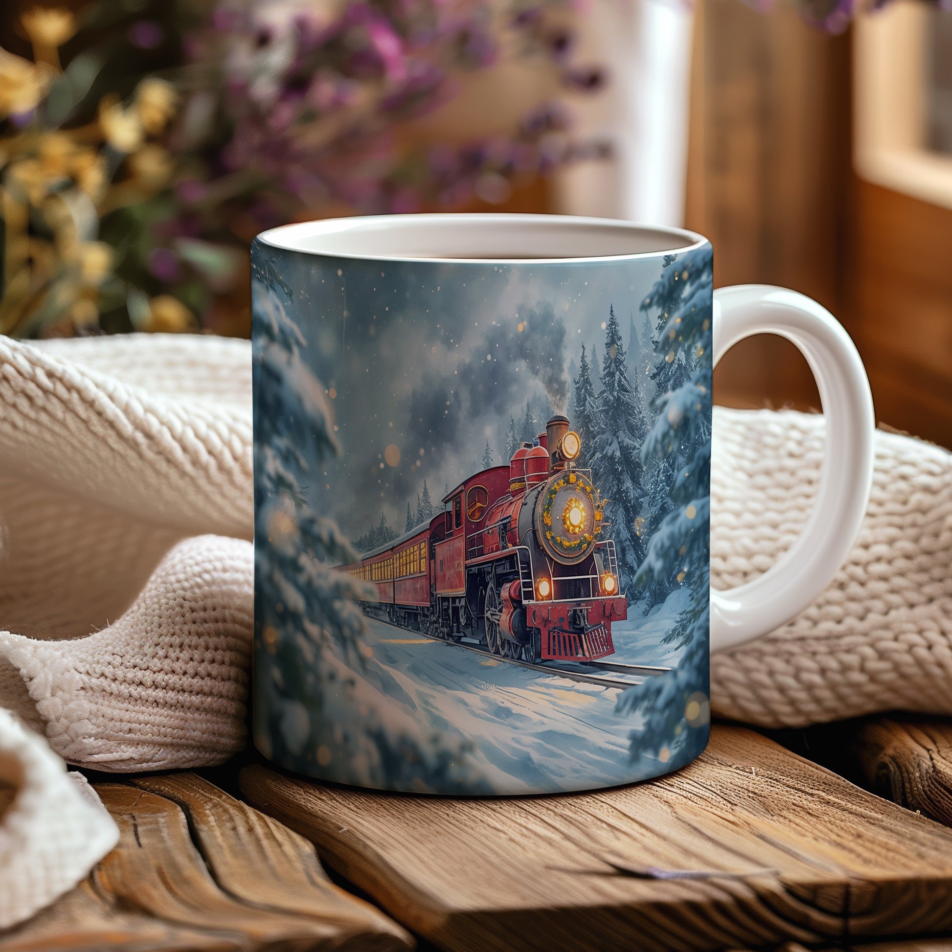Na hrnku je červená lokomotiva projíždějící zasněženou krajinou, obklopená padajícími sněhovými vločkami. Hrnek 330ml – vhodný do myčky i mikrovlnky.