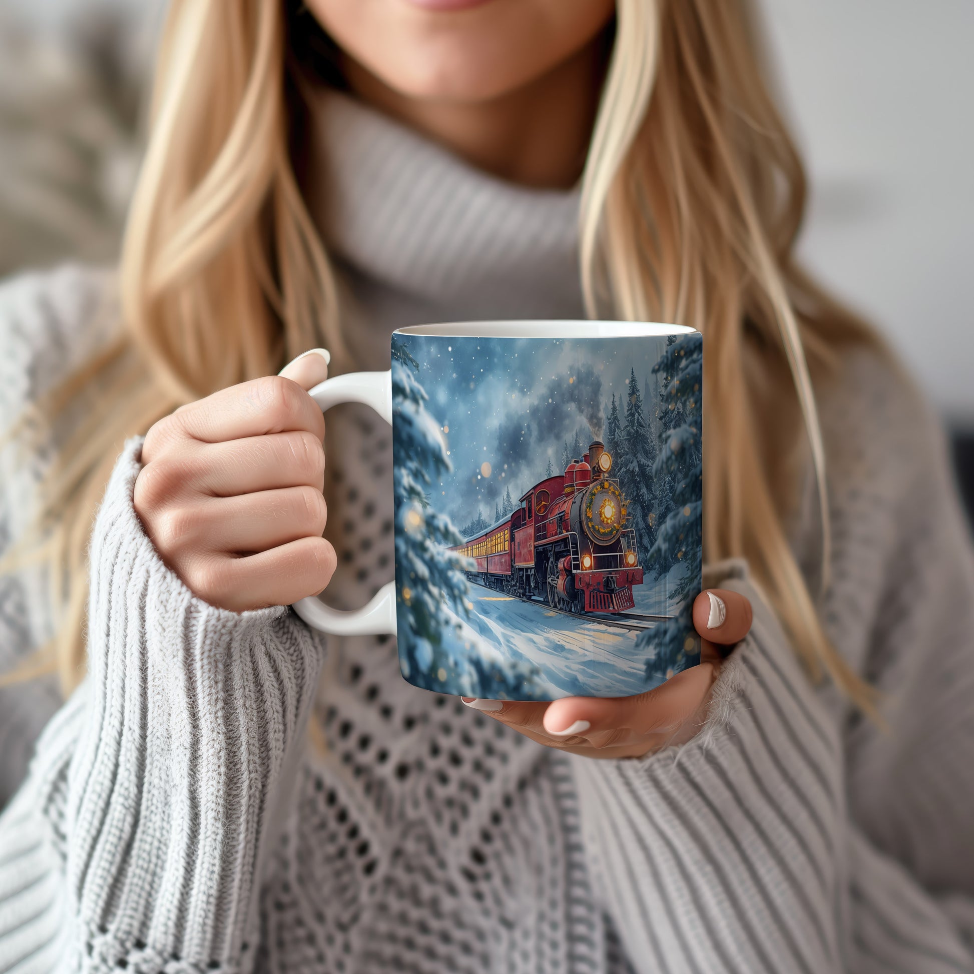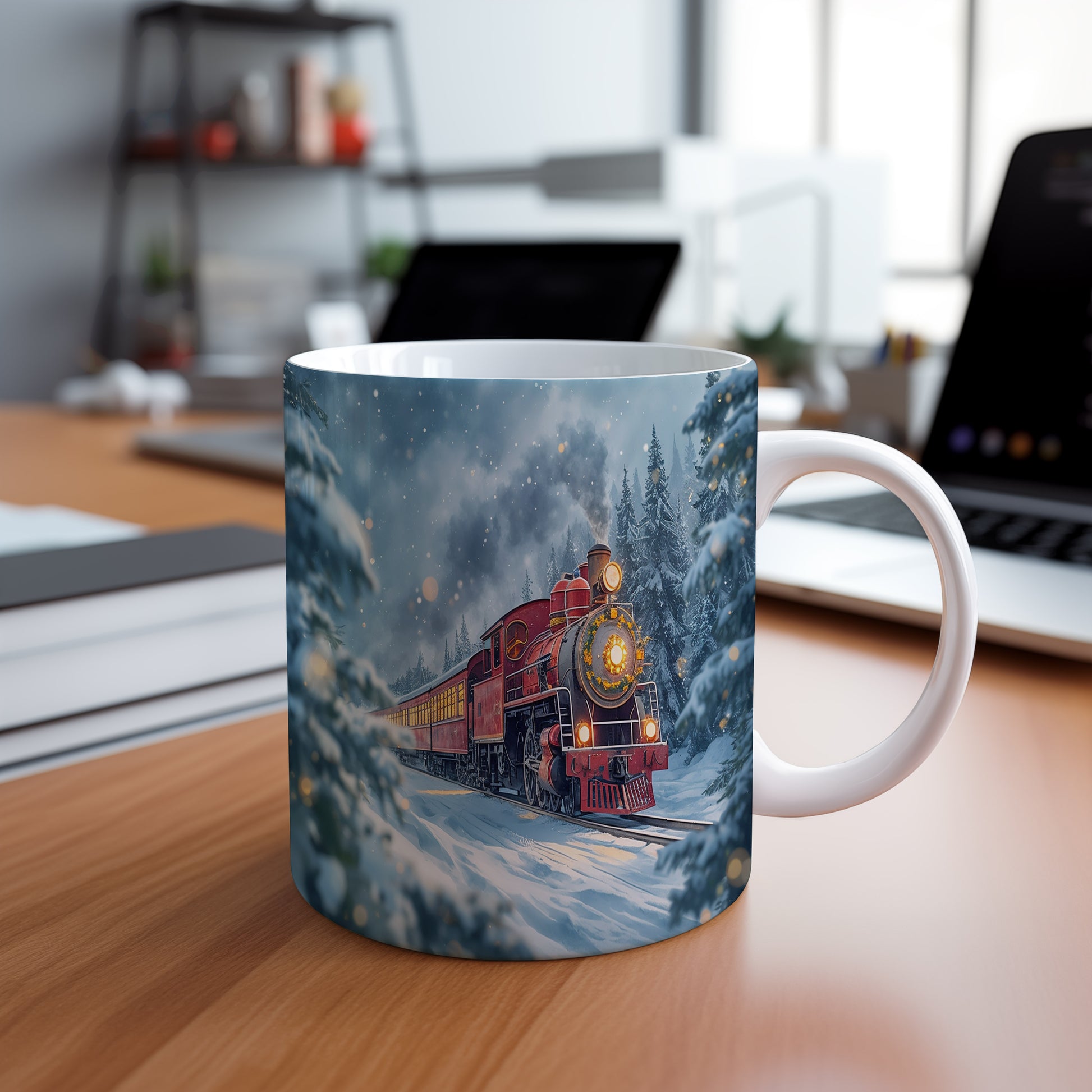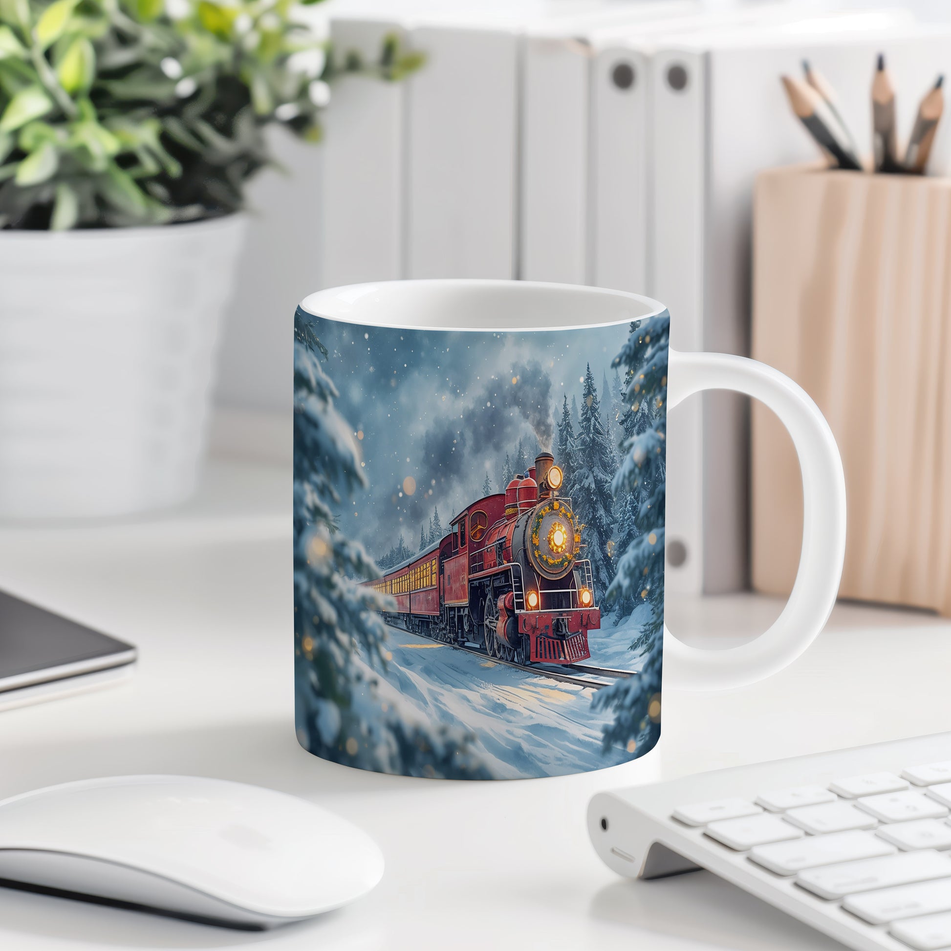 Na hrnku je červená lokomotiva projíždějící zasněženou krajinou, obklopená padajícími sněhovými vločkami. Hrnek 330ml – vhodný do myčky i mikrovlnky.