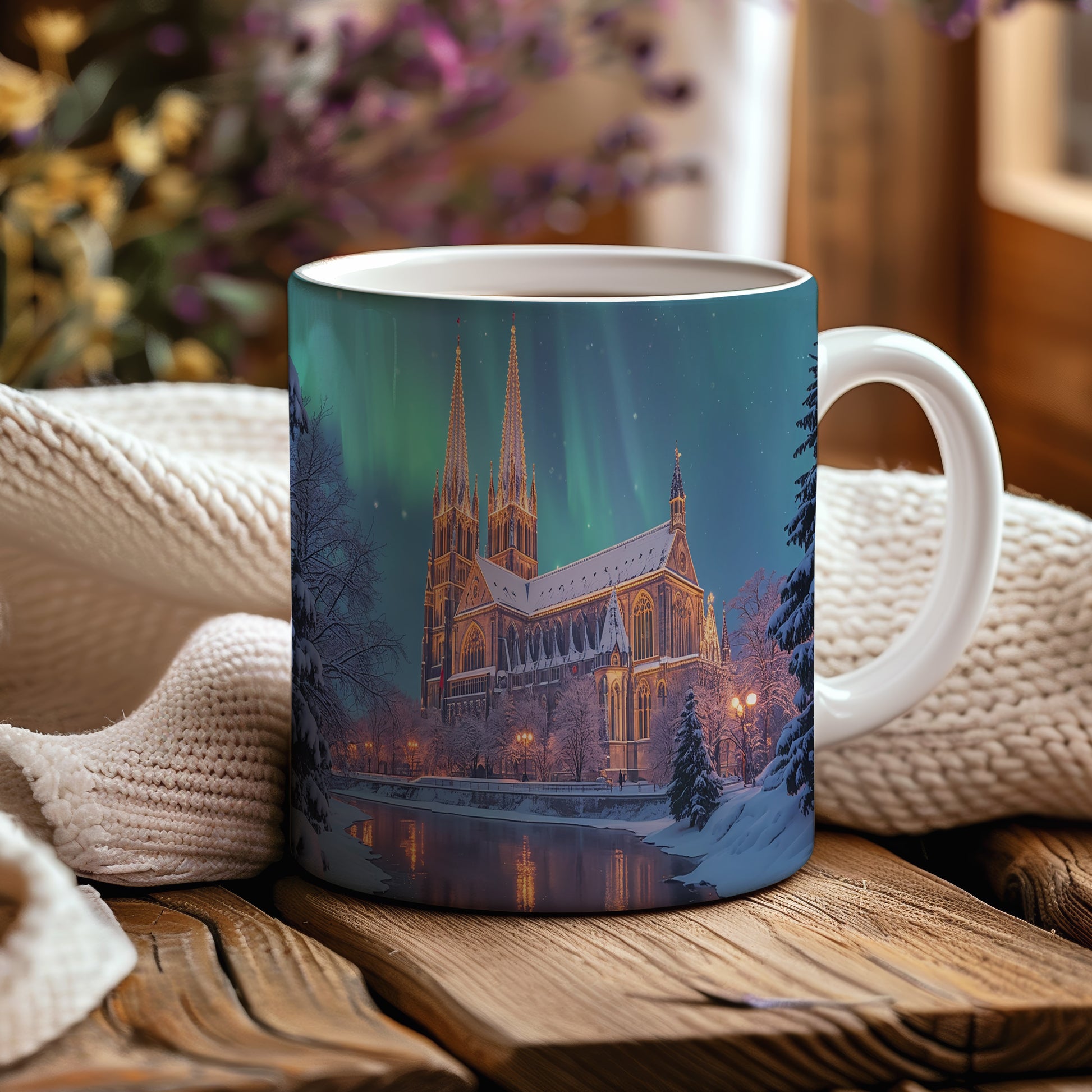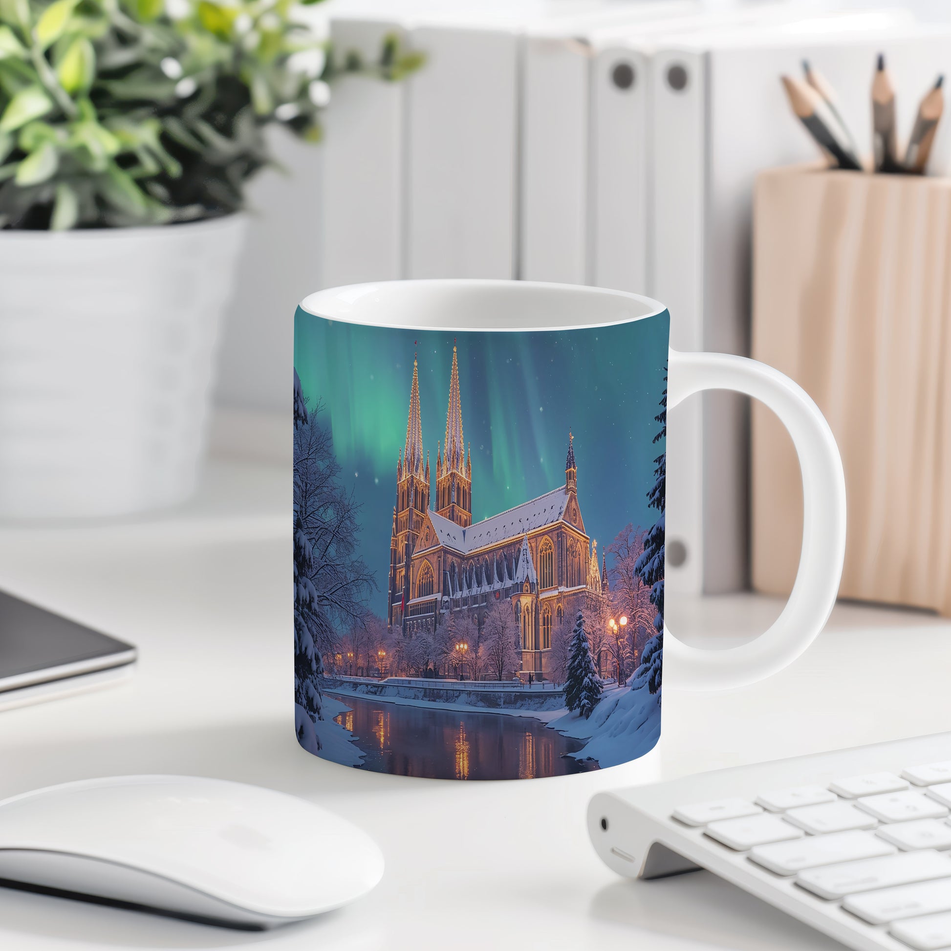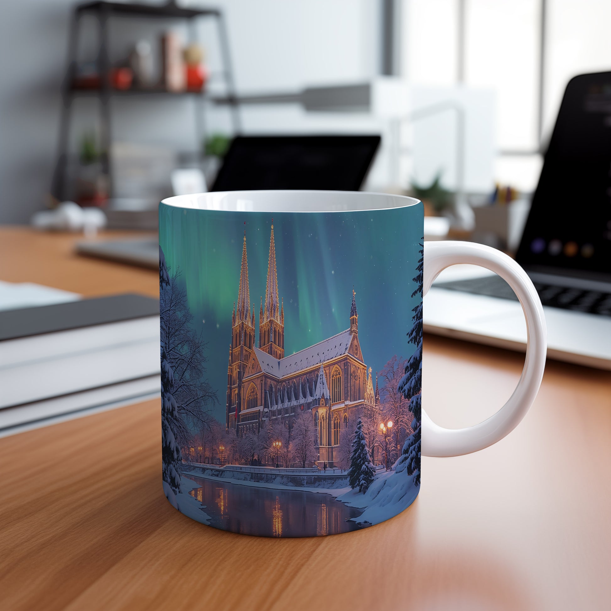 Na hrnku se rozprostírá majestátní katedrála osvětlená polární září, která vytváří pohádkovou atmosféru. Hrnek 330ml – vhodný do myčky i mikrovlnky.