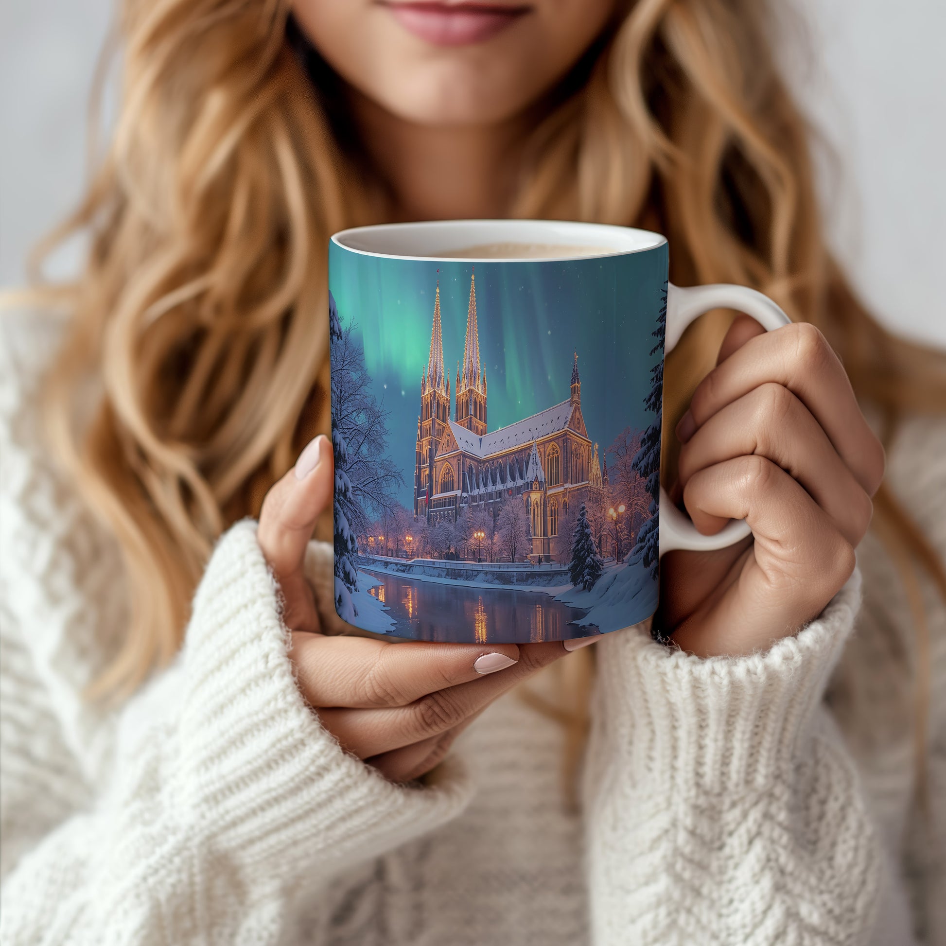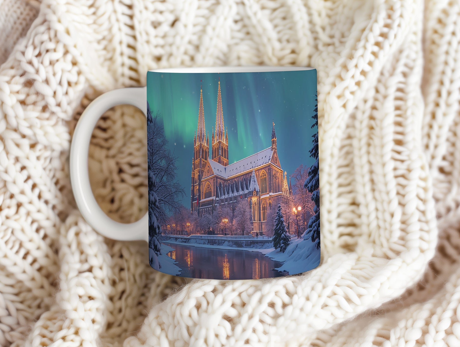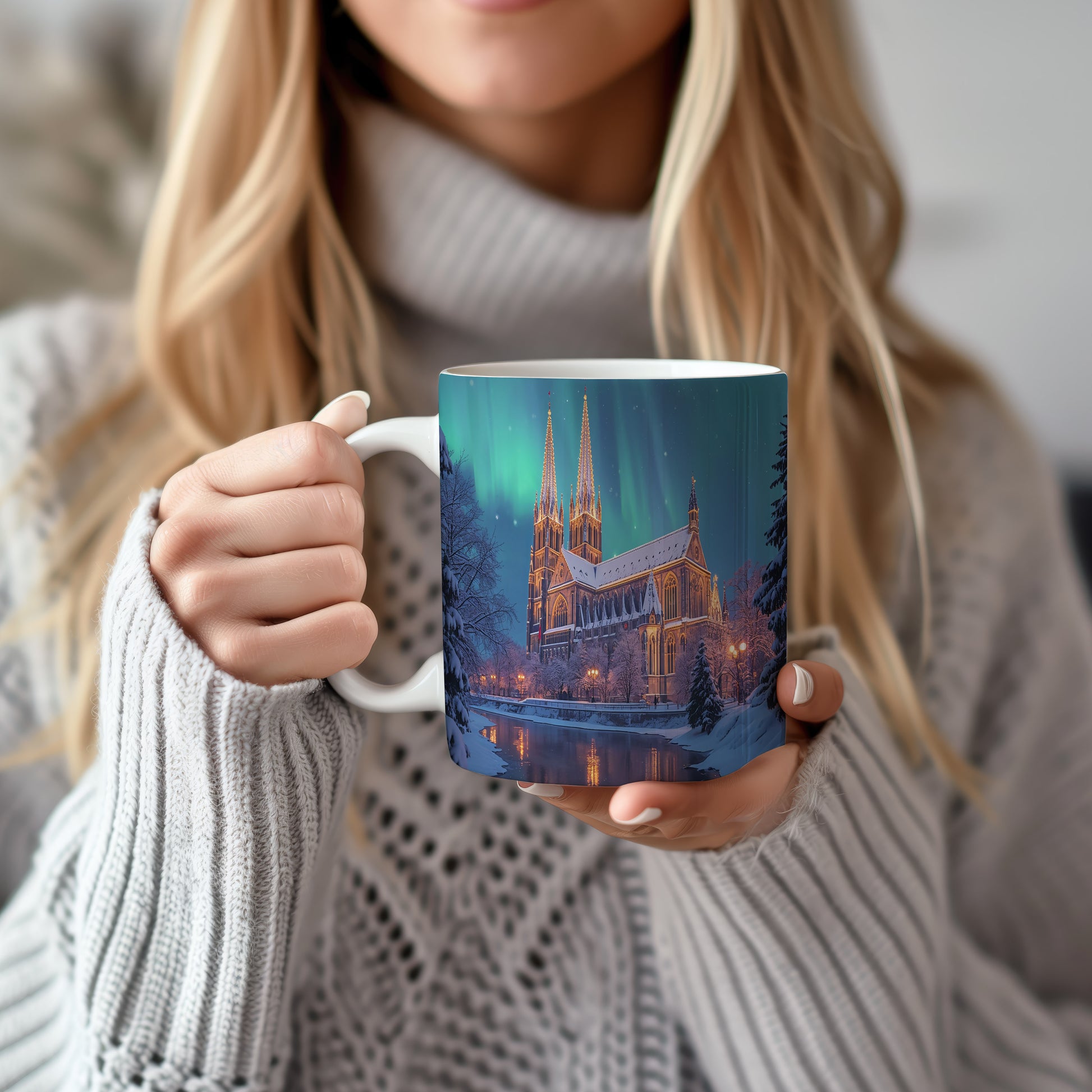 Na hrnku se rozprostírá majestátní katedrála osvětlená polární září, která vytváří pohádkovou atmosféru. Hrnek 330ml – vhodný do myčky i mikrovlnky.